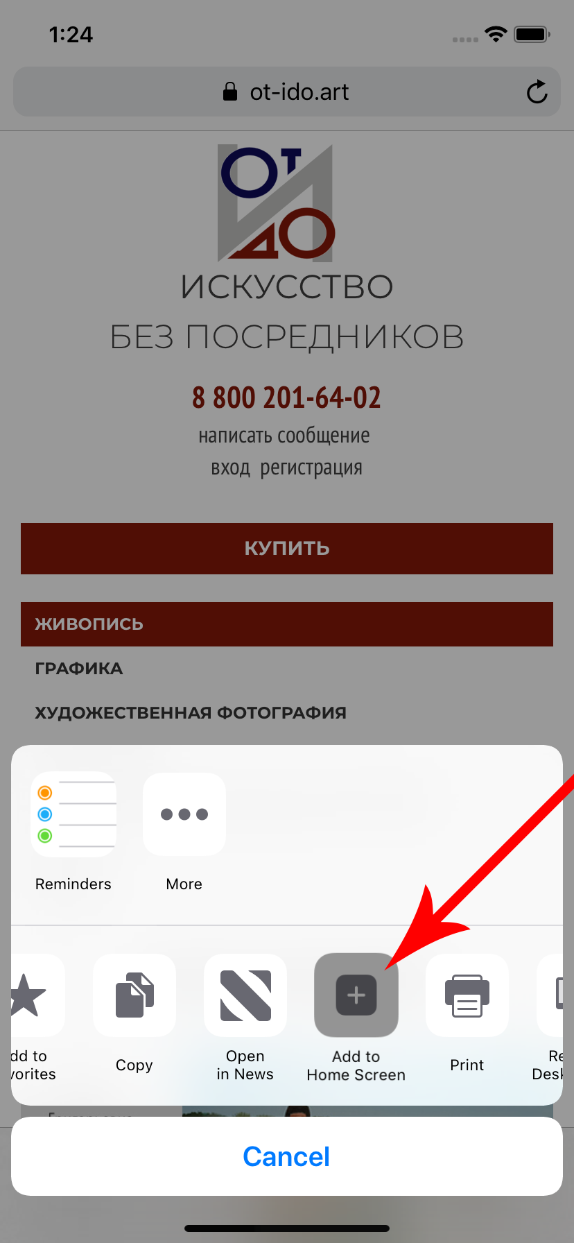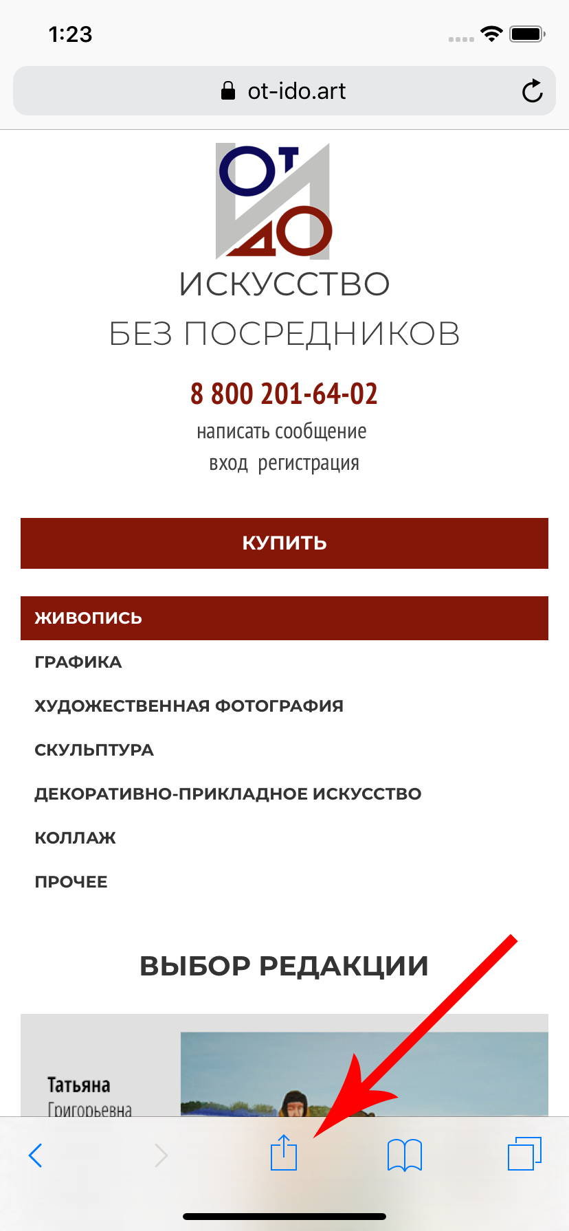 Откройте главную страницу нашего сайта через Safari. Рядом с кнопками перехода «Вперед» и «Назад» нажмите кнопку «Поделиться»
