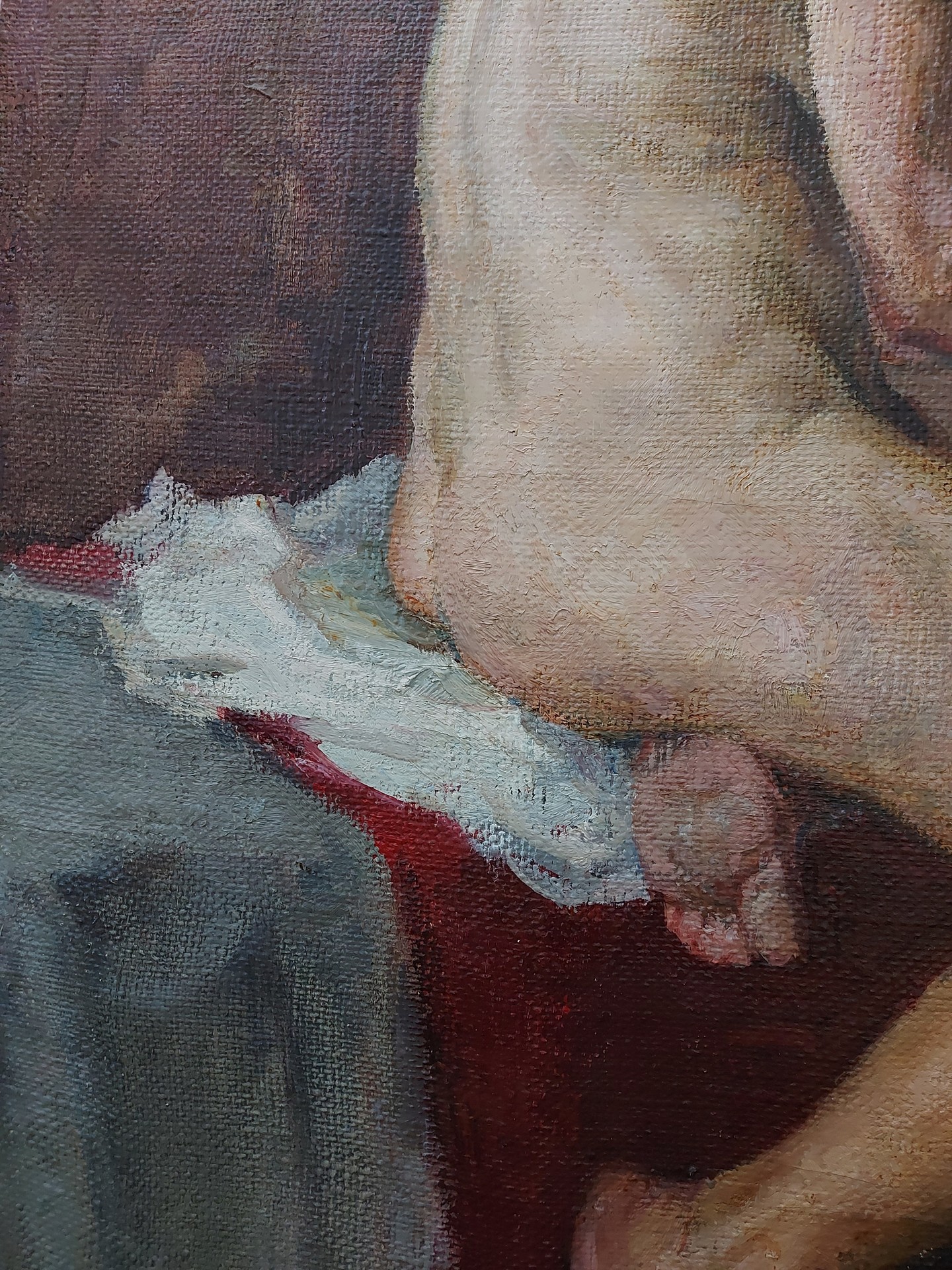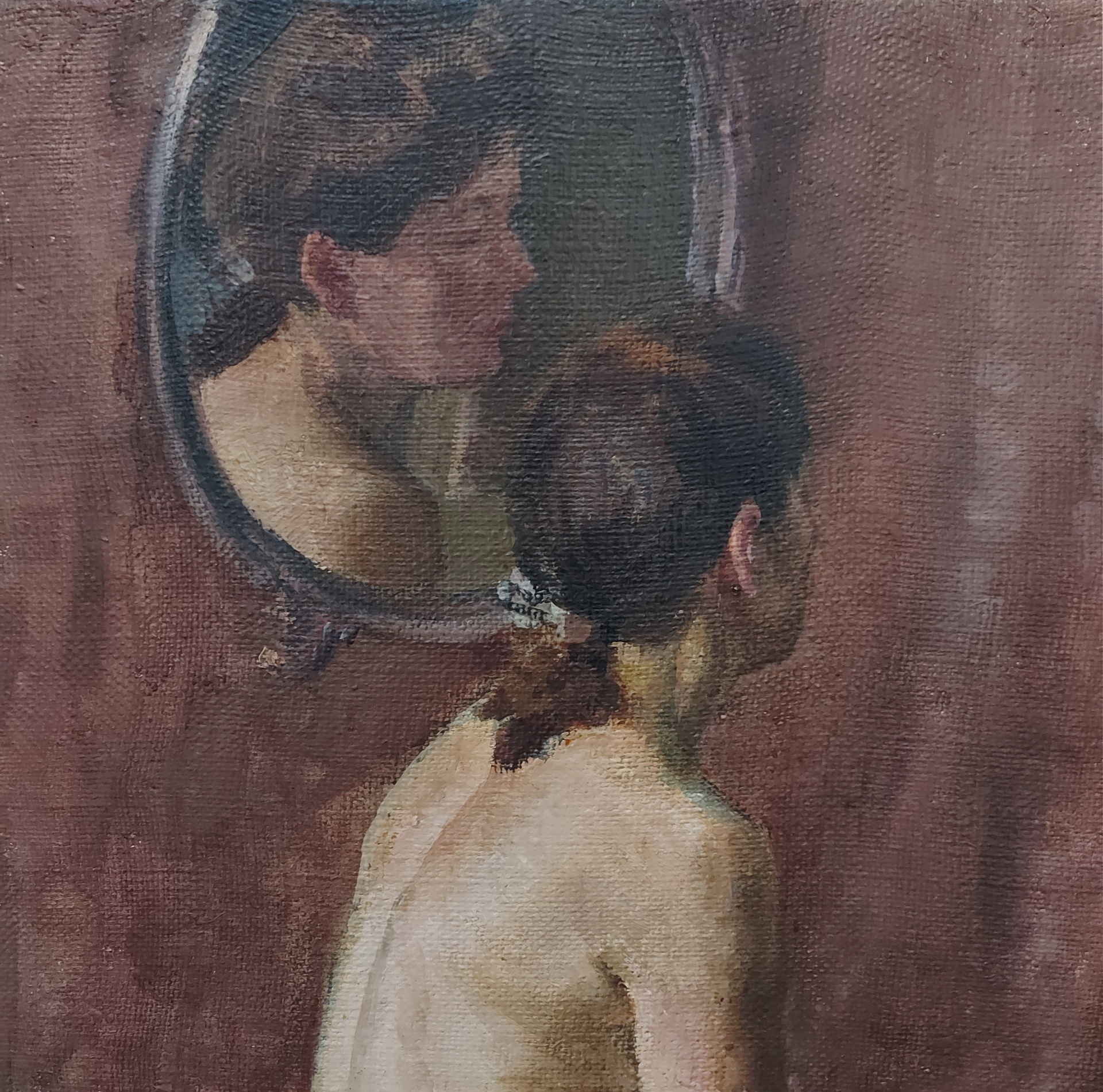 Женская обнаженная модель. Учебная постановка. Мастерская станковой живописи профессора Дмитрия Константиновича Мочальского. Студенческая работа Гусева Ю.В., IV курс Московского Государственного Художественного Института имени В.И. Сурикова, 1951 год.