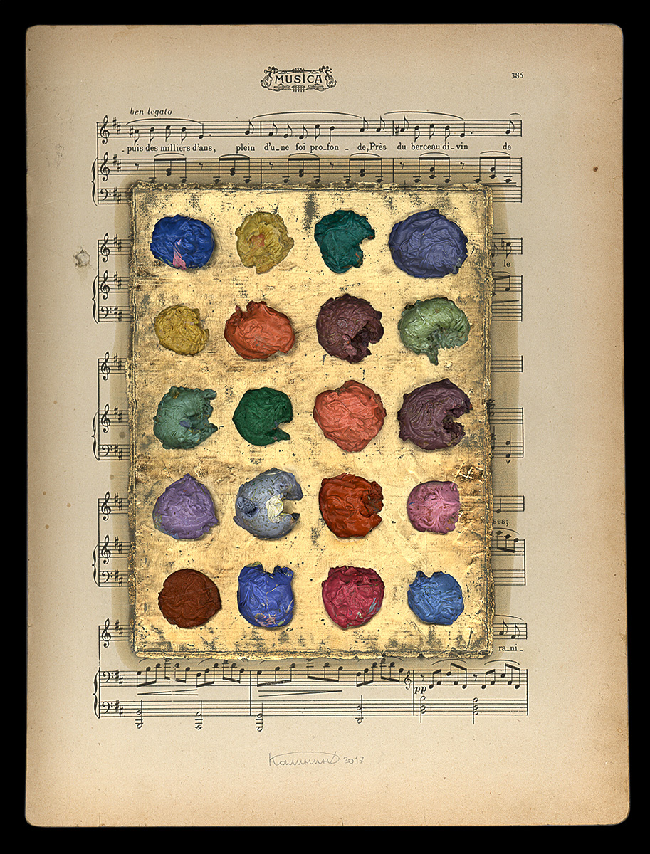 • Техника: смешанная, старинные ноты (конец 19- начало 20 века), поталь (золото), масло