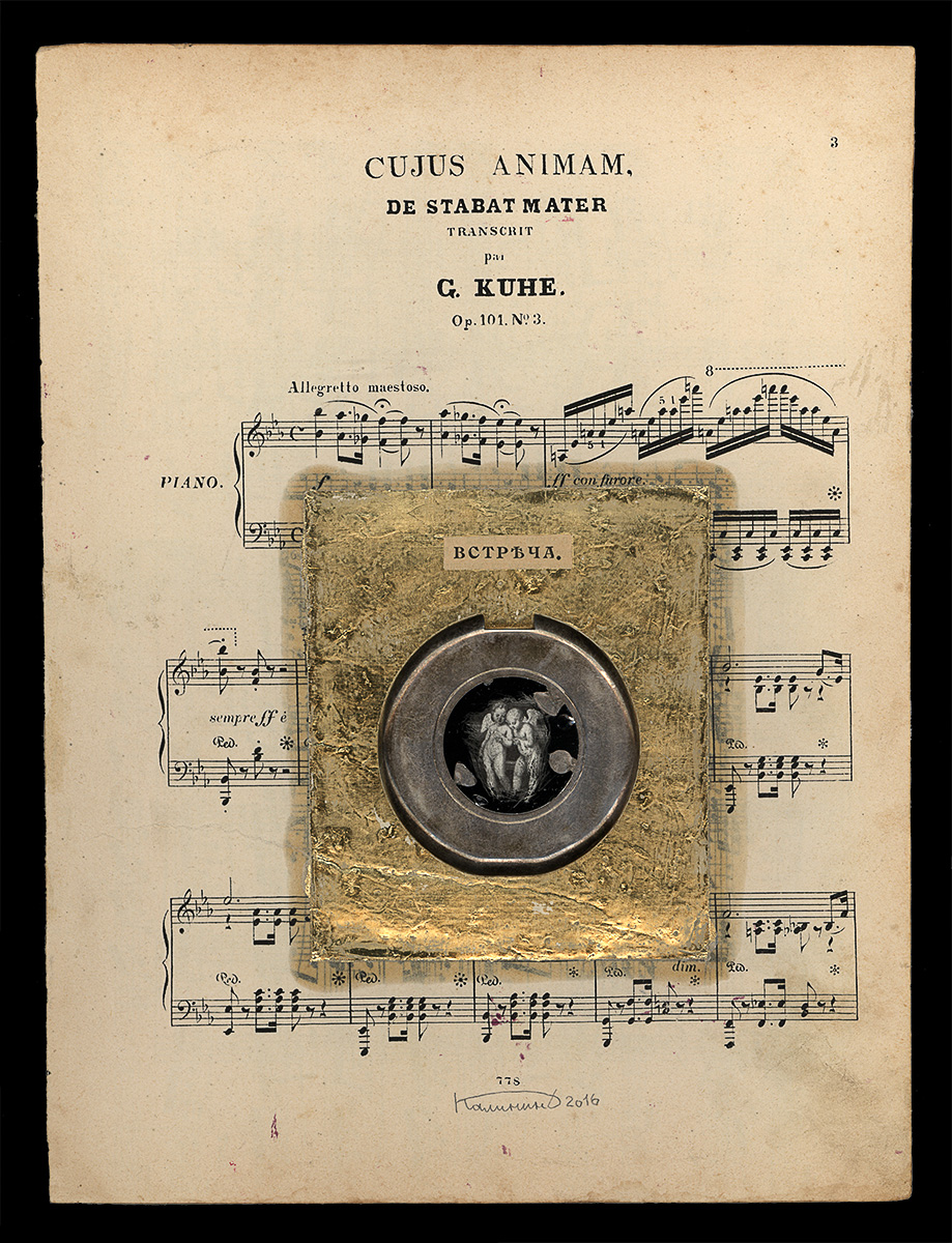 • Техника: смешанная, старинные ноты (конец 19- начало 20 века), поталь (золото), зеркало, фрагмент пудреницы