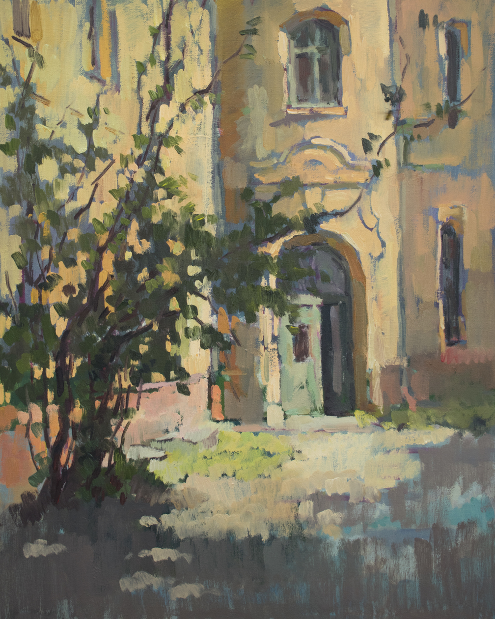 Солнечный дворик в самом сердце Риги. Навевает добрые воспоминания о детстве для тех, кому знакомы такие дворики. Работа находится в Москве.