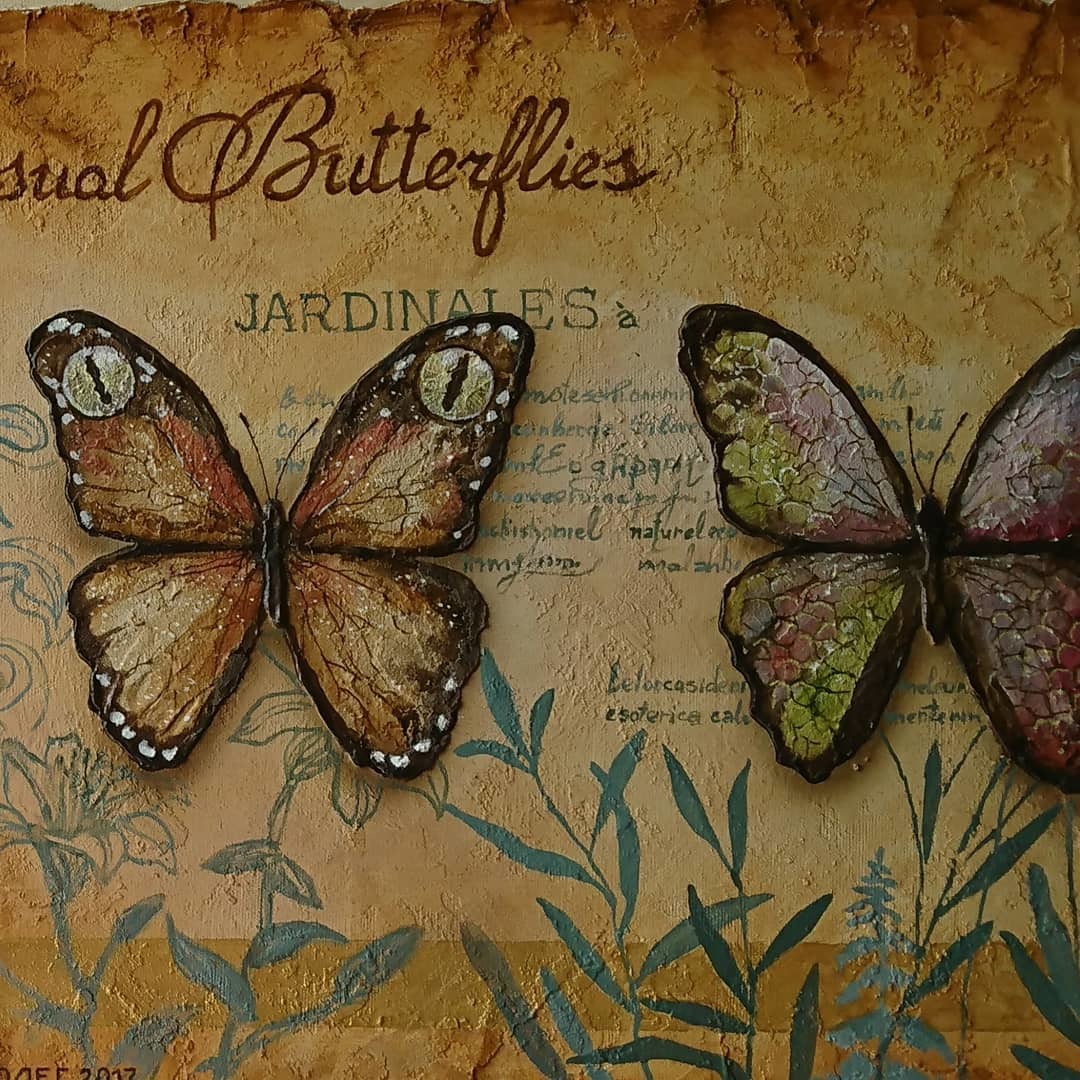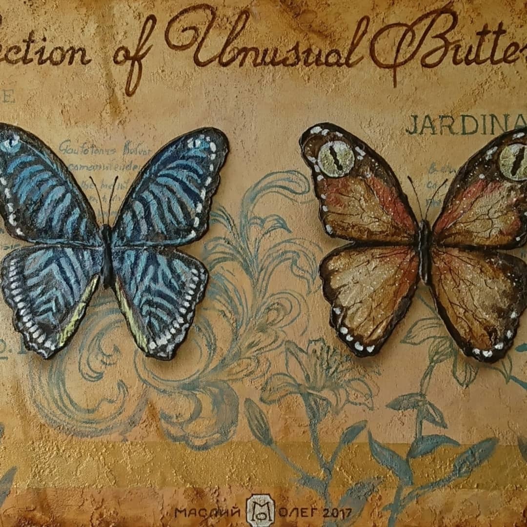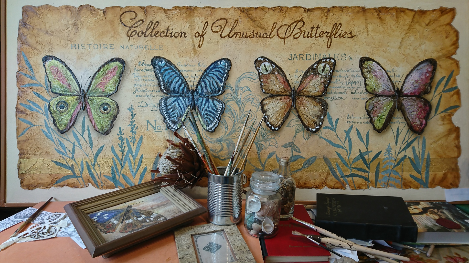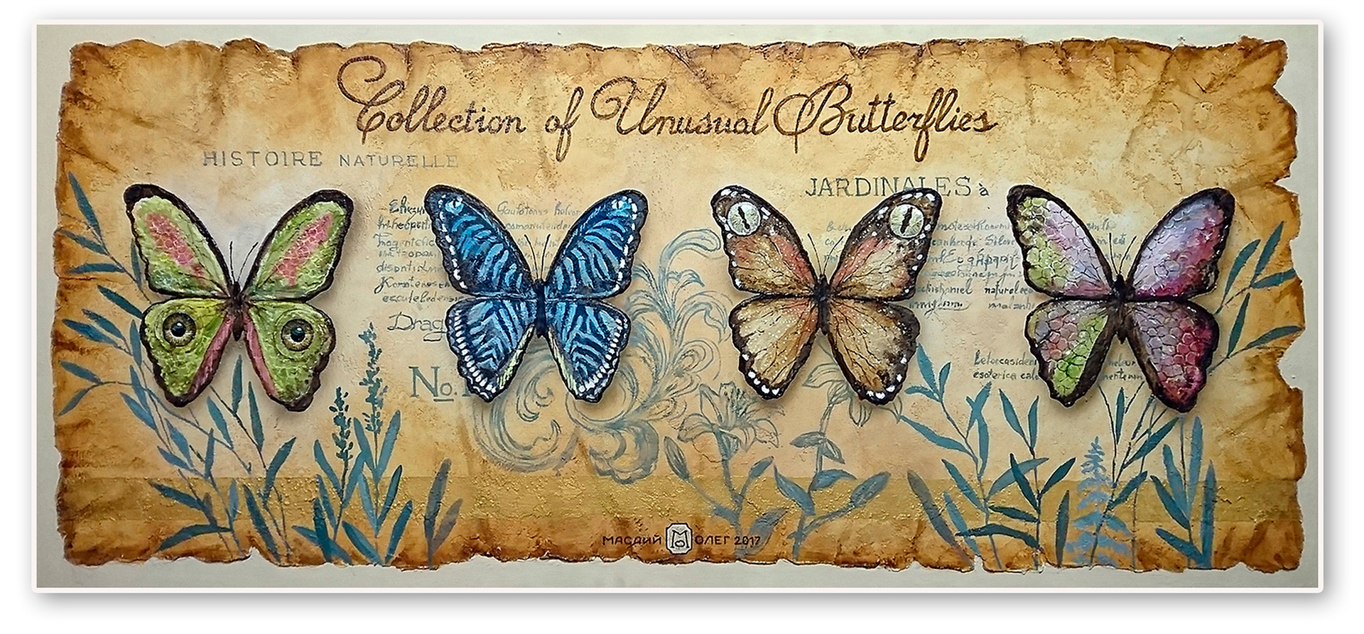 Выдуманная мною коллекция несуществующих бабочек. Их нет в природе, но они есть у меня в голове. А теперь они есть и на холсте...
