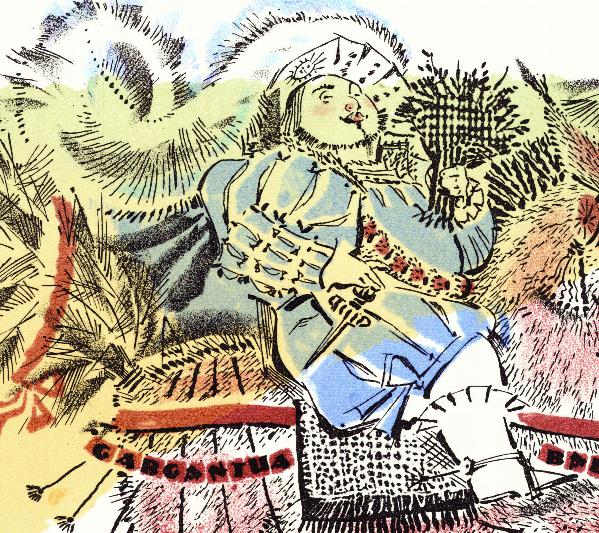Эта иллюстрация относится к первой книге-части знаменитого романа, в которой рассказывается о приключениях и похождениях "преужасной жизни великого Гаргантюа, отца Пантагрюэля" . Работа состоит из 4-х печатных форм.