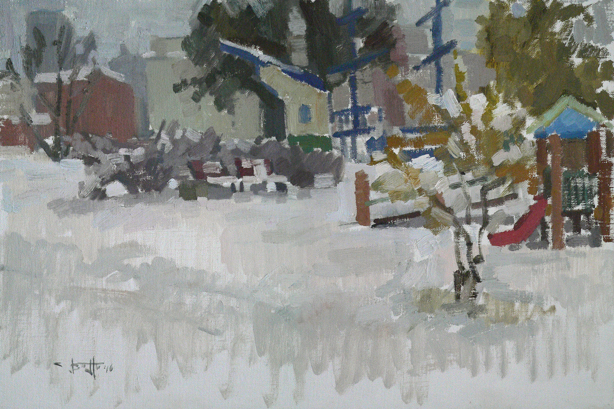 Палитра работы очень передает зимнее состояние природы. Все словно замерло в ожидании новых детских радостных криков, как только придет весна. Работа оформлена в красивый нежно-серебристый багет и находится в Москве.