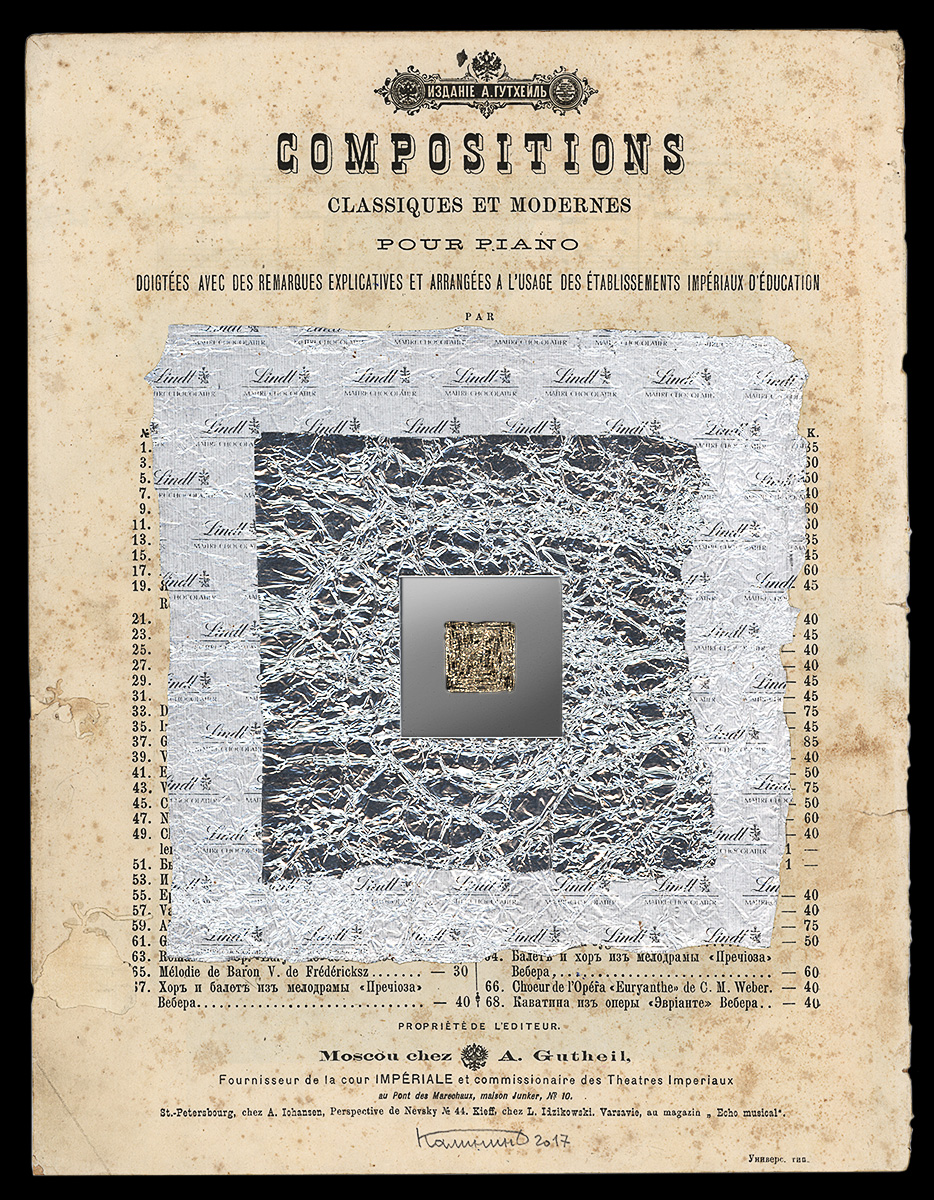 • Техника: смешанная, старинные ноты (конец 19-начало 20 века), фольга, зеркало