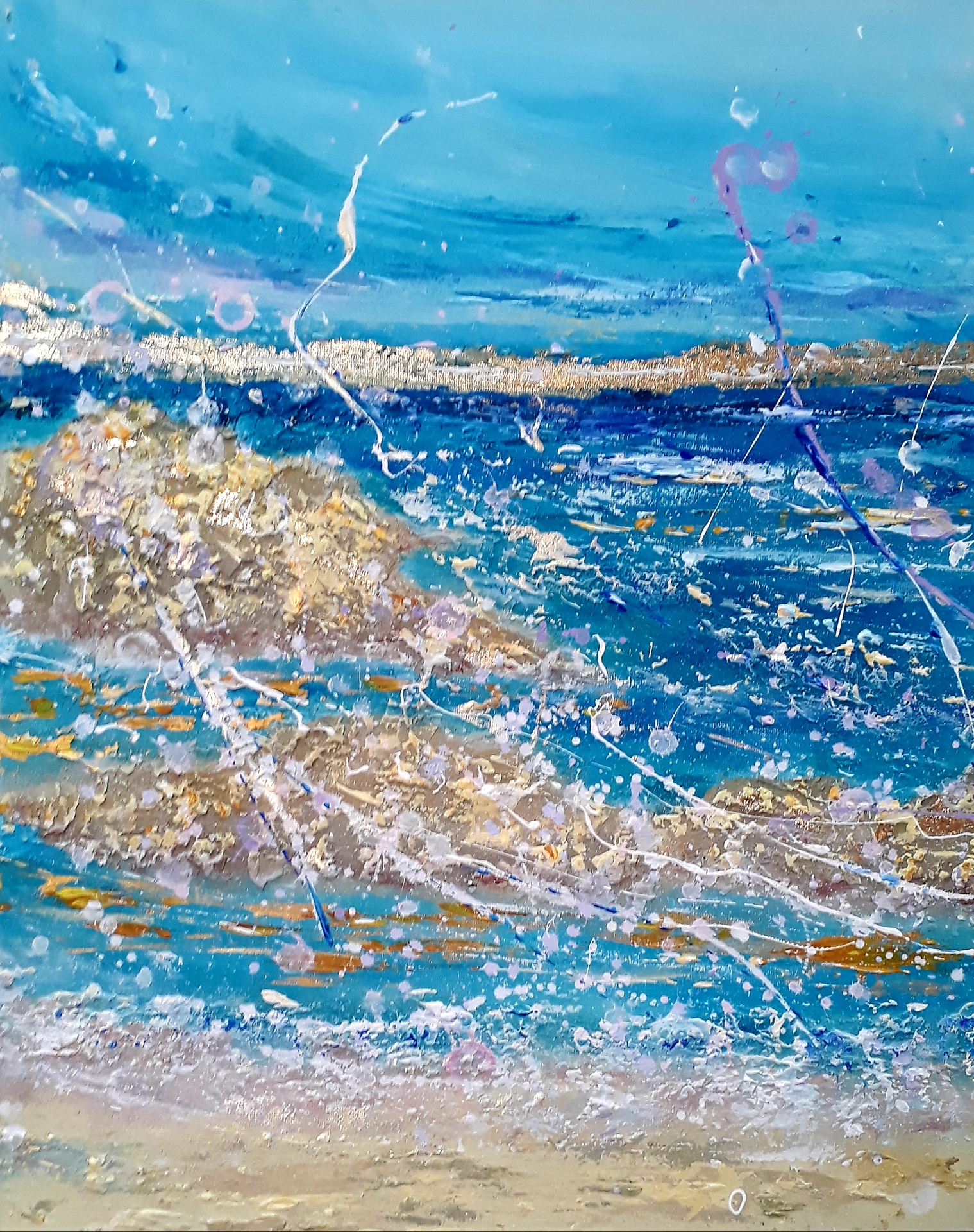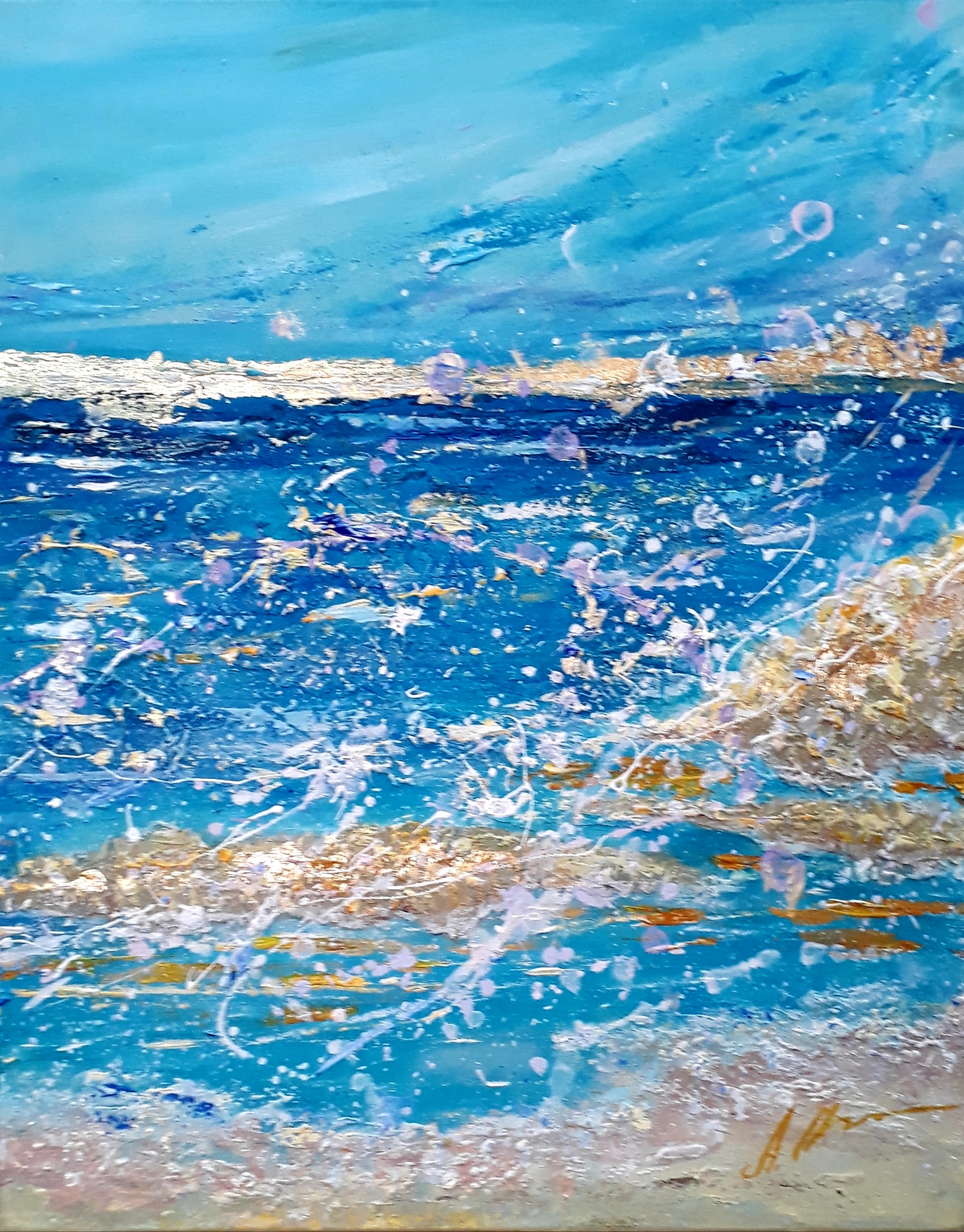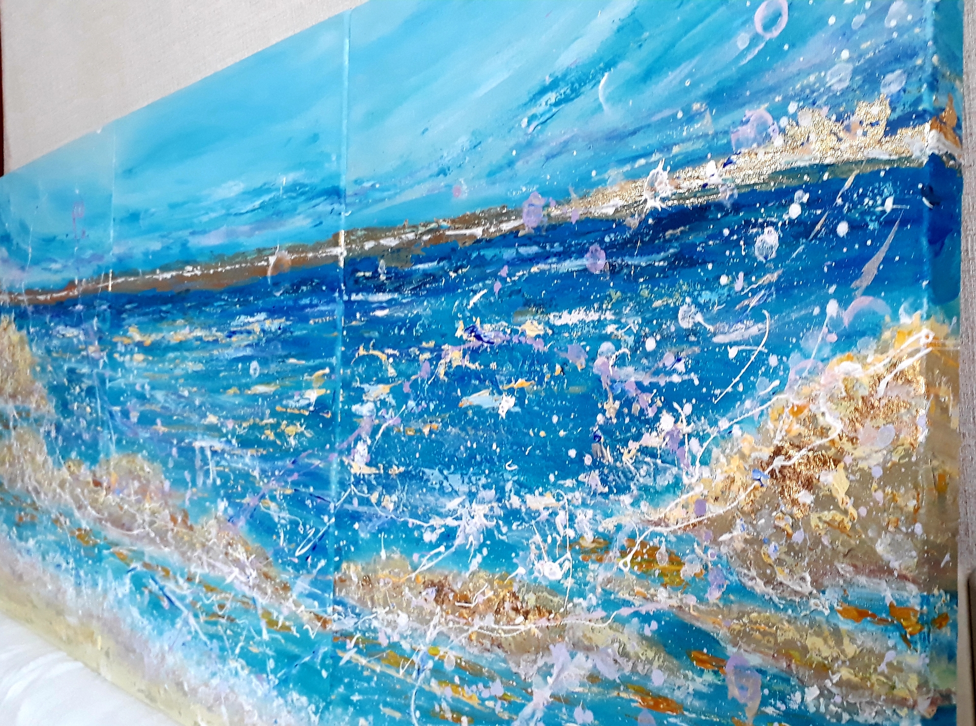 Белый, бирюзовый, синий, желтый – эти цвета для меня ассоциируются с морем. Мы часто используем слово море, чтобы подчеркнуть большой размер или большое количество: море впечатлений, море счастья, море радости, море слез и так далее… Сегодня мне захотелось взять именно эти краски, чтобы окунуться в море таких разнообразных эмоций и пригласить Вас найти те, которые нужны именно Вам… Работа состоит из трех модулей размером 50 х 40 см, которые прекрасно смотрятся как вместе так и по отдельности. Золотая акриловая краска и поталь, нанесенные на текстурную пасту оживляют картину легким мерцанием. Картина не нуждается в раме, создана в единственном экземпляре.