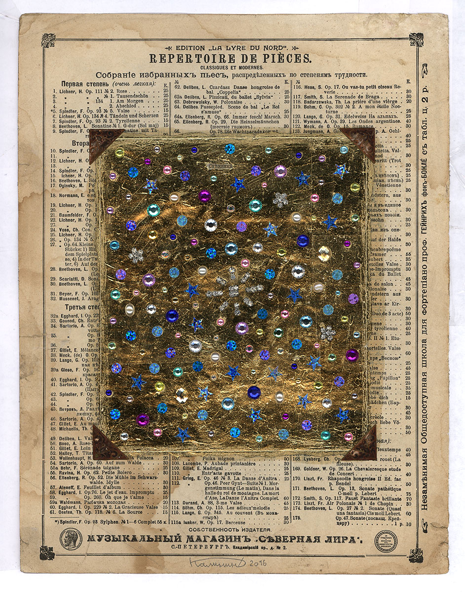 • Техника: смешанная, старинные ноты (конец 19- начало 20 века), поталь (золото), декоративные элементы (акрил, металл), фрагменты украшений(металл, стекло)