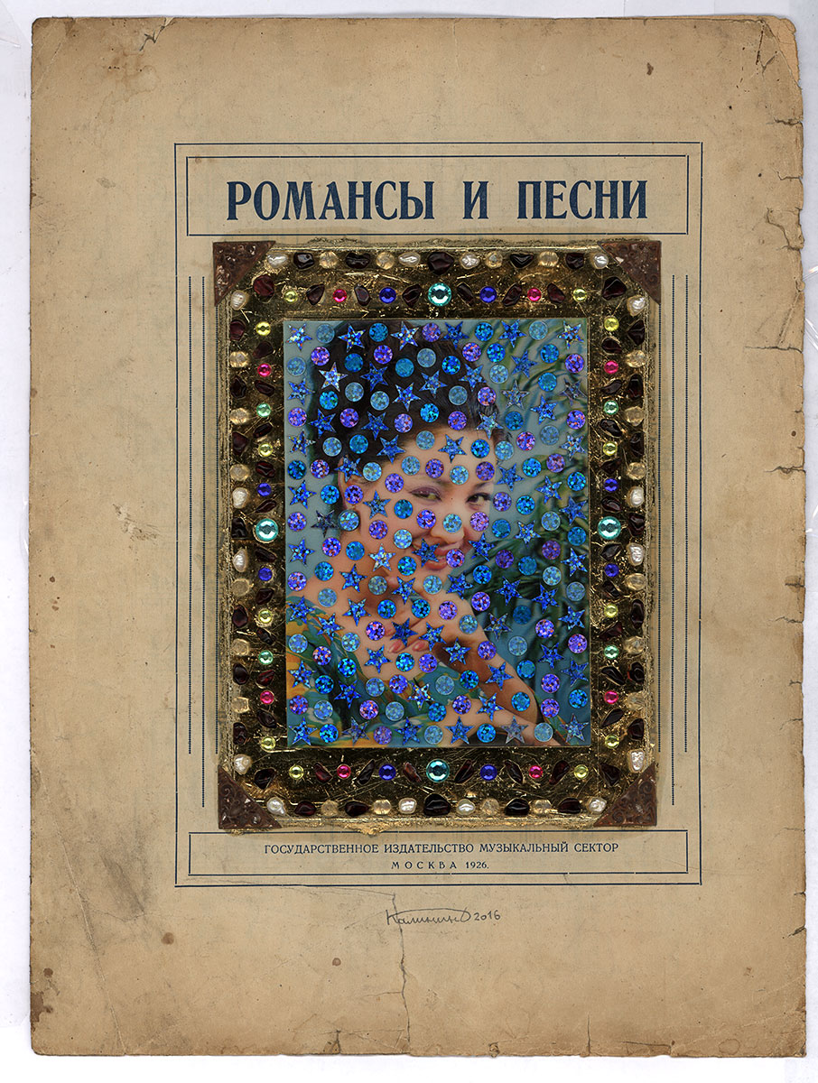 • Техника: смешанная, старинные ноты (конец 19- начало 20 века), поталь (золото), декоративные элементы(акрил), голографическая открытка(Япония, 70-е годы 20-го века)