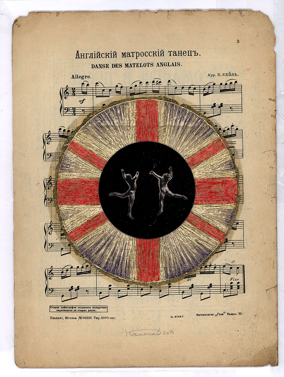 • Техника: смешанная, старинные ноты (конец 19- начало 20 века), поталь (золото), масло, зеркало(при сканировании оно получается чёрным), фотография, процарапывание