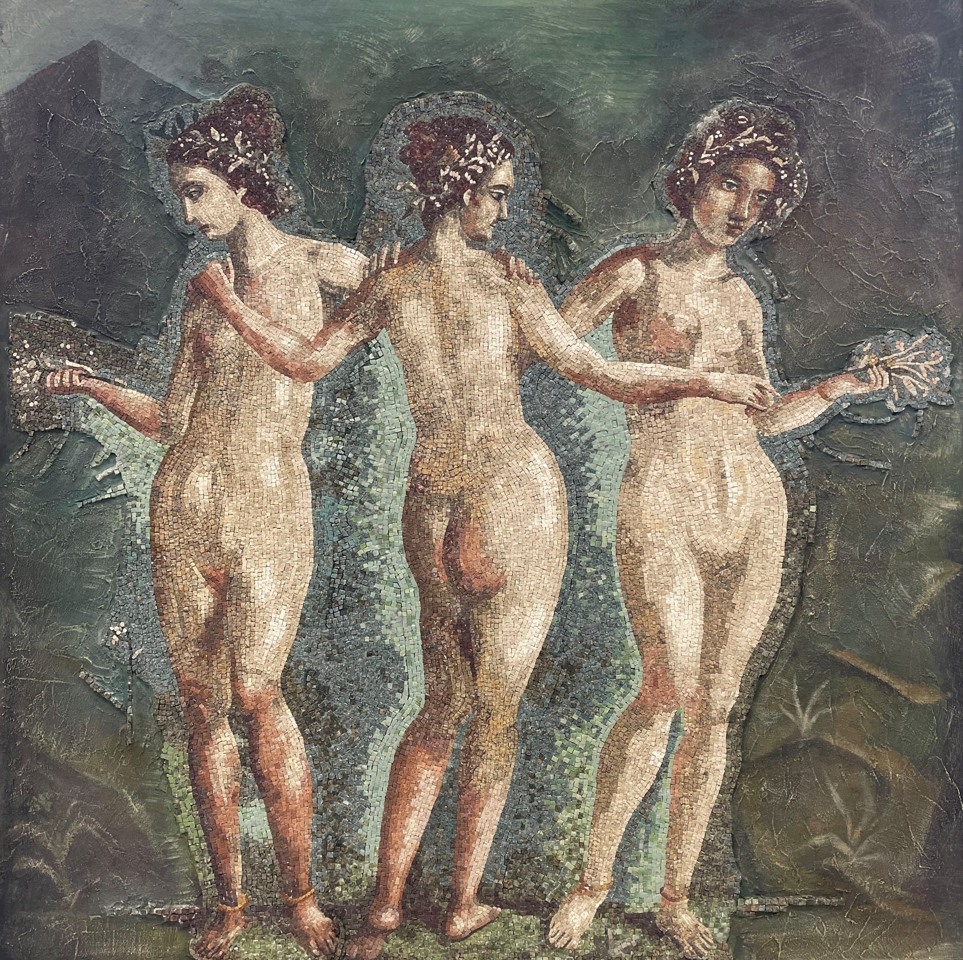 Мозаичная интерпретация фрески из дома Тита Дентата Пантеры, третий стиль, 1-50 гг. н. э. Работа была представлена на выставке «Под пеплом Везувия: мозаики и мозаичные интерпретации фресок древнеримских городов» (Санкт-Петербургский союз художников) 2021 г. Материал: мрамор, смальта, фресковая живопись