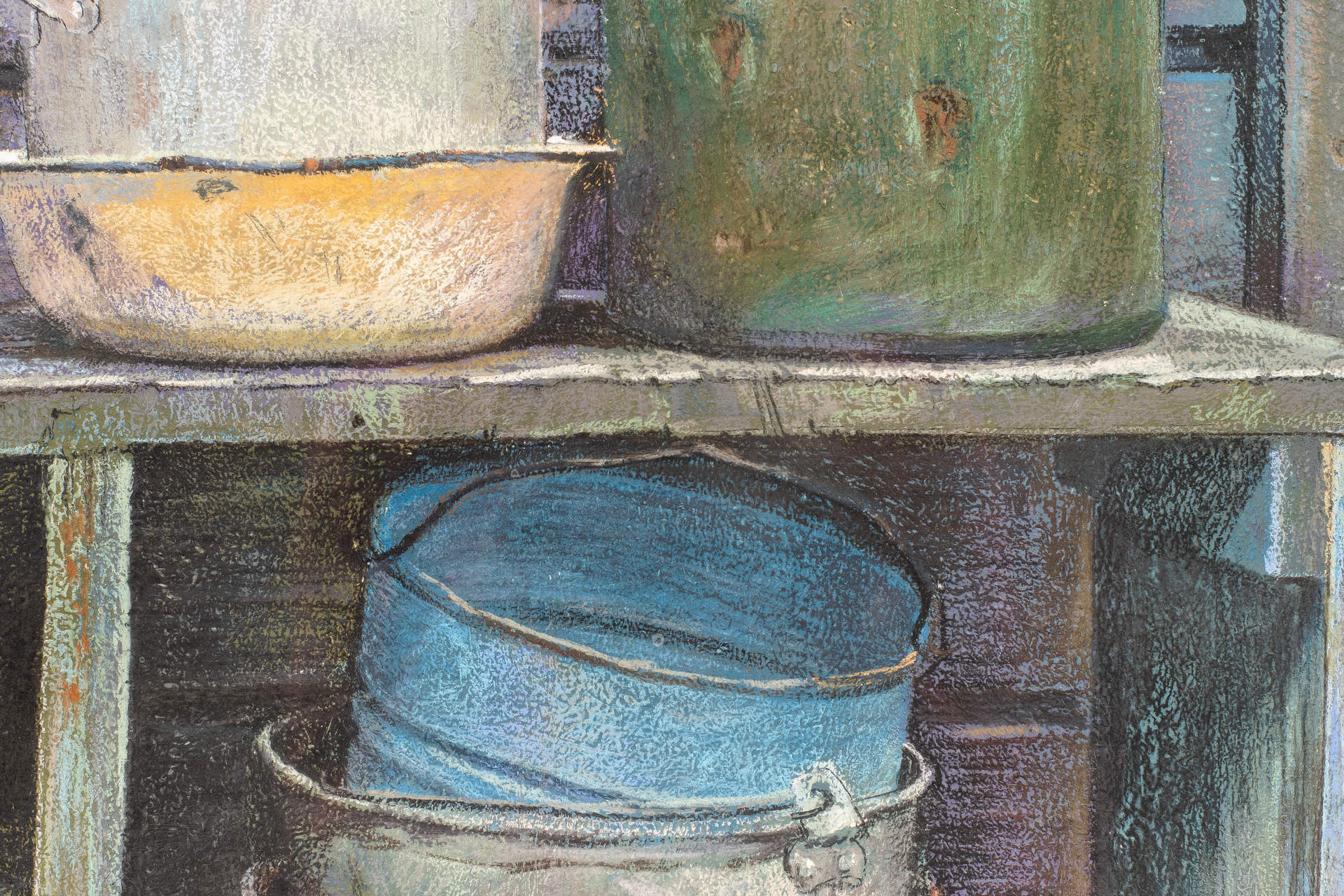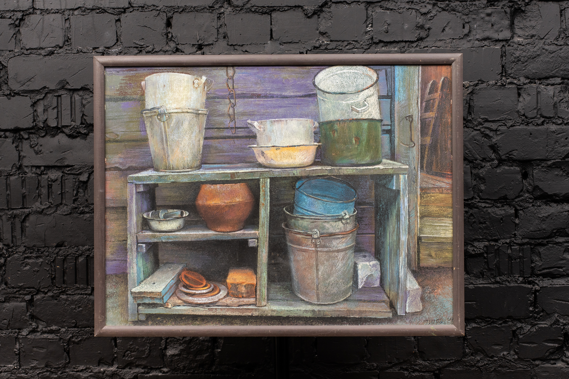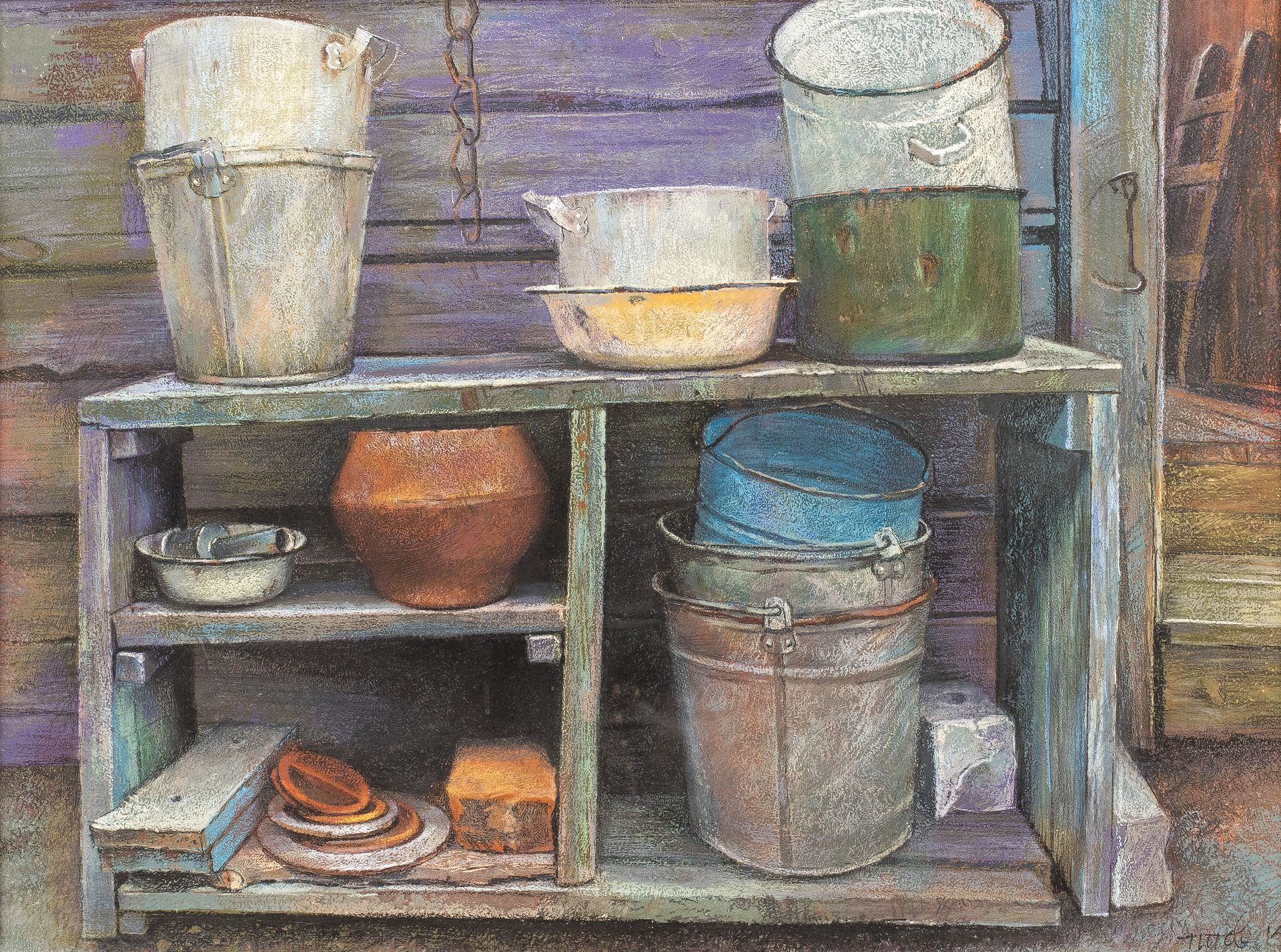 «Сельский натюрморт» продолжил серию творческих исканий художника в области предметных интерпретаций и фактур. Окружающие предметы чрезвычайно вдохновляют художника, особенно если это знакомые с детства атрибуты его сельской жизни. Все эти ведра, старые кастрюли, ржавые тазики и горшки, в естественном порядке расположенные на полке, уже отжили свой век и больше не используются в быту, но навсегда остались в детской памяти и по сей день служат для художника источником вдохновения. Выполненный с натуры натюрморт прекрасно передает глубокие волнения художника от встречи с любимыми воспоминаниями детства. Композиция натюрморта статична, вписана в условный квадрат, что повествует о неторопливости и размеренности сельских будней. Особое внимание уделено тактильным ощущениям от предметов, выраженных в фактурных поисках отражения реальности. Главное для художника – максимально достоверно передать все характеристики предметов: особенности формы и материальности, чтобы как в фотографии, прочно зафиксировать то, что должно быть сохранено как память о важнейших событиях жизни.