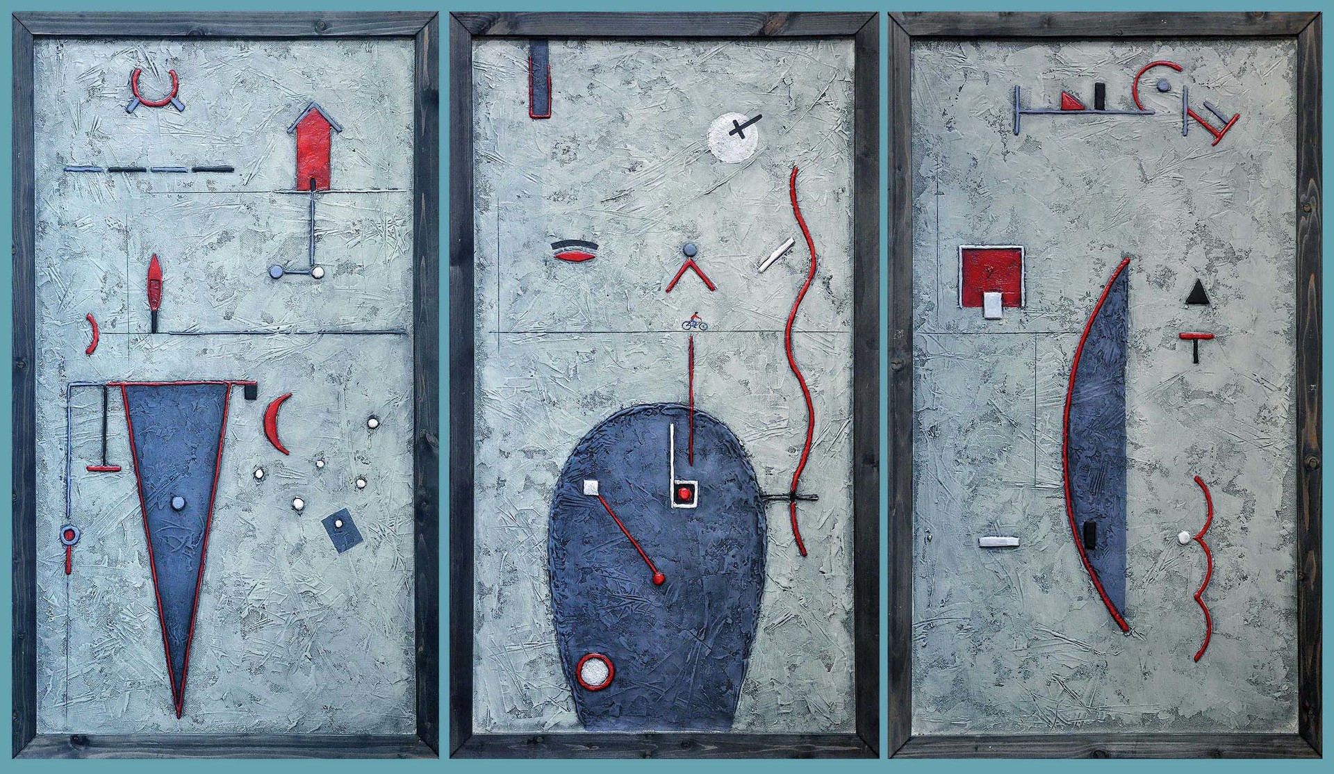 Триптих исполнен акрилом по оргалиту, имеет малый рельеф. В обрамлении, которое входит в само произведение.