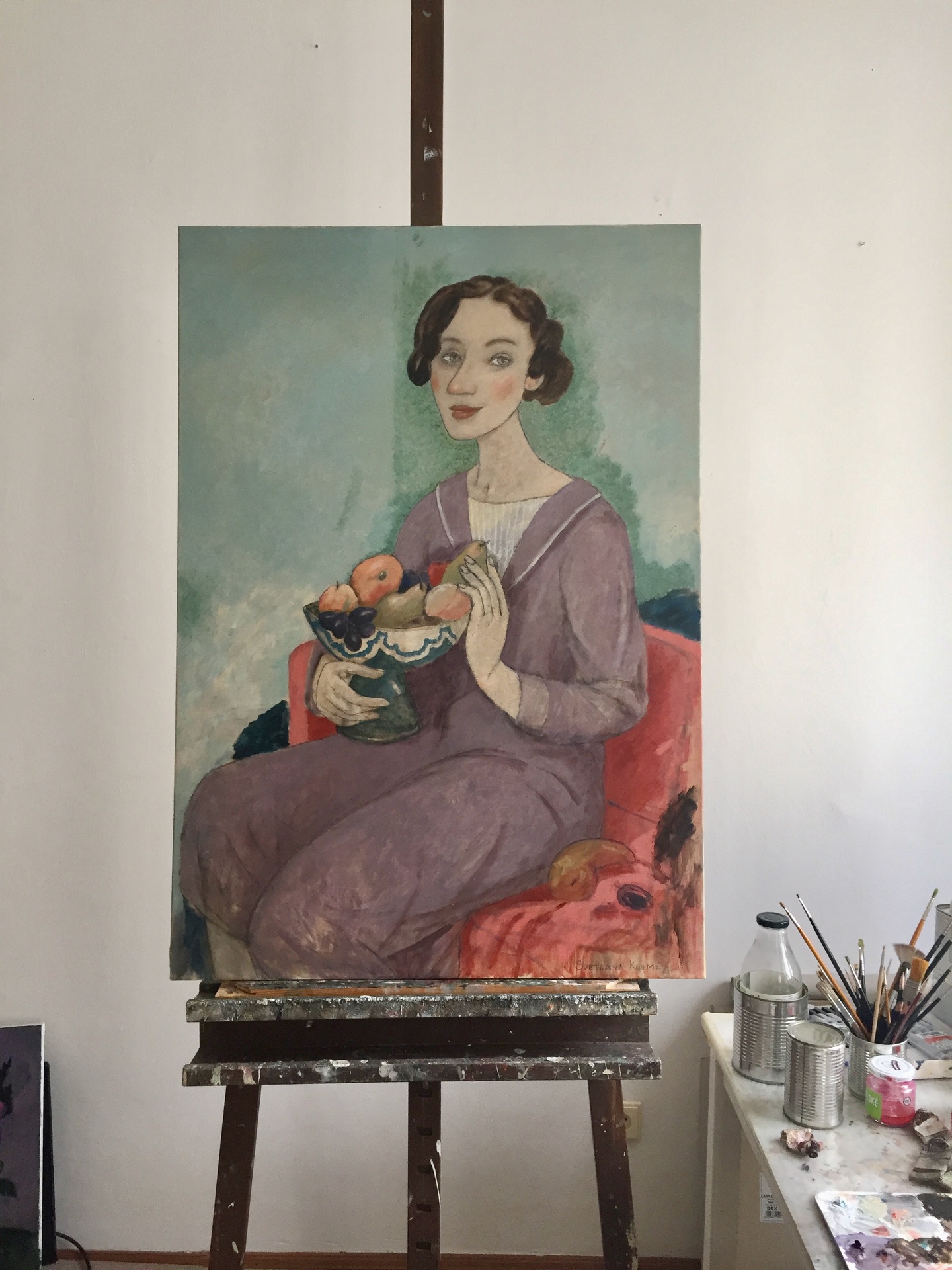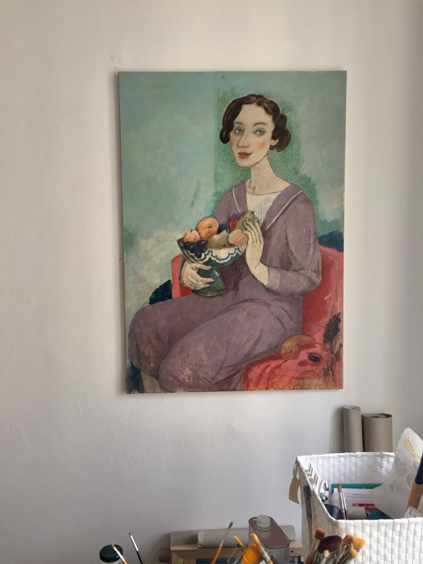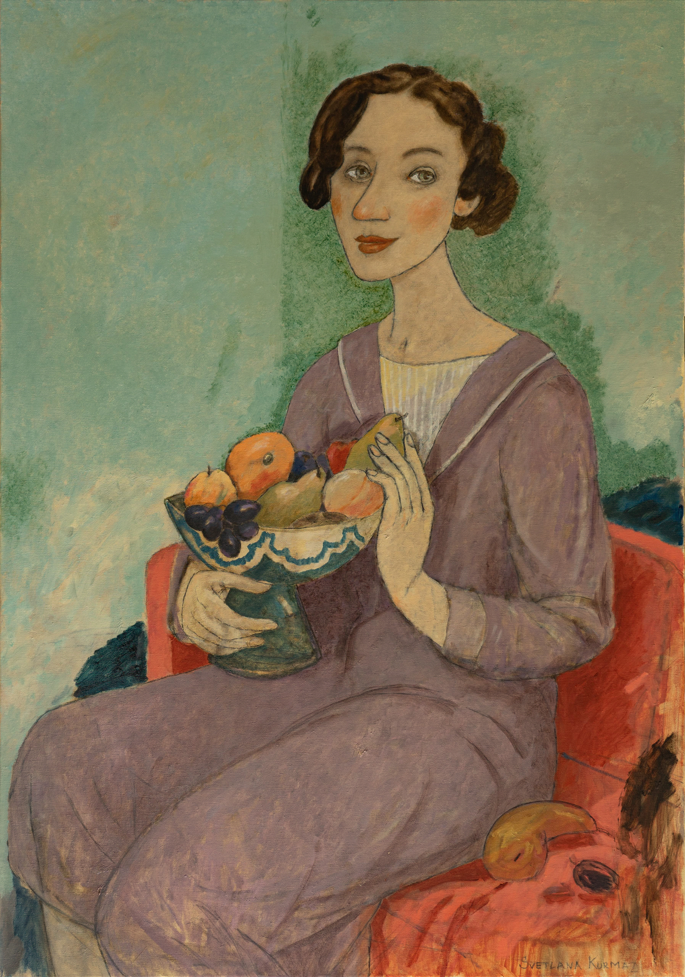 Дама с фруктами в голубой вазе.