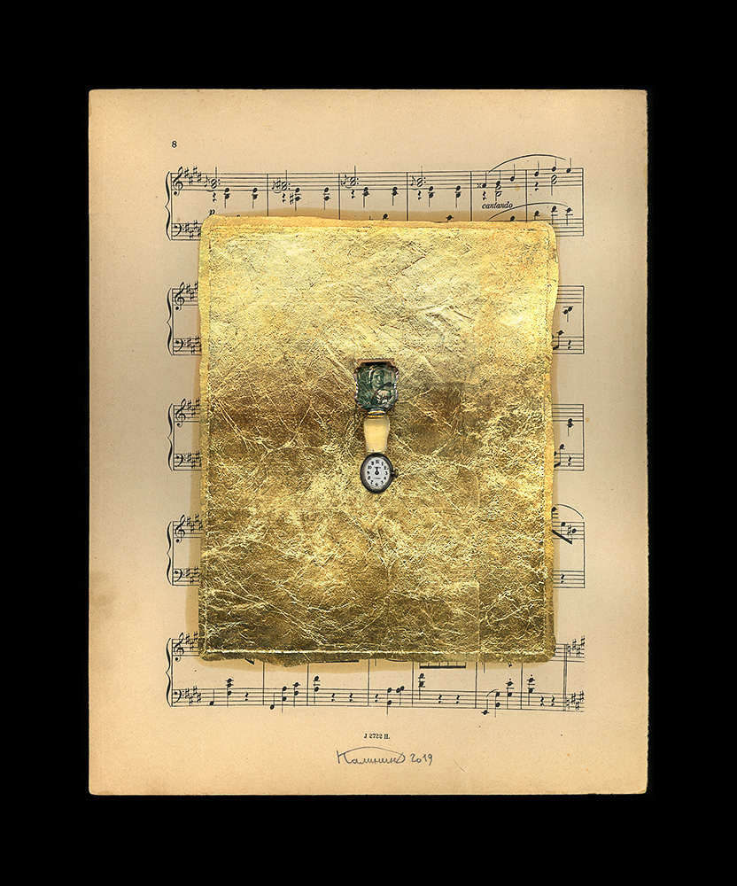 • Техника: смешанная, ноты(конец 19 - начало 20 века), поталь(золото), пробка от флакона духов(стекло, СССР), почтова марка (СССР, 60-е годы), часы (СССР, "Чайка")