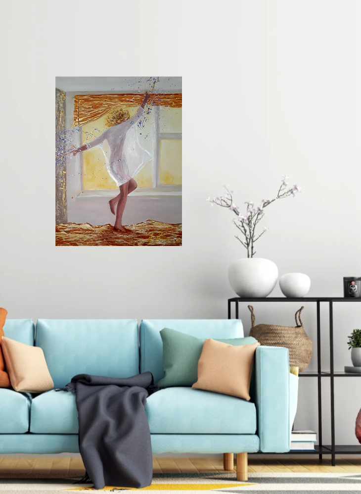 Танцующая женщина растворилась в ритме музыки и танца, она уверена, что ее никто не видит и она может быть собой. В этот момент неосознанная радость наполняет ее и она чувствует себя счастливой и живой. Золотая и перламутровая акриловые краски, нанесенные на текстурную пасту оживляют картину легким мерцанием. Картина лучше смотрится при боковом освещении, не нуждается в раме, создана в единственном экземпляре.