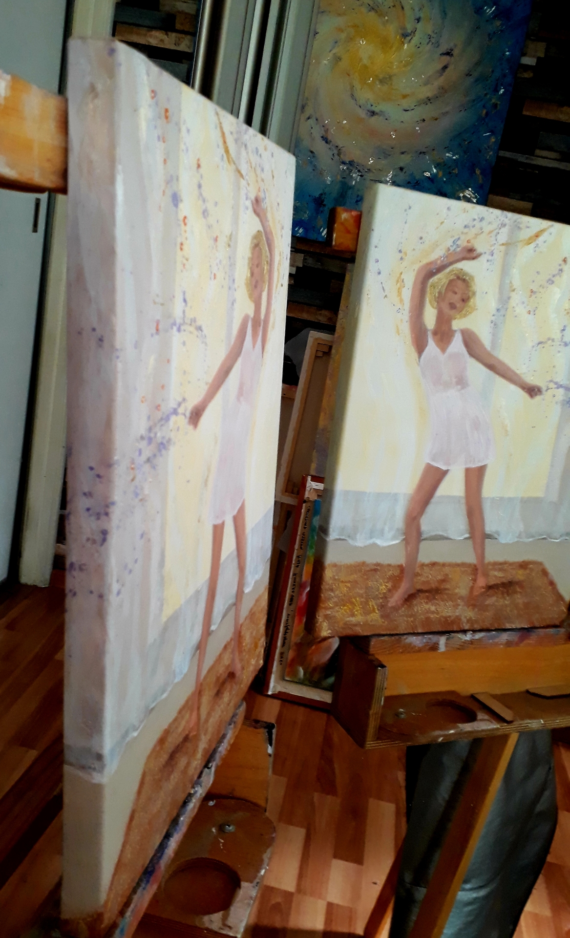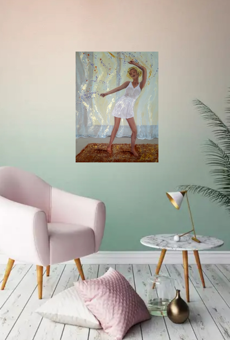 Танцующая женщина растворилась в ритме музыки и танца, она уверена, что ее никто не видит и она может быть собой. В этот момент неосознанная радость наполняет ее и она чувствует себя счастливой и живой. Золотая и перламутровая акриловые краски, нанесенные на текстурную пасту оживляют картину легким мерцанием. Картина лучше смотрится при боковом освещении, не нуждается в раме, создана в единственном экземпляре.