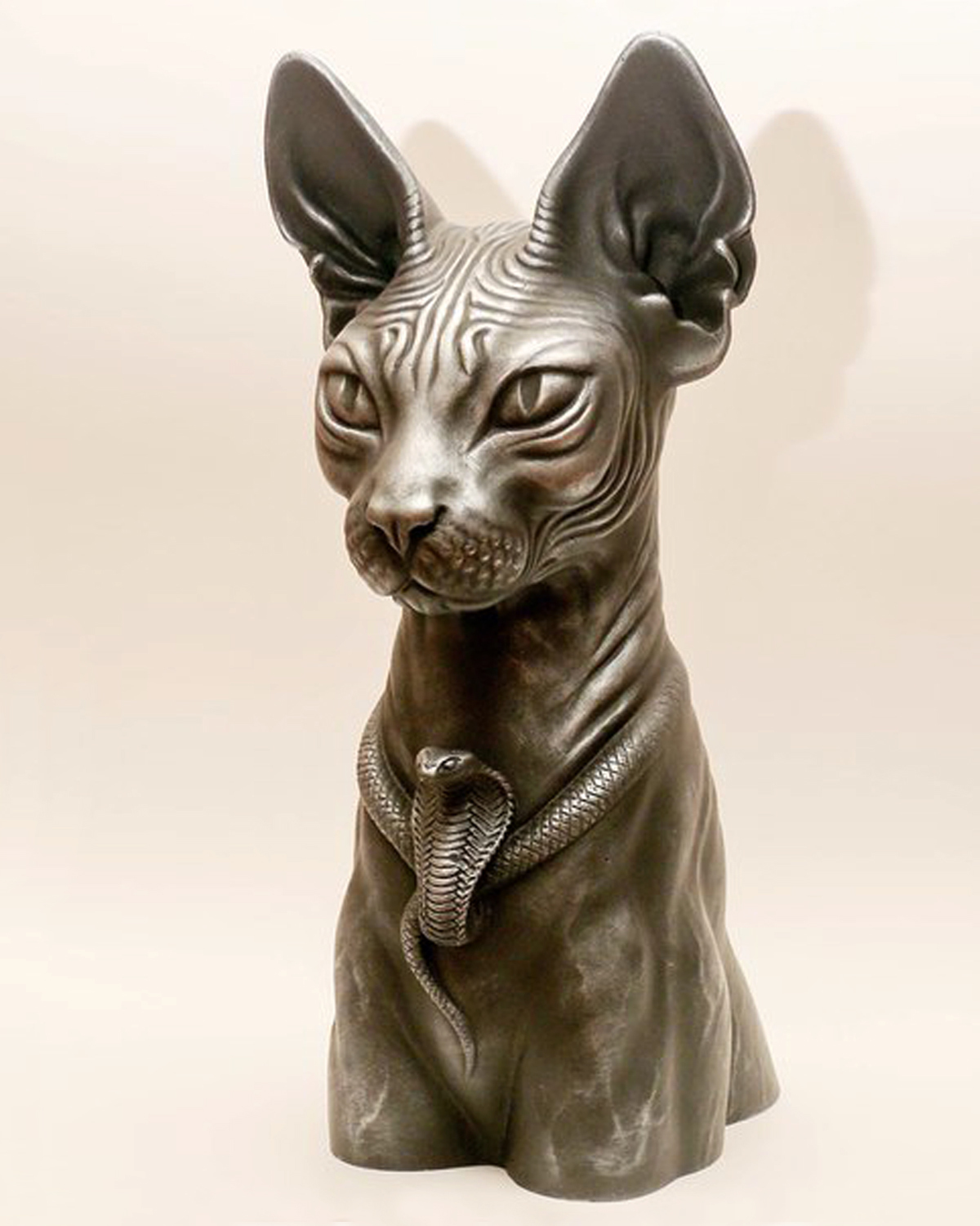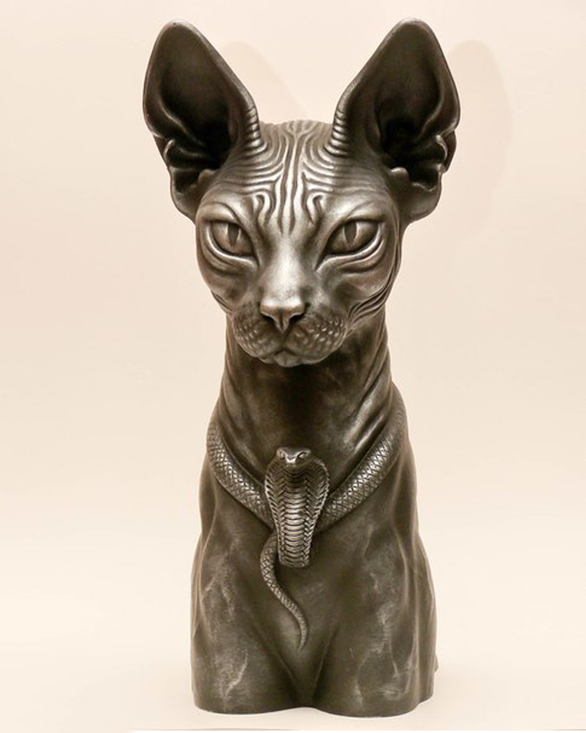 "СТРАЖ ВРЕМЕНИ" 2011г. 35х16х23см. За пять тысяч лет каждое утро я вижу Бога солнца, восходящего вдали на берега Нила. Его первые лучи освещают мое лицо. Я видел рождение истории Египта, а завтра увижу, как Восток пылает Новой Зарей. Я предан. страж у ног моего повелителя, столь бдительный и преданный, что он дал мне его лицо. Я Спутник фараона, я сам фараон. Материал : литьевой пластик, тонировка под чернёное серебро.