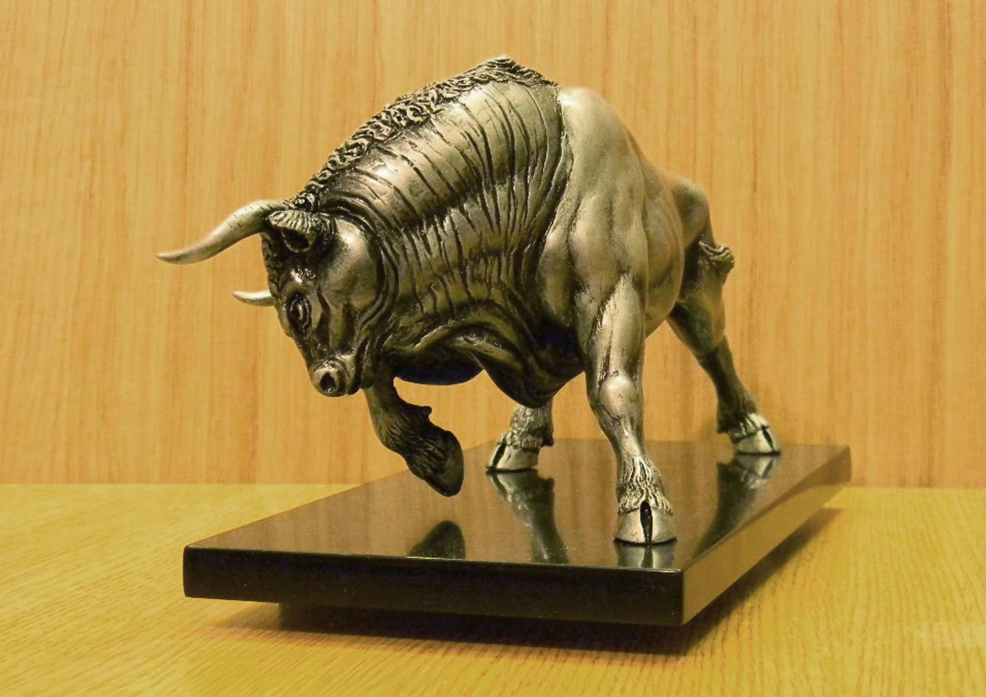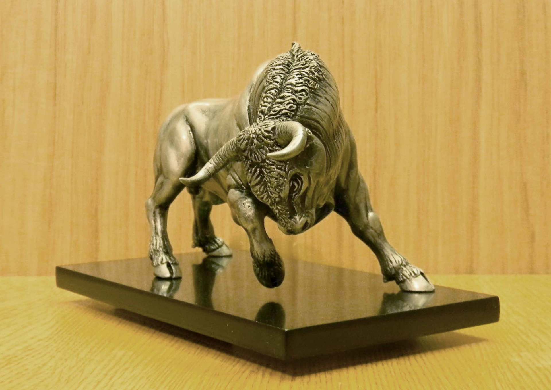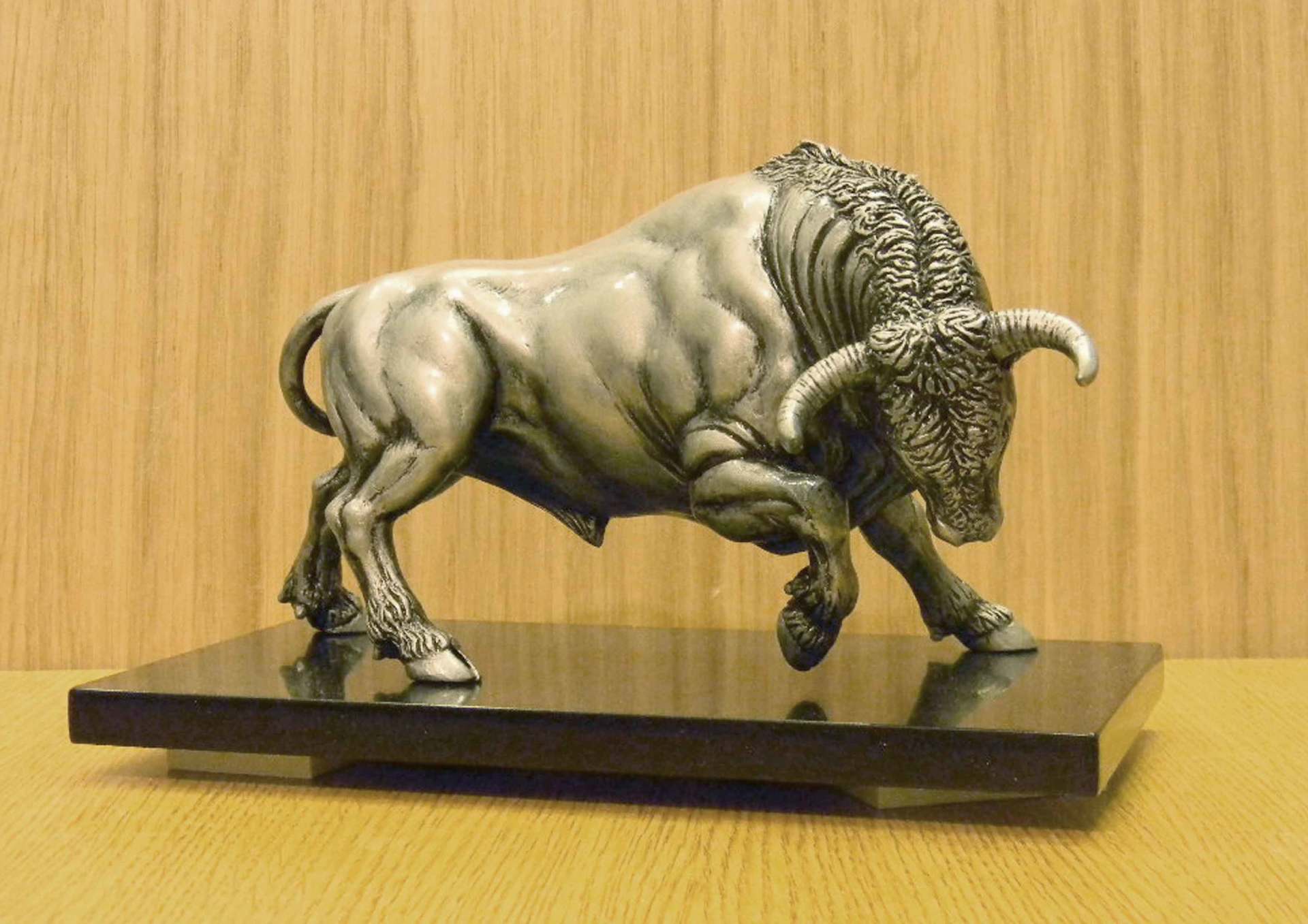 "ТЕЛЕЦ" 2020г. 13х22х12см. Сильное и бесстрашное животное, полностью уверенное в себе и без сомнения принимающее решения, которые только укрепляют созданный веками образ. Символ стабильности и процветания. Бык означает силу и мощь, трудолюбие и оригинальность мышления, упорство и решительность. Материал: Литьевой пластик, тонировка под бронзу или серебро. Если материал - металл (бронза или серебро), то стоимость скульптуры будет выше и будет рассчитана по запросу. Подиум: искусственный камень «Galaxy».