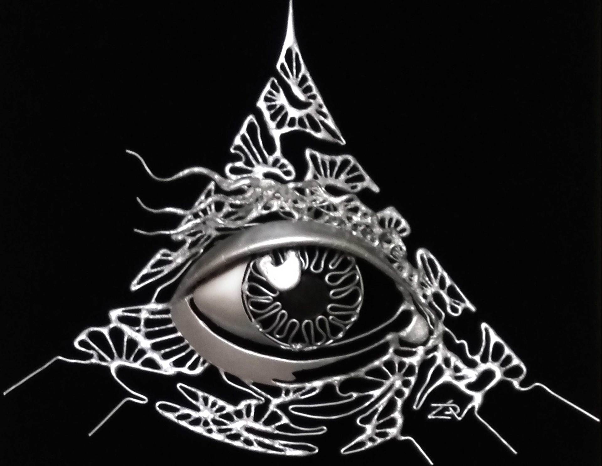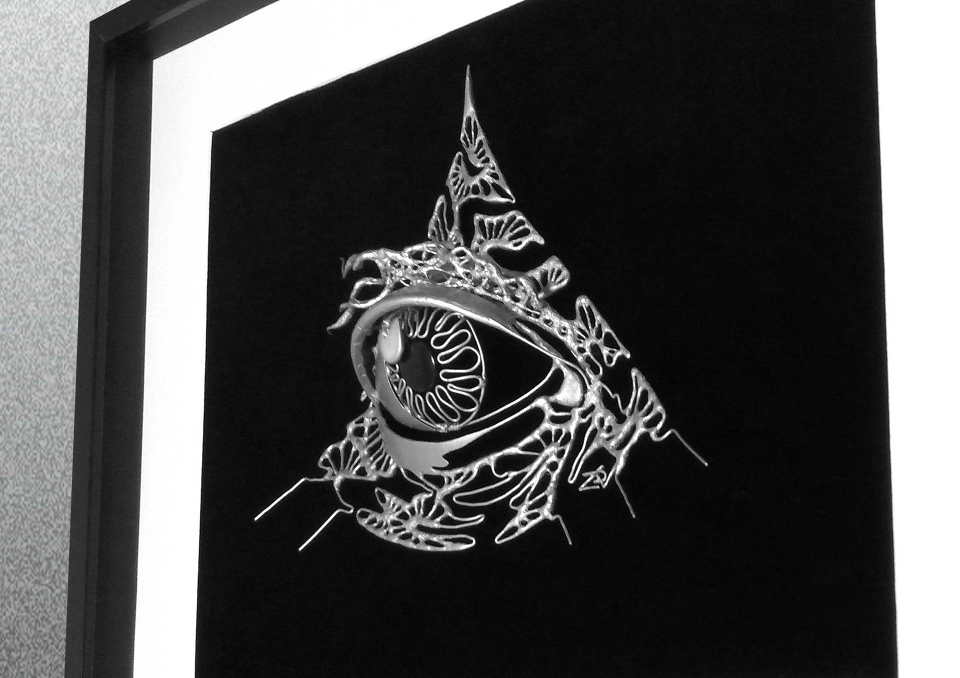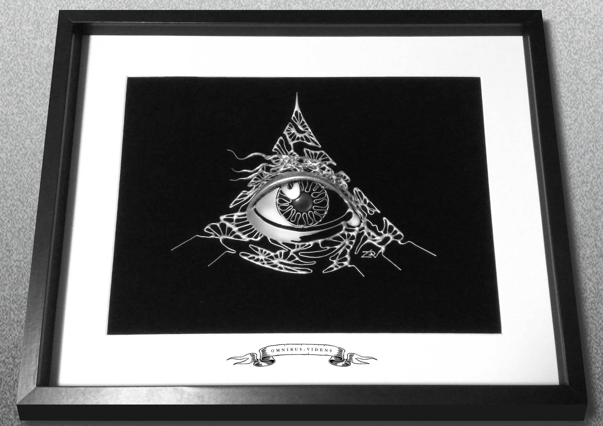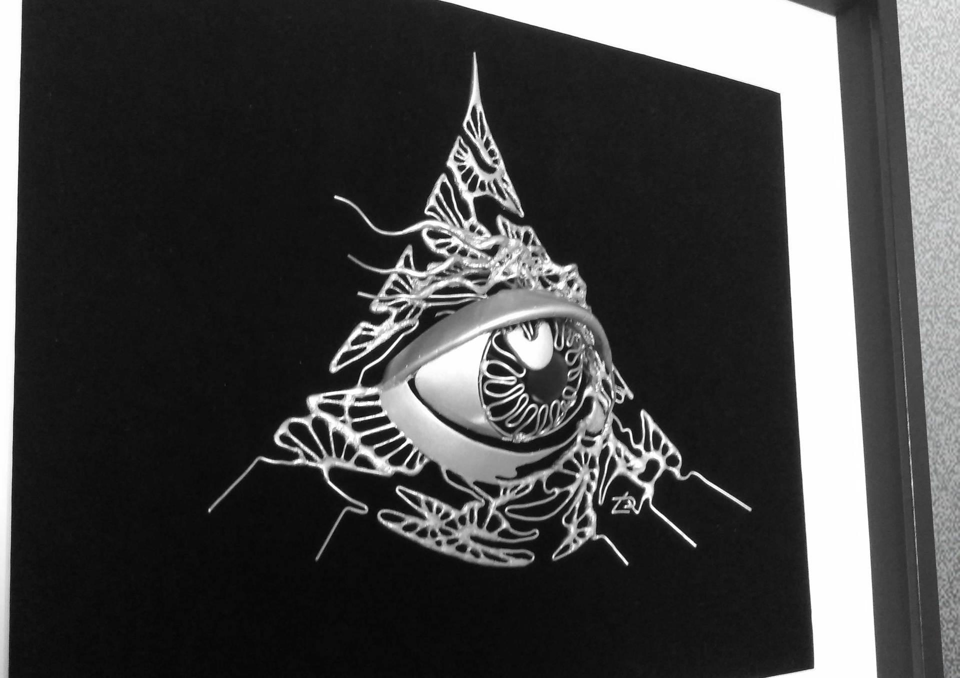 Барельефная композиция. "ВСЕВИДЯЩИЙ" "OMNIBUS-VIDENS" Ни один человек на земле не является одиноким – с ним постоянно и неусыпно присутствует Бог. Поэтому Суд Божий будет непременно справедливым: Господу ведомы даже скрытые наши мысли и деяния, которые он положит на чаши весов. Господь, несмотря на нашу многочисленность и обилие забот, способен наблюдать за каждым из нас постоянно. Он видит не только то, что мы делаем, но и что думаем и чувствуем. Господь не следит за нами намеренно: он просто знает все, что происходит в этом мире. Бог дарует нам свободу поступать, как нам захочется, но каждый поступок обязательно будет взвешен и оценен. Барельефная композиция. Ручная работа в единственном экземпляре. Возможно изготовление (на заказ) авторский реплики.Точная копия не возможна. Изготовлена из металлической проволоки, полимерная сварка (авторская техника). Тонировка под серебро. "глаз"- вставка из искусственного камня. Общий фон - чёрный бархат (текстиль) на картоне. Паспарту - картон. Черная рамка для картин.