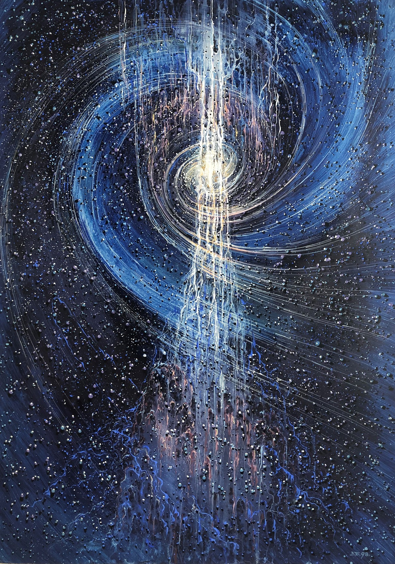 Триптих. Лист 2. Космос для художника, архитектора, философа Болдырева Василия был живой материальной субстанцией, и он определял его для себя, как «космос физический», «космос философский», «космос литературно-поэтический» и т.д. Самое большое количество работ Василия Федоровича посвящено именно Космосу. Сейчас в программах о Вселенной, о Космосе очень часто показывают завораживающие снимки «живого космоса», полученные с помощью самой современной техники. В то время, когда творил свои работы Василий Федорович, таких снимков не было. Но если сравнить работы Василия Федоровича, посвященные Космосу, и эти, современные фотографии живого космоса, то похожесть их несомненна. Чаще всего Василий Федорович работал ночью и непонятно (или понятно?) кто вкладывал в него эти видения.