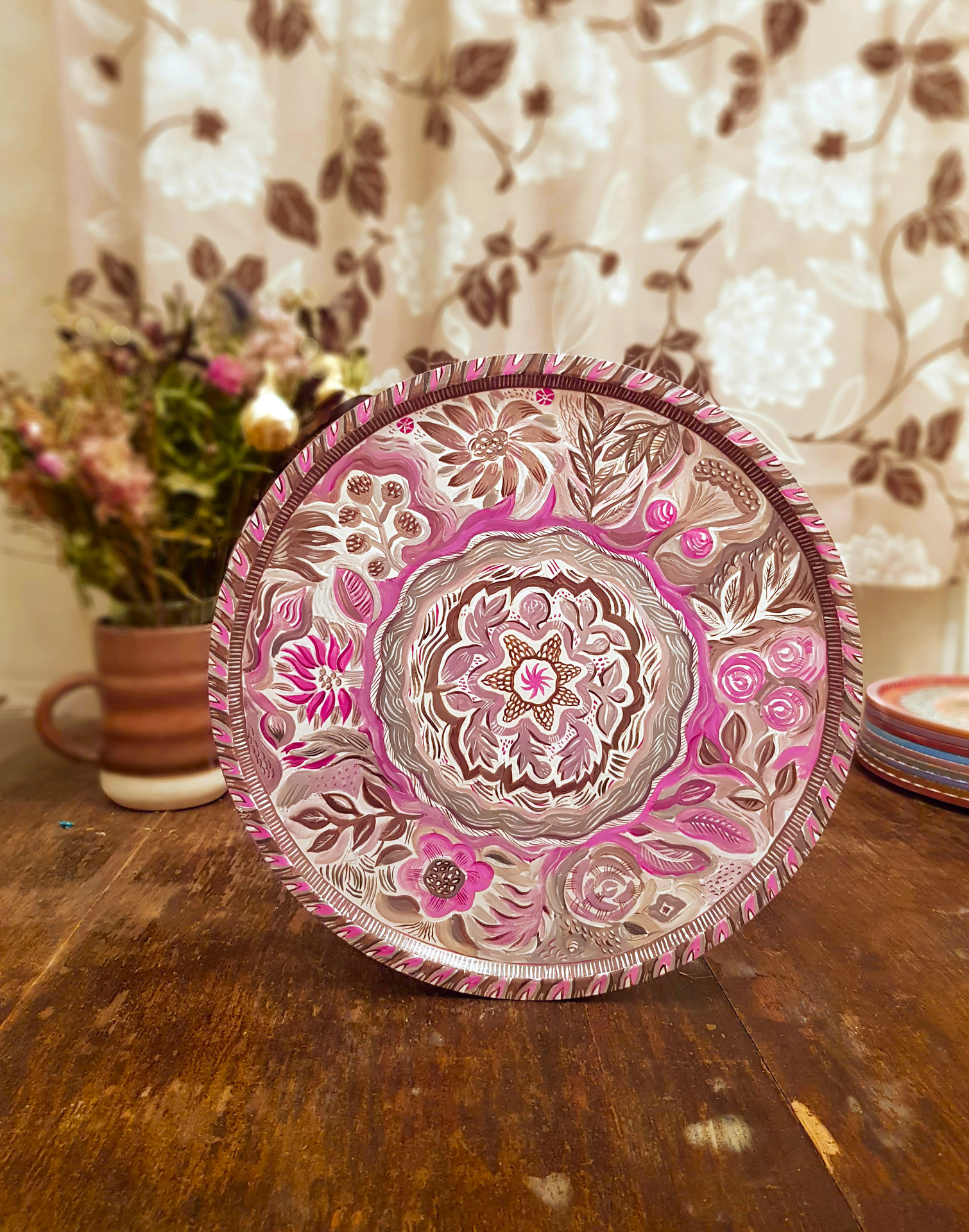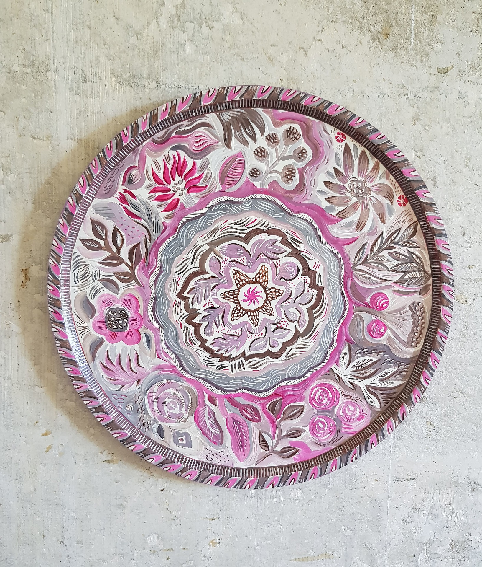 Декоративное панно с креплением на стену (как поднос не используется). Размер - 30 см в диаметре. Вещь существует в единственном экземпляре (работы не повторяются, рисую без эскизов - импровизирую). Можно аккуратно протирать влажной тряпочкой. Горячее ставить не рекомендуется, так как роспись выполнена акрилом.