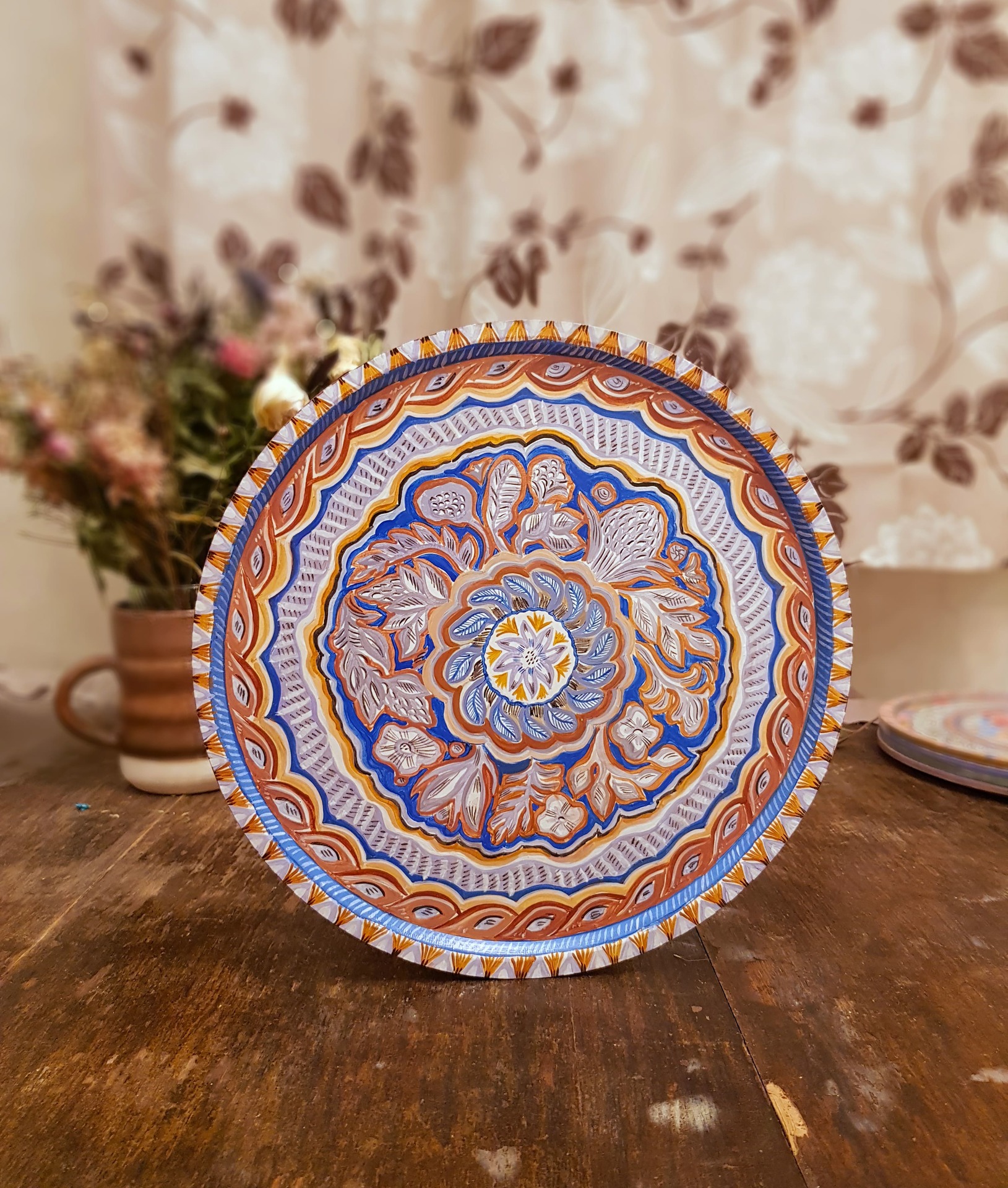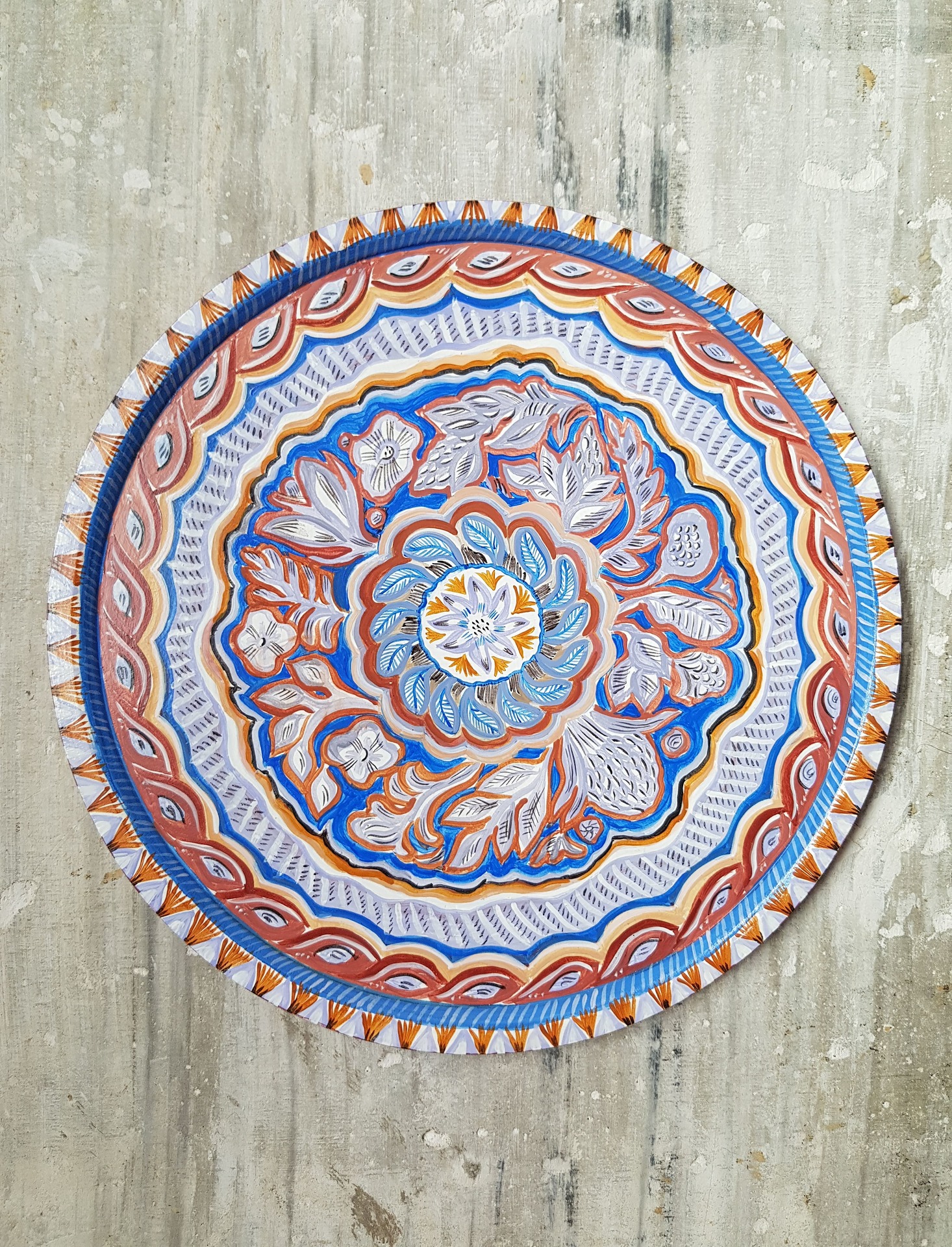 Декоративное панно с креплением на стену (как поднос не используется). Размер - 30 см в диаметре. Вещь существует в единственном экземпляре (работы не повторяются, рисую без эскизов - импровизирую). Можно аккуратно протирать влажной тряпочкой. Горячее ставить не рекомендуется, так как роспись выполнена акрилом.