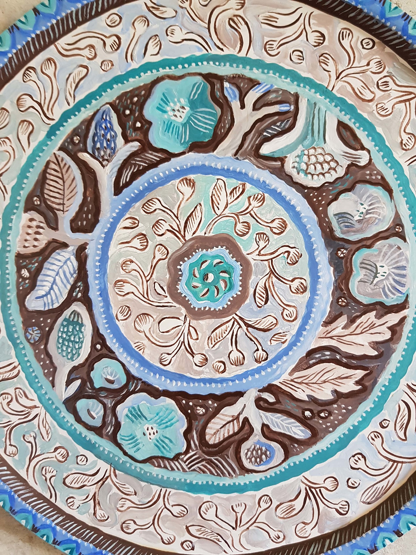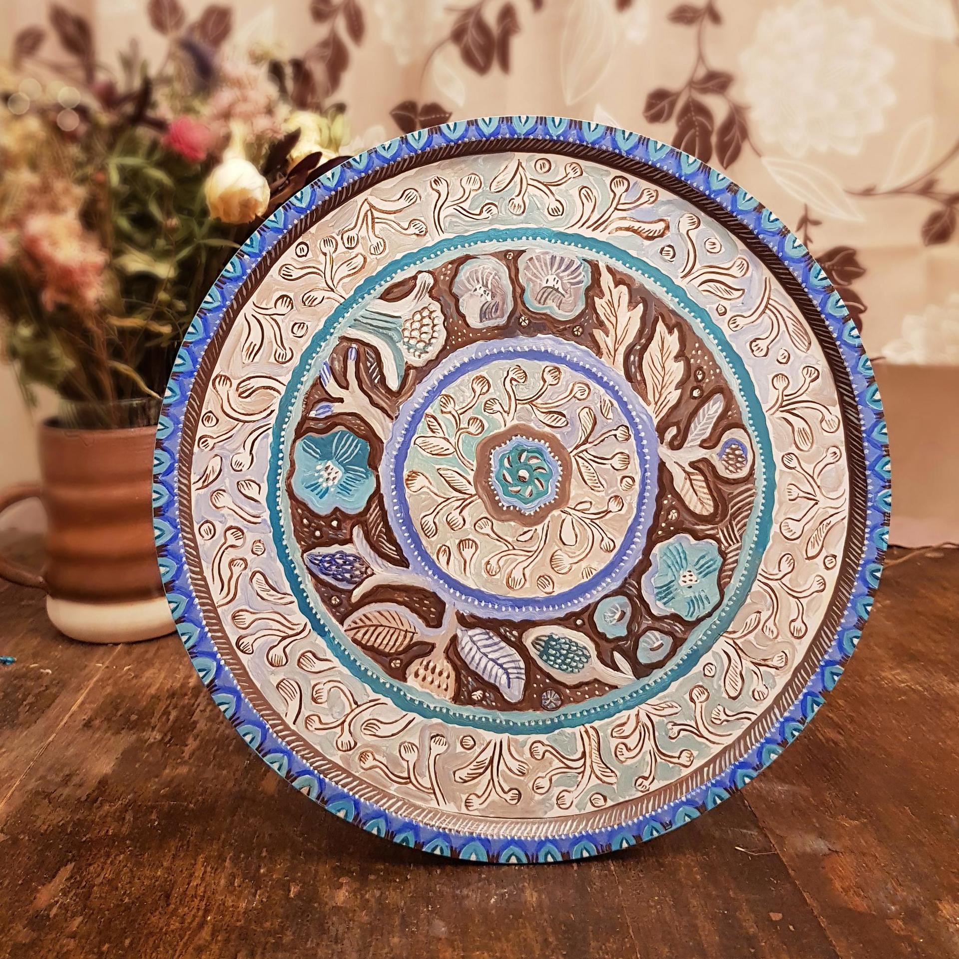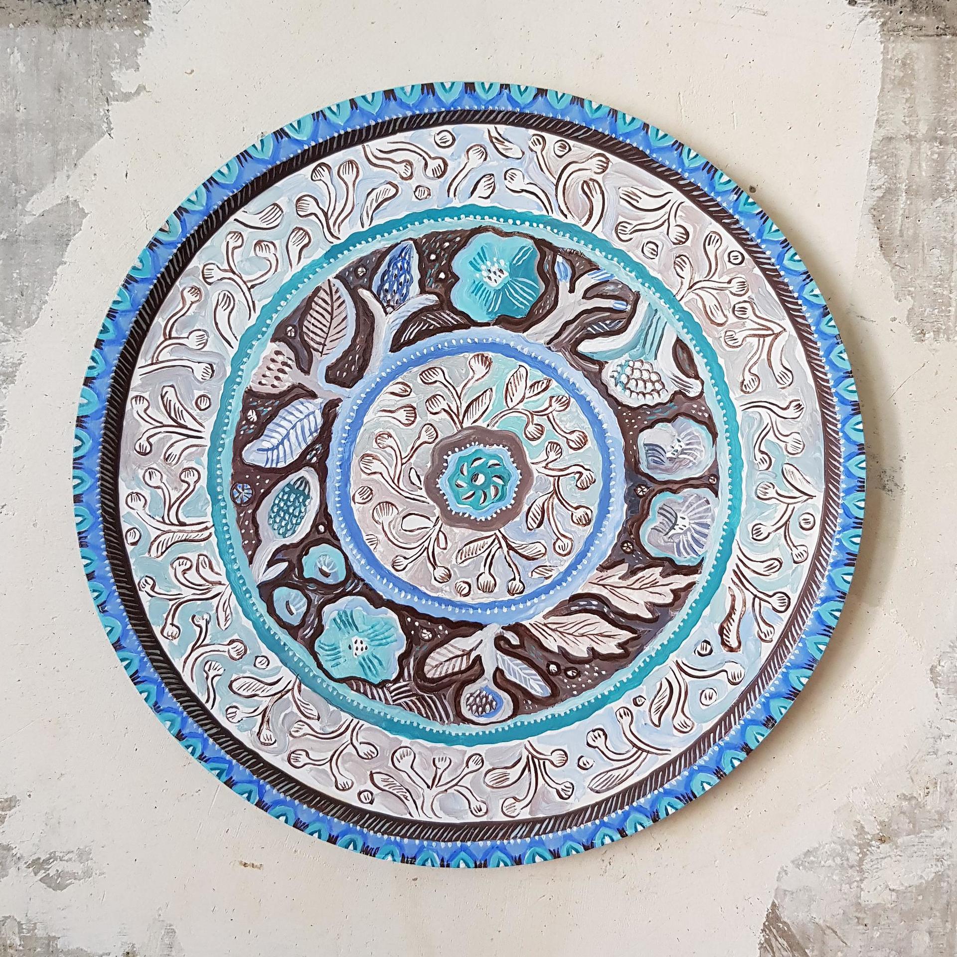 Декоративное панно с креплением на стену (как поднос не используется). Размер - 30 см в диаметре. Вещь существует в единственном экземпляре (работы не повторяются, рисую без эскизов - импровизирую). Можно аккуратно протирать влажной тряпочкой. Горячее ставить не рекомендуется, так как роспись выполнена акрилом.