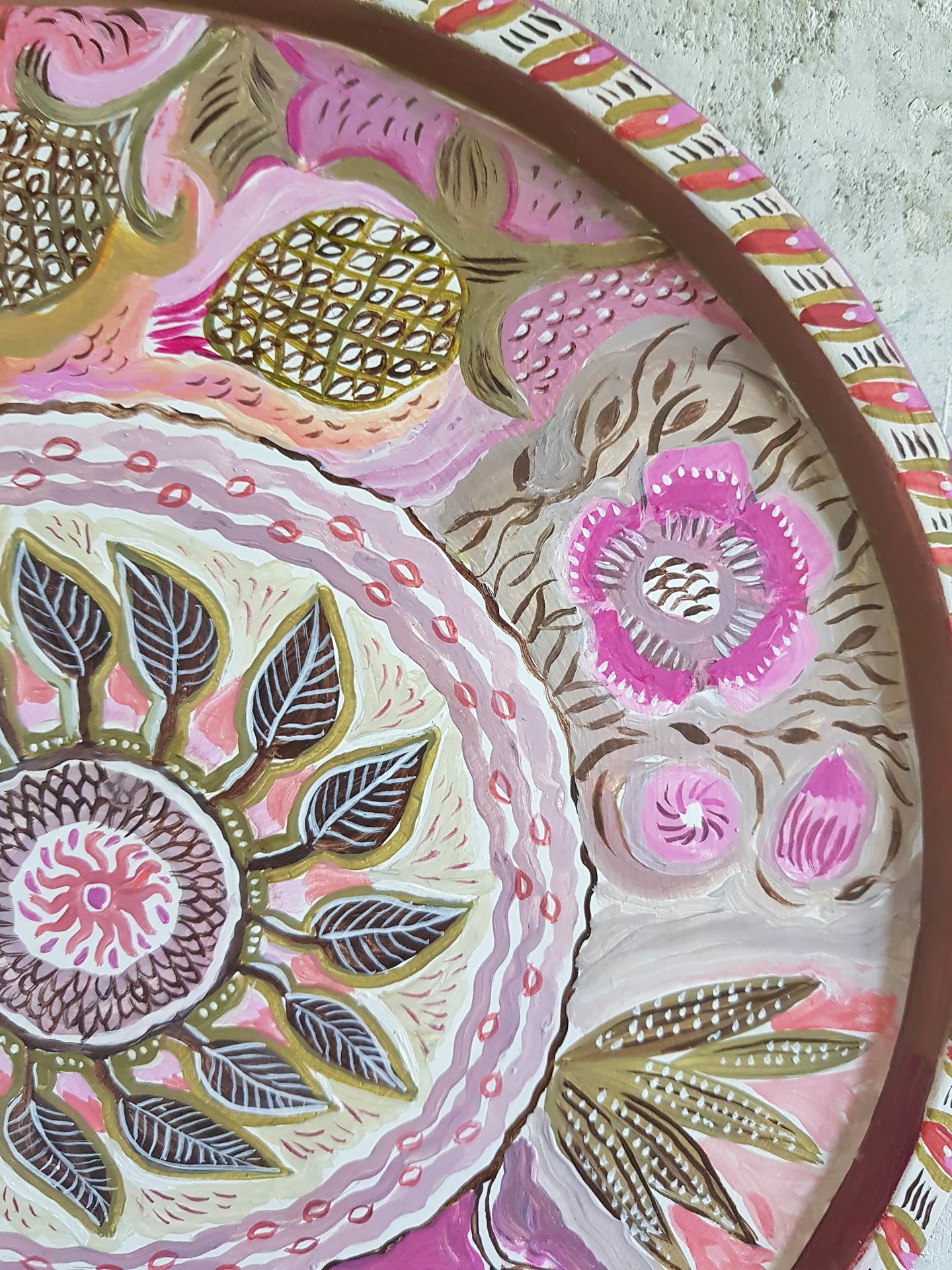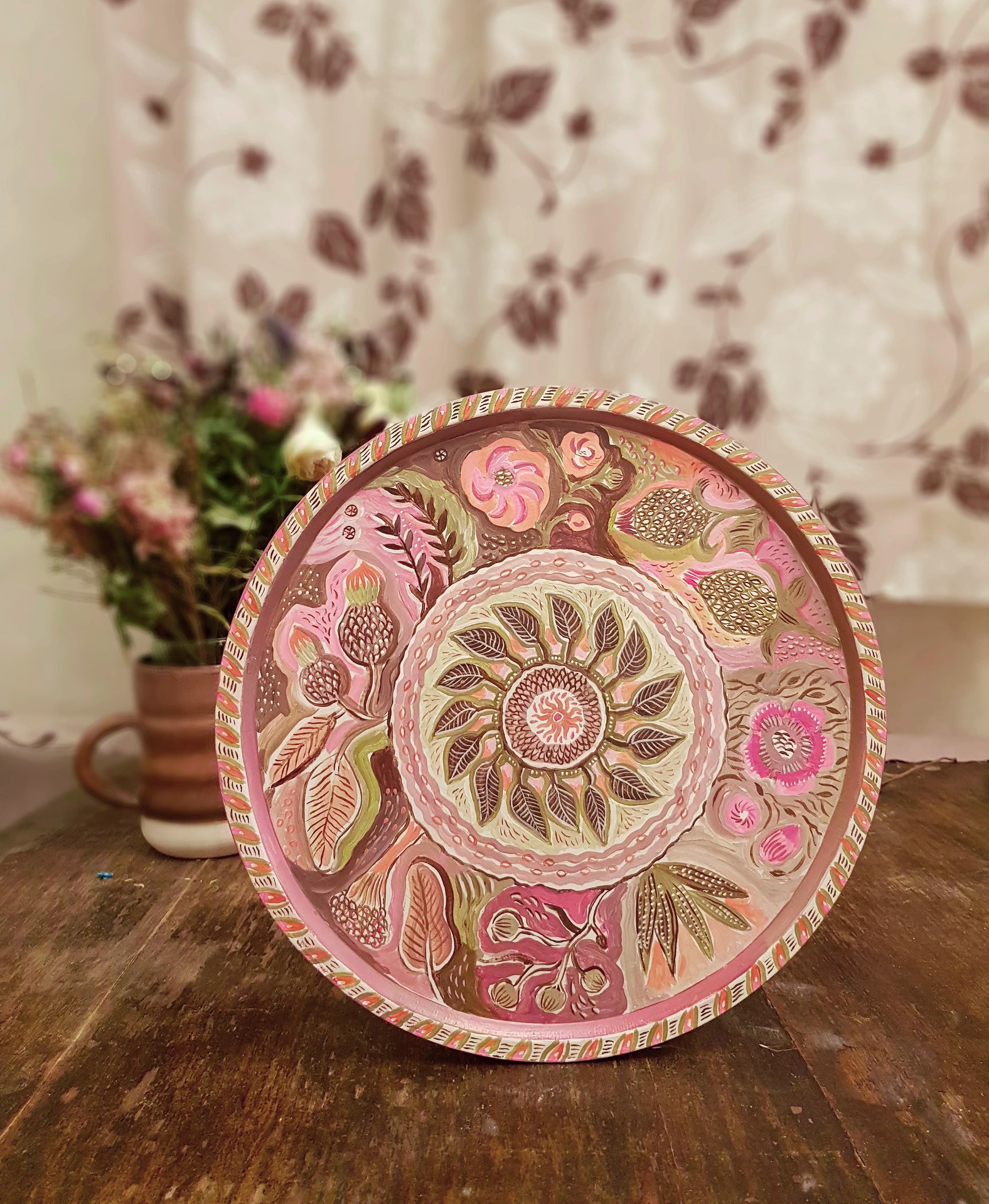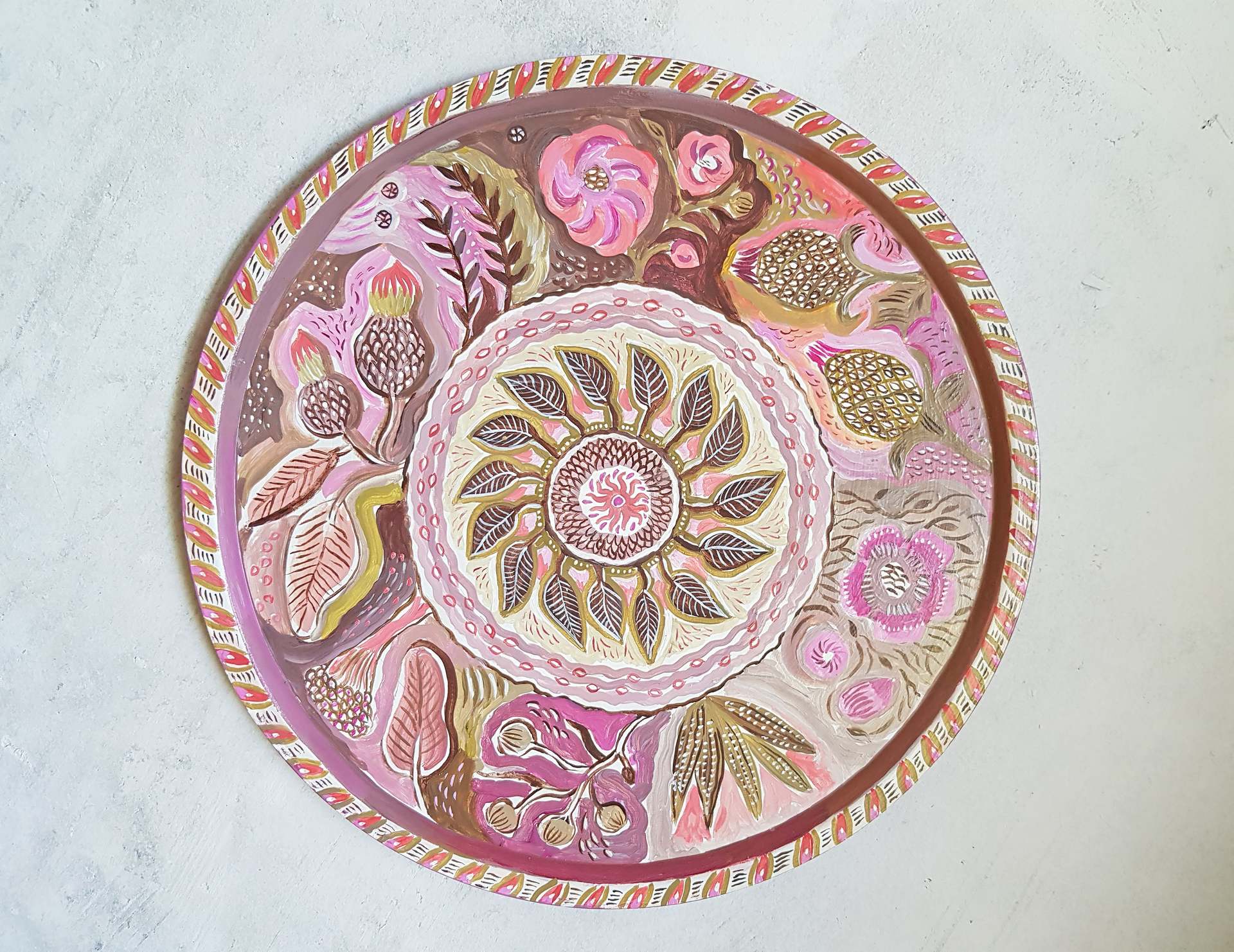 Декоративное панно с креплением на стену (как поднос не используется). Размер - 30 см в диаметре. Вещь существует в единственном экземпляре (работы не повторяются, рисую без эскизов - импровизирую). Можно аккуратно протирать влажной тряпочкой. Горячее ставить не рекомендуется, так как роспись выполнена акрилом.