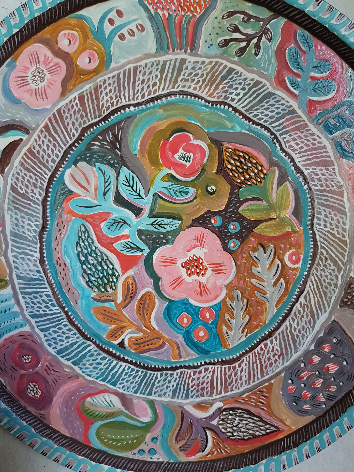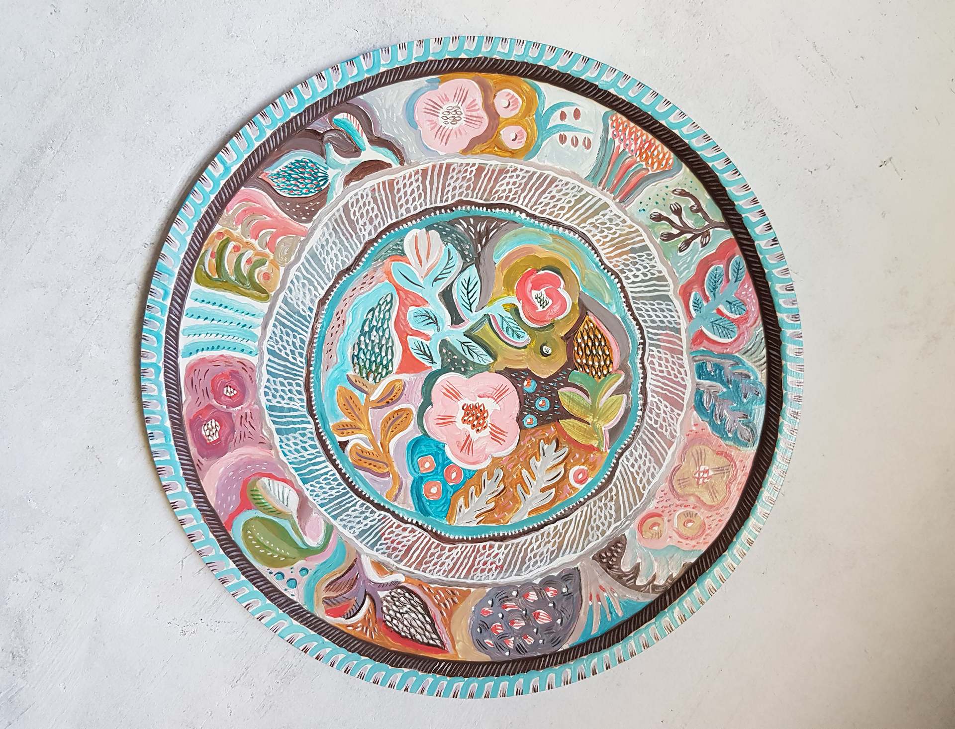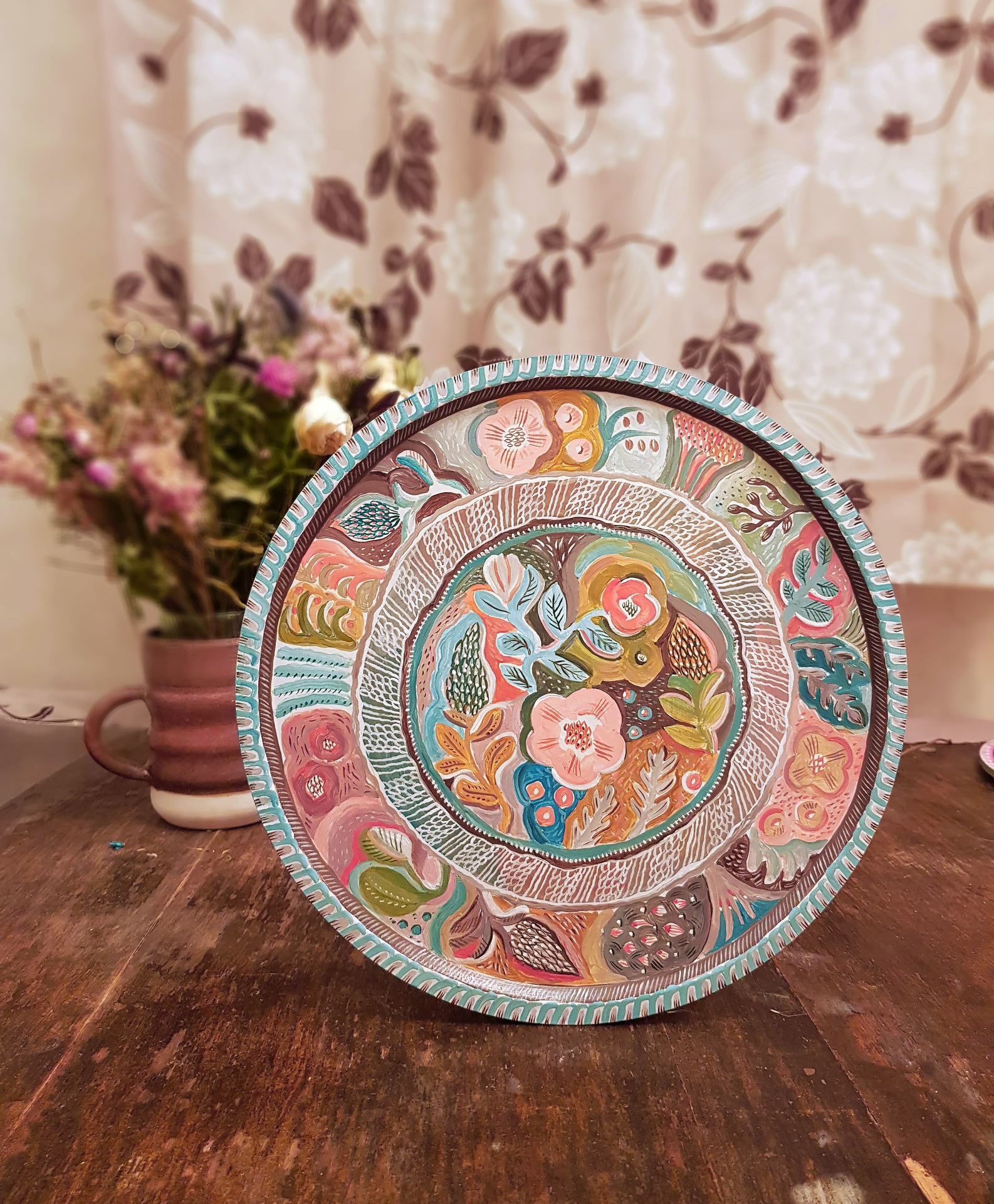 Декоративное панно с креплением на стену (как поднос не используется). Размер - 30 см в диаметре. Вещь существует в единственном экземпляре (работы не повторяются, рисую без эскизов - импровизирую). Можно аккуратно протирать влажной тряпочкой. Горячее ставить не рекомендуется, так как роспись выполнена акрилом.