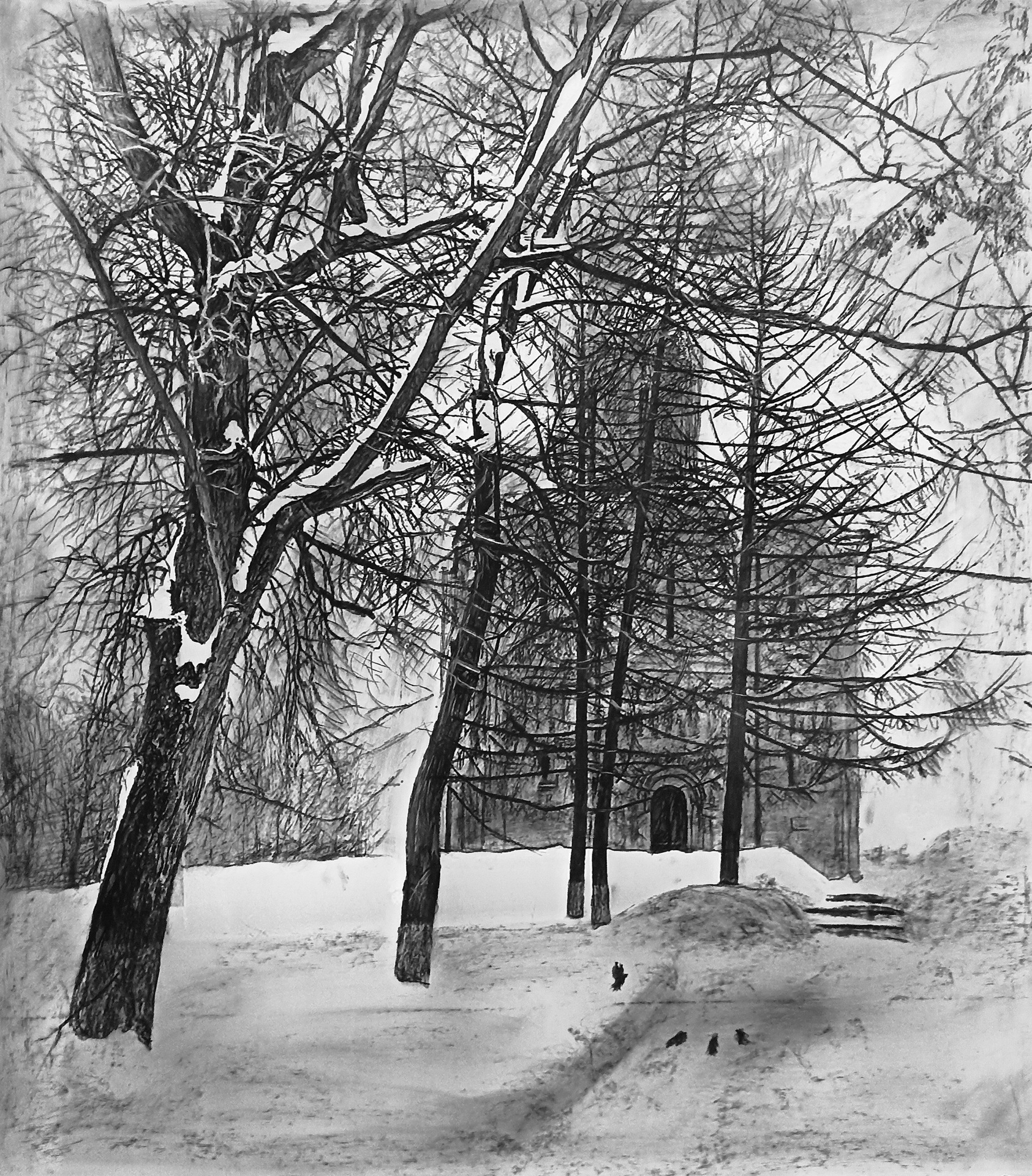 город, храм, реализм, зима, пейзаж, графика
