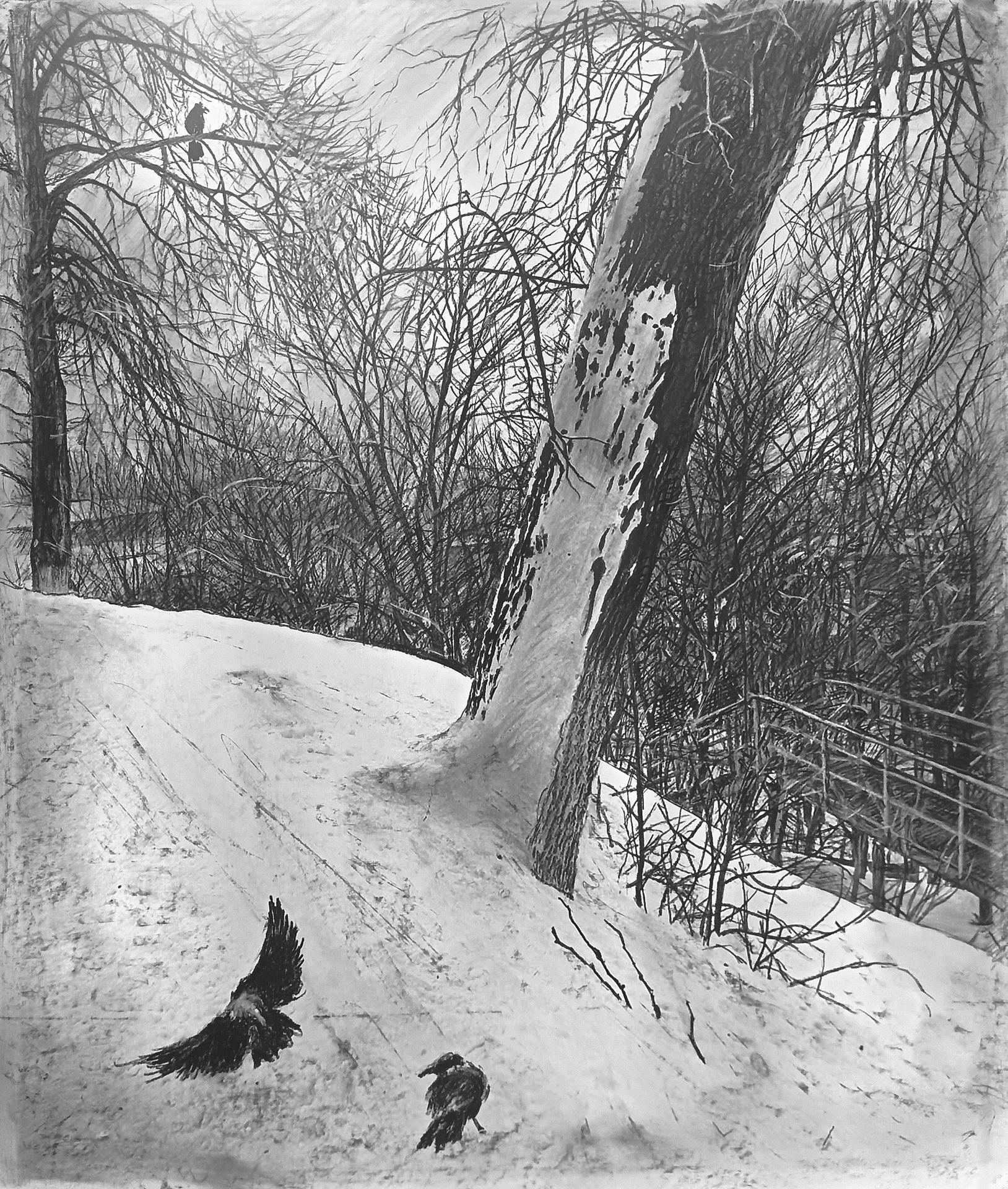 город, дворы, реализм, птицы, пейзаж, графика, зима