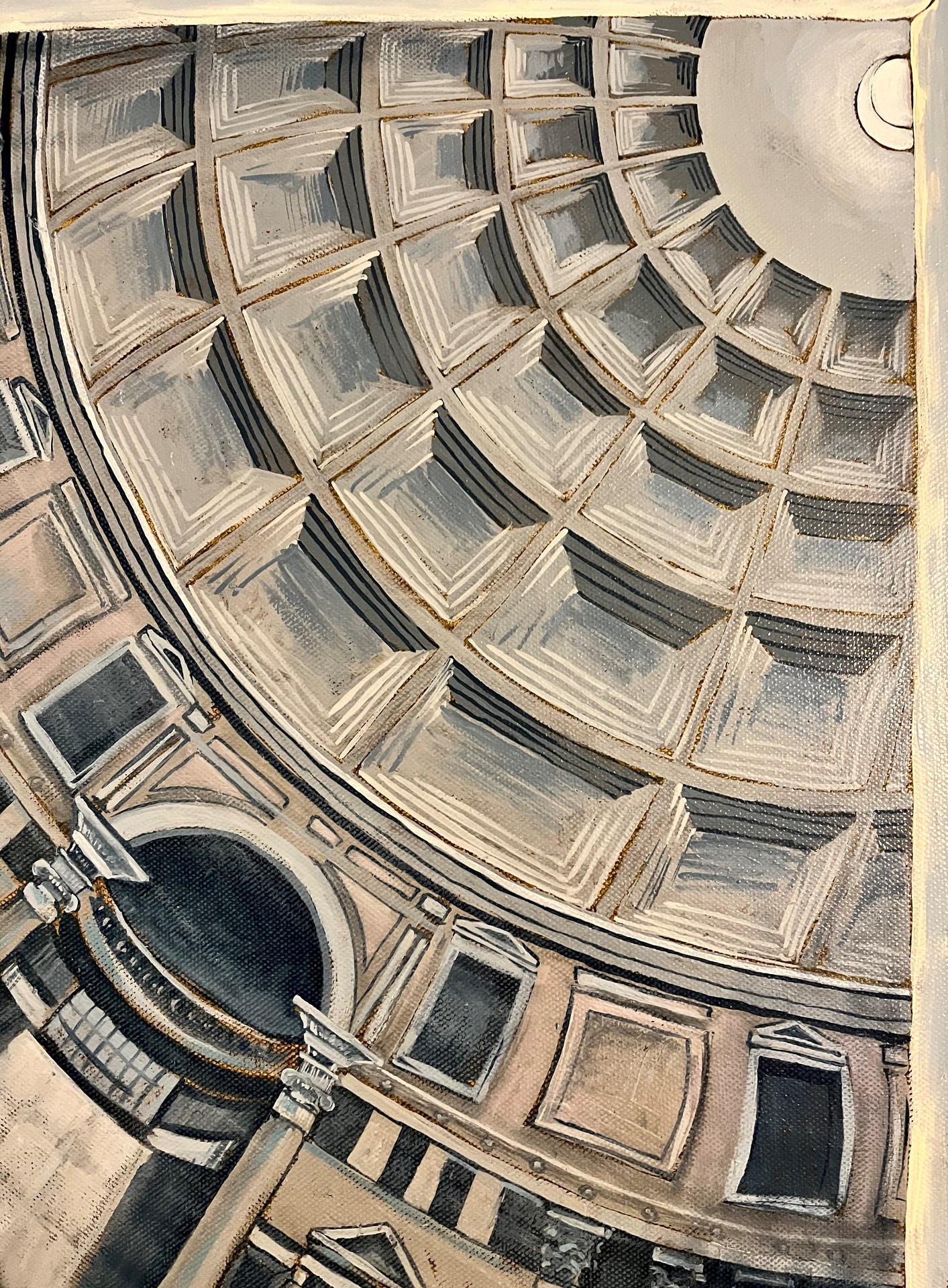 В одной из книг Паолы Волковой я прочитала об архитектуре римского Пантеона. Сегодня это церковь Санта-Мария Ротонда. Но задуман он был как храм всем богам. И это нашло отражение во внутреннем убранстве. Между первым и вторым ярусом расположены слепые ниши-окна. «Алтари у всех разные, а вот окна, обращенные внутрь самих себя, едино-ценностны для всех. Едины для всех этические ценности внутреннего порядка на всех языках и во всех традициях» Я прониклась этой идеей, в этой жизненной точке мне очень важна возможность взглянуть на себя и понять, что я за человек. Нужно обладать огромной смелостью и мужеством чтобы посмотреть в свои глаза. В своей работе в окне я изобразила интерьер римского Пантеона. Окна, обращенные внутрь самих себя. Приглашение… Обрати свой взор внутрь себя и смотри; если ты еще не видишь в себе красоты, поступай как скульптор, придающий красоту статуе: он убирает лишнее, обтачивает, полирует, шлифует до тех пор, пока лицо статуи не станет прекрасным; подобно ему, избавляйся от ненужного, выпрямляй искривления, возвращай блеск тому, что помутнело, и не уставай лепить свою собственную статую до тех пор, пока не засияет Божественный блеск добродетели (I 6.9.7). Плотин «Эннеады» Мы приходим в этот мир как заготовки, а станем ли мы прекрасным творением зависит только от нас. От нашего желания взглянуть в свое окно.