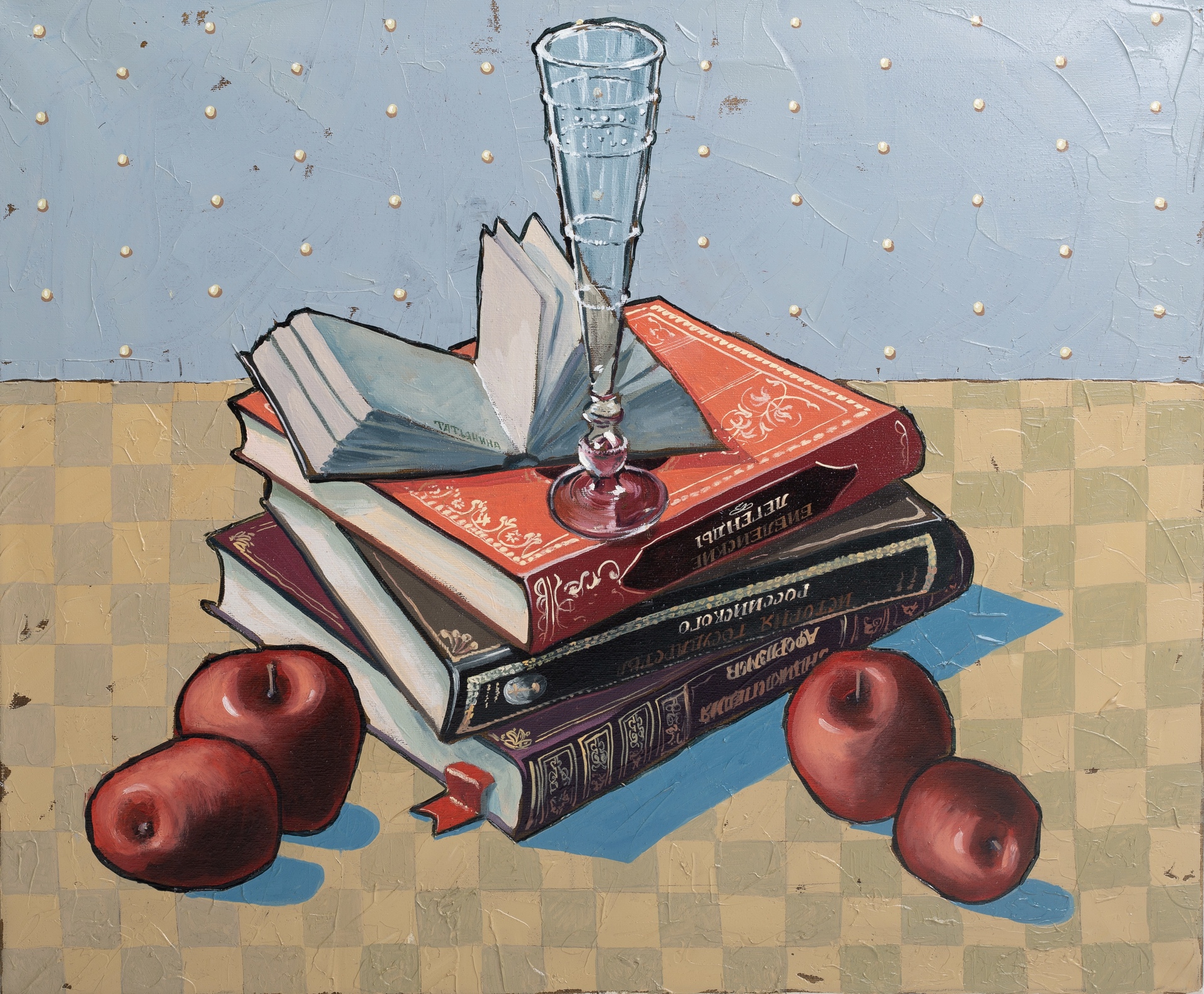 Натюрморт с красными яблоками, как известно яблоки символизируют и знания, и молодость, и мудрость, и любовь, и искушение...Остальные предметы натюрморта подчеркивают эти символические значения