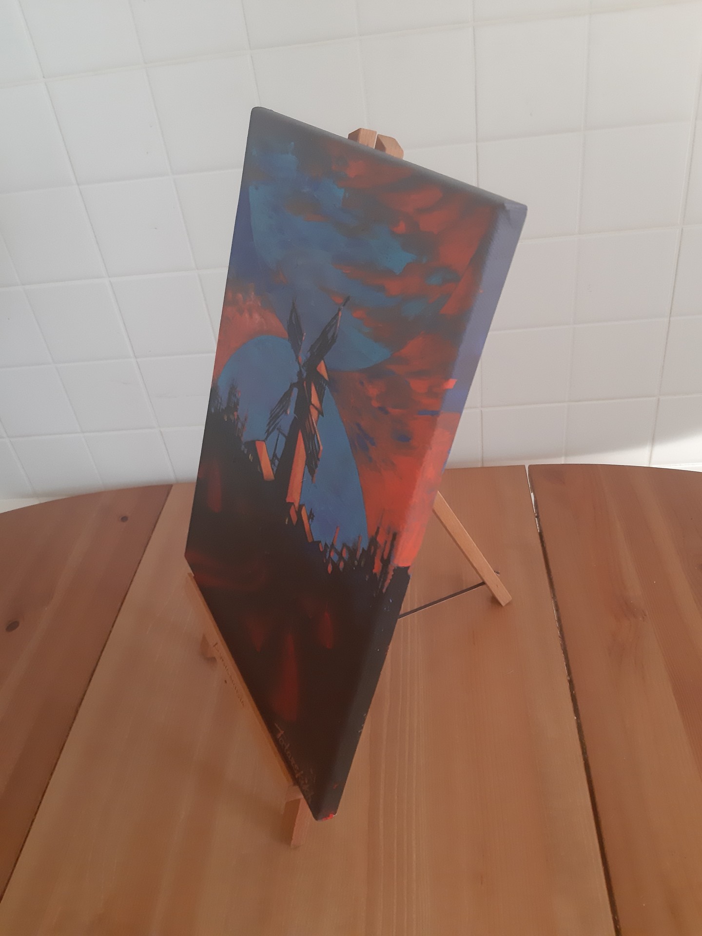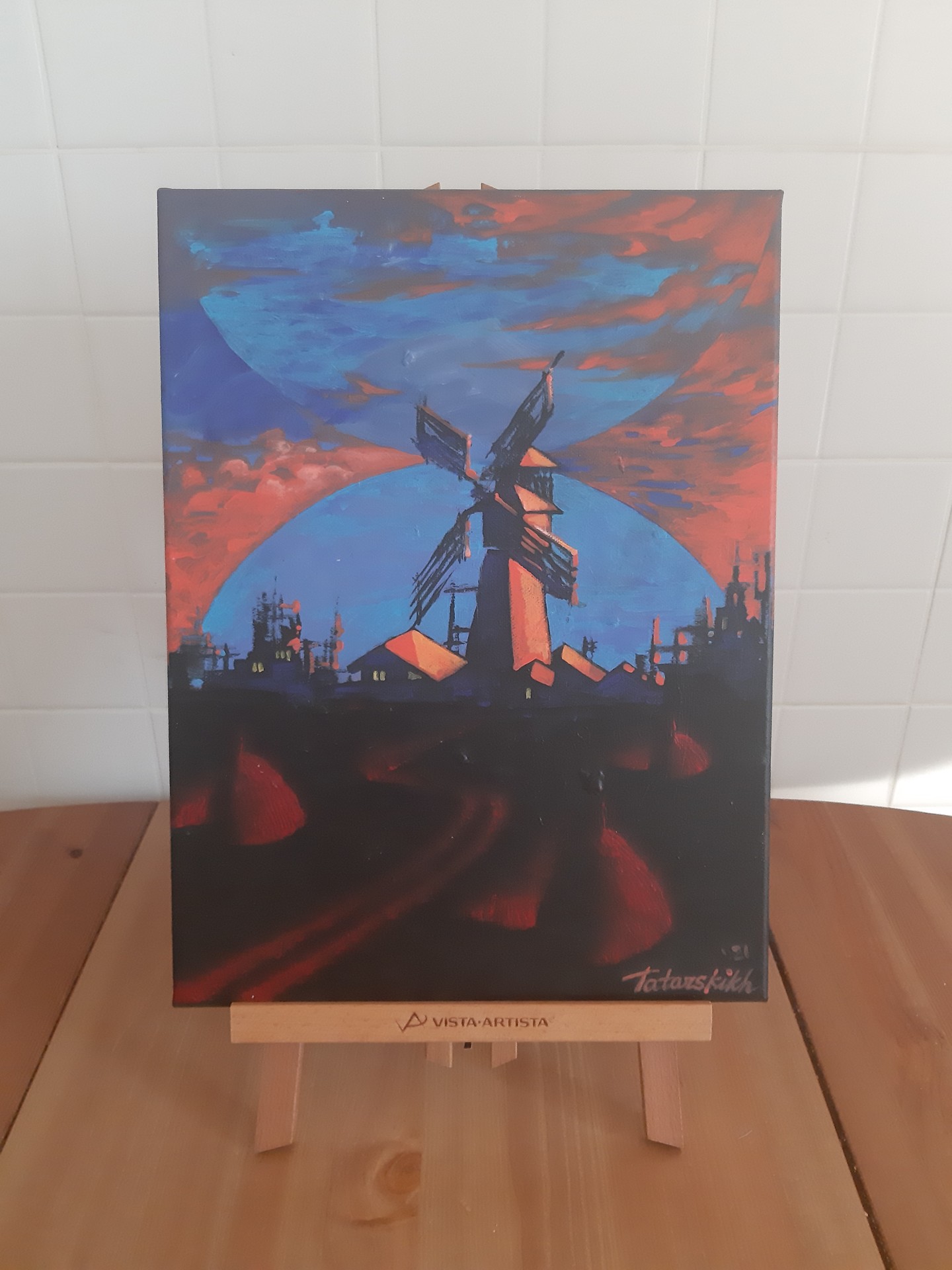 Холст 40х30см на подрамнике (2см), уютных размеров. "Мельница, как призрак человеческой жизни и её деятельности, что перемалывает, секунда за секундой, время, отпущенное Нам на земле. И красные снопы под садящимся солнцем есть олицетворение тех, кто был до Нас..." Доставка не входит в тсоиомсть.