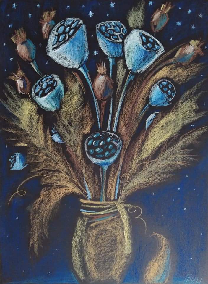 Работа выполнена в технике сухой пастели на пастельной бумаге.