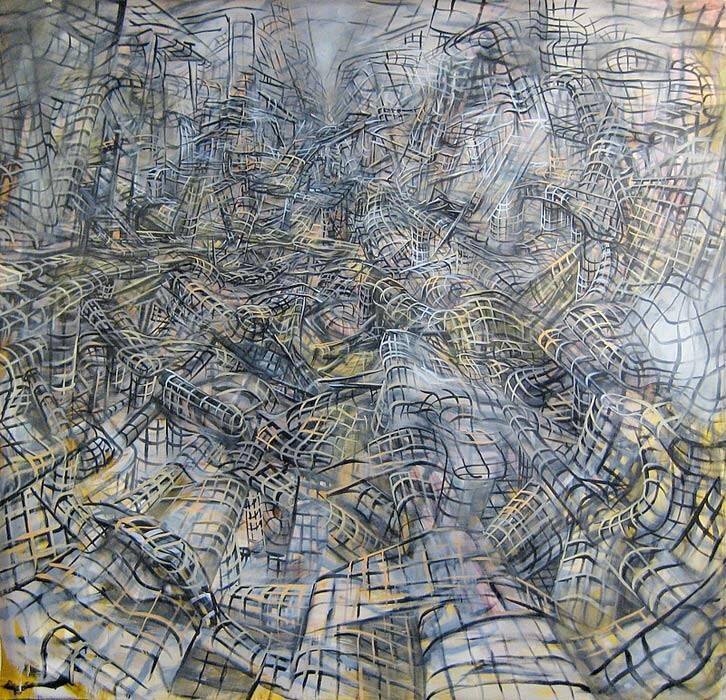 Эта одна из оставшихся работ из серии "Структуры". Серия создавалась на чердаке. Вблизи от моего дома строили мэрию. Я слышал звук забиваемых свай и ужасно страдал. Чтоб отвлечь себя от звука я начал рисовать. Вдруг я услышал музыку и рука начала её записывать. Такое ощущение складывалось, будто я попал на инопланетную станцию, где шли какие то масштабные работы. Рука с кисточкой сама ходила по холсту. Монстры других вселенных обступали меня, шли мерным шагом. Бум бум бум Строительство продолжалось шесть месяцев. Я слышал разные звуки и интерпретировал у себя в голове на свой манер. Так вышла серия инопланетных конструкций, индустриального пейзажа, станций и инопланетного храма .... Я выставлялся в Амстердаме, где продал три картины. Остальные в частных коллекциях. От этой серии осталось два холста.