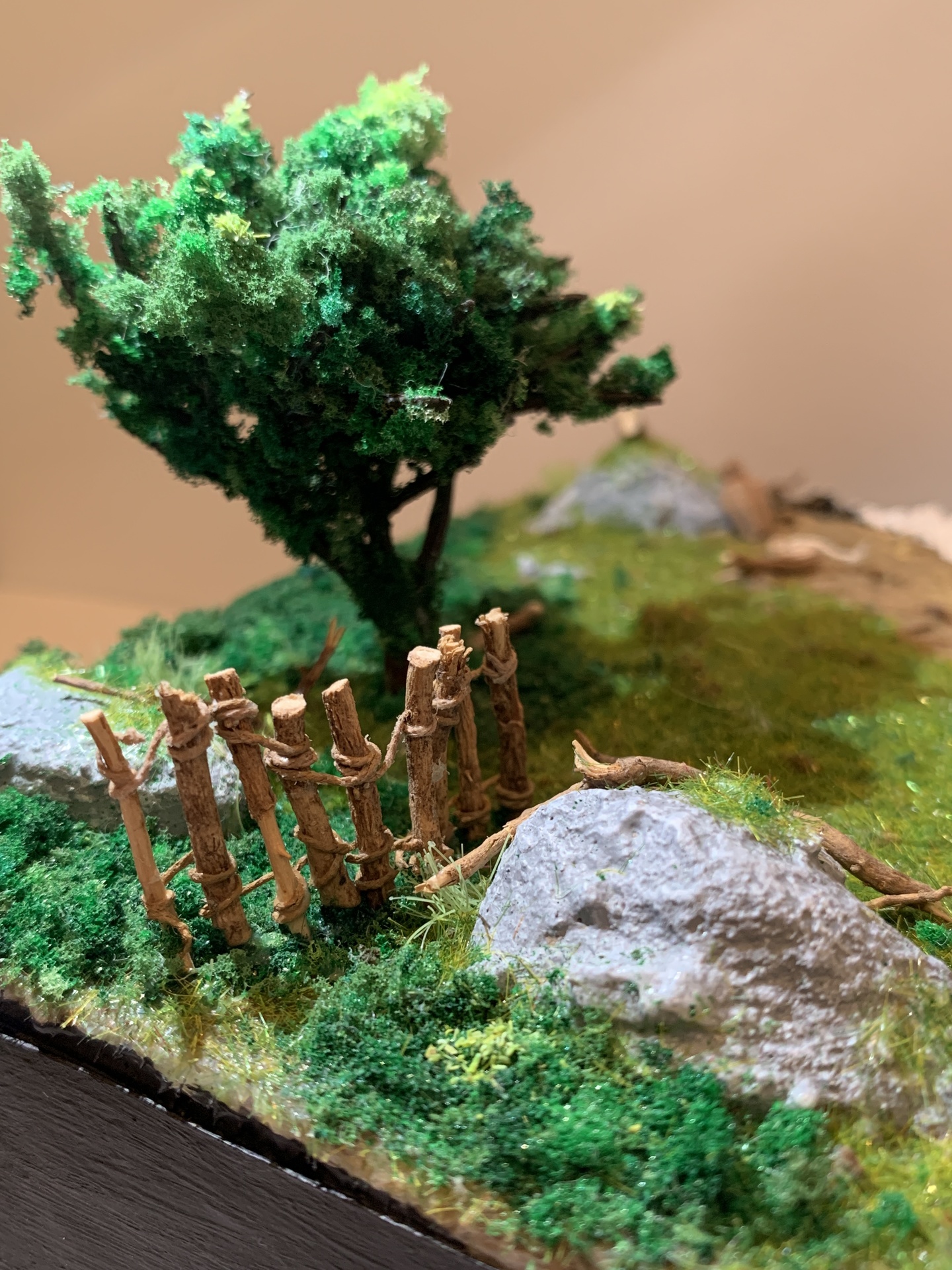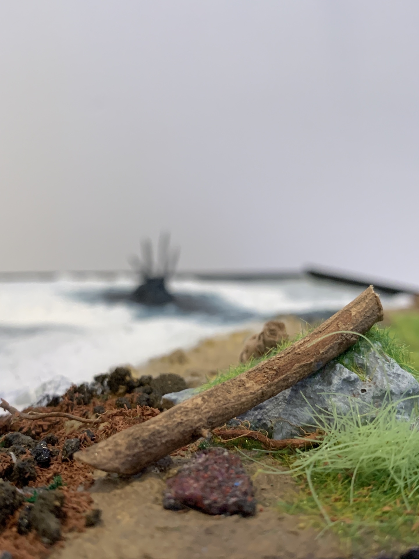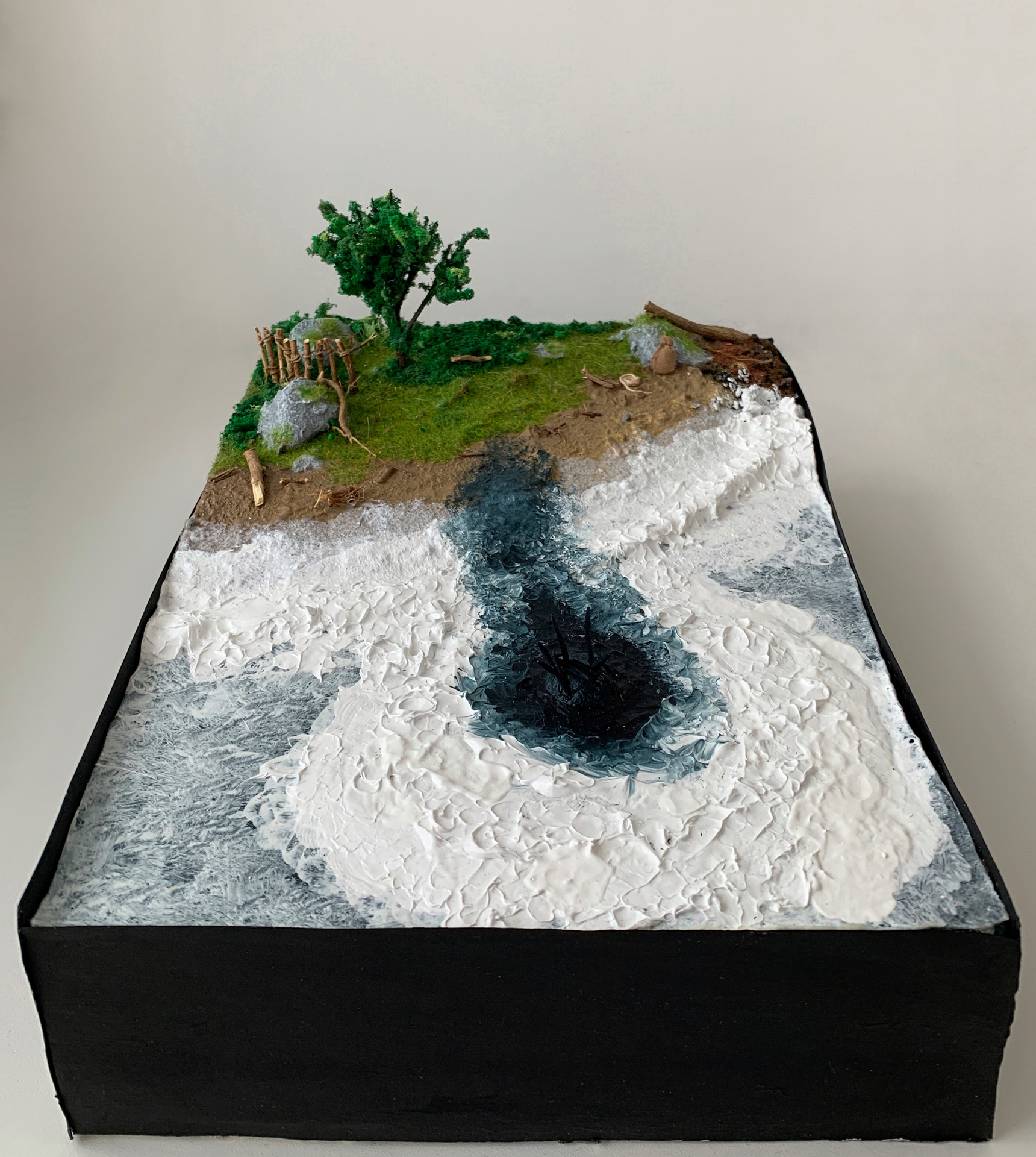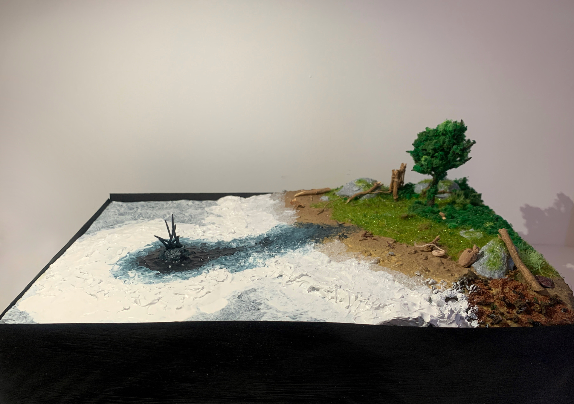 Художественно-скульптурный объект, макет местности, диорама. Работа посвящена произведению А.С. Пушкина: «Сказка о попе и о работнике его балде» 1830 г. Пенополистирол, дерево, бумага, акрил, эпоксидная смола, смешанная техника. Размер работы: высота 14 см., ширина 21 см., длина 30 см. Объект выполнен в масштабе: 1:87 Взглянув на объемное полотно, можно словно окунуться в сказку, ощутить себя на месте героя произведения, рассмотреть поле событий с разных ракурсов. Старорусский пейзаж отсылает к атмосфере русской сказки своими стилизованными элементами. Камни, на которых сидел балда на берегу, веревка, которую балда мочил в море, мешок с зайками, черт подплывающий к берегу и бушующий синее море. Персонажи, в лице балды и попа на пейзаже не присутствуют, в связи с надобностью передать ощущение присутствия на пейзаже, взаимодействия зрителя с ним, взамен ощущения наблюдения. Работа обрамлена черным цветом для создания эффекта «отрывка» части местности от простор русской земли и создании на нем акцента. При работе над объектом основная задача была передать атмосферу места, описанного в сказке.