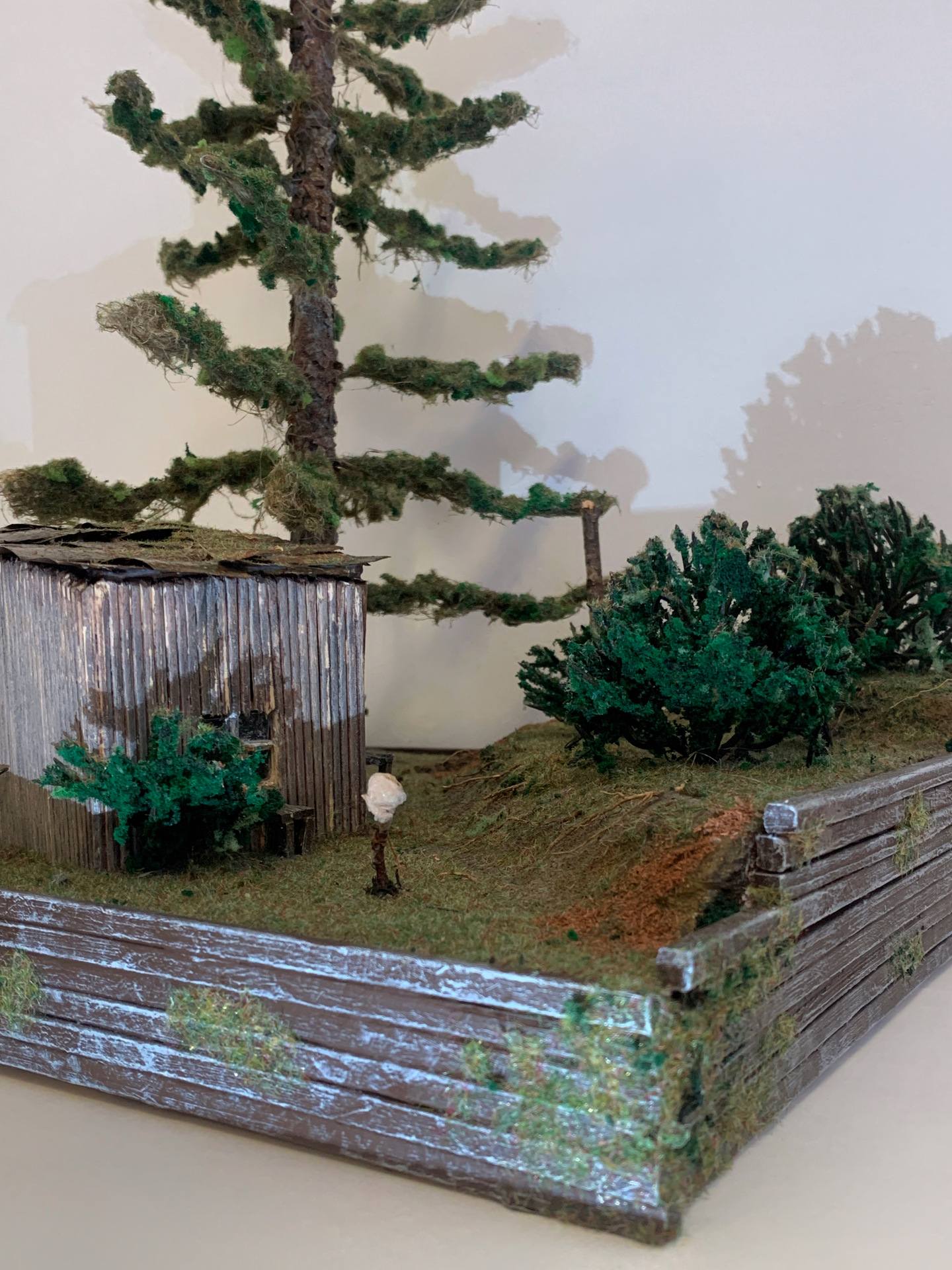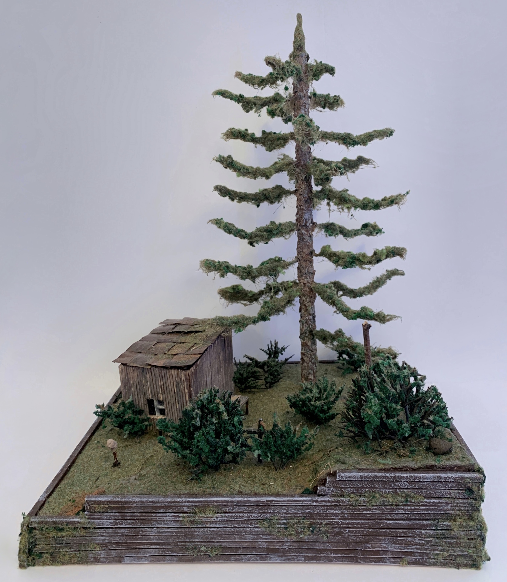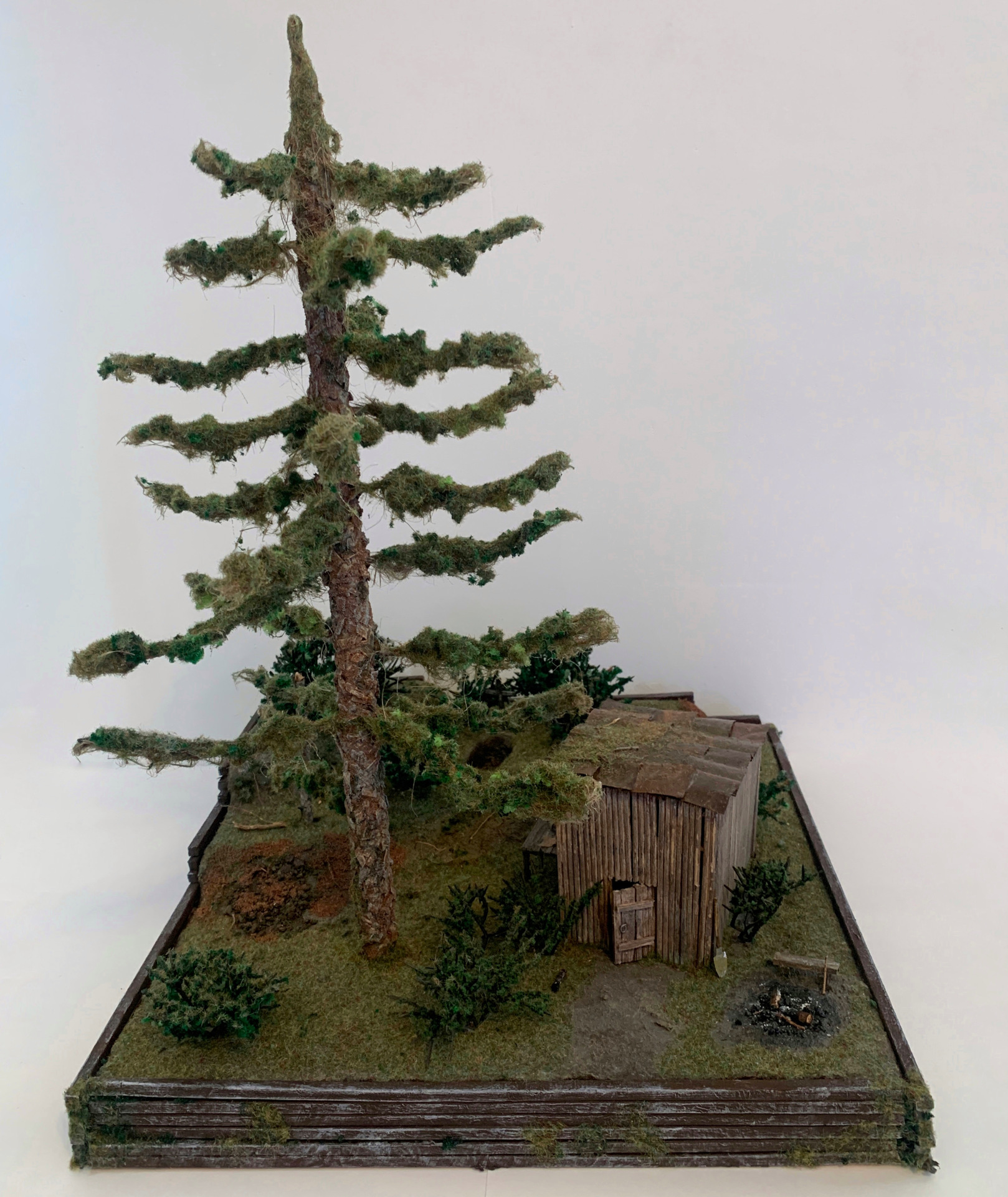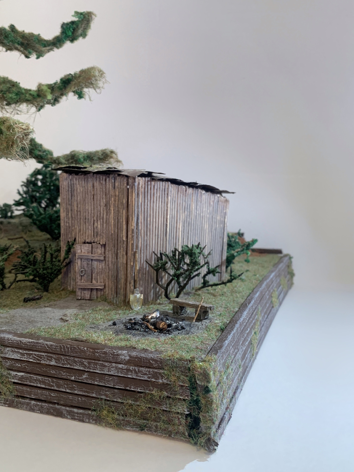 Художественно-скульптурный объект, макет местности, диорама. Пенополистирол, дерево, акрил, пластик, алюминий, смешанная техника. Размер работы: высота 47 см., ширина 36,5 см., длина 36 см. Объект выполнен в масштабе: 1:48 Объемное полотно переносит в одинокое, мрачное место, найденное посреди вечернего леса. Всегда интересно обнаружить заброшенные строения. Но возникает не только лишь чувство любопытства, но и легкая тревога, беспокойство. Рядом с забытой хижиной - кострище, неподалеку - яма с намогильным крестом, загадочный объект, возможно, не стоит отходить дальше. Объект обрамлен имитацией ветхого, поросшего мхом, дерева, создавая эффект заброшенности.