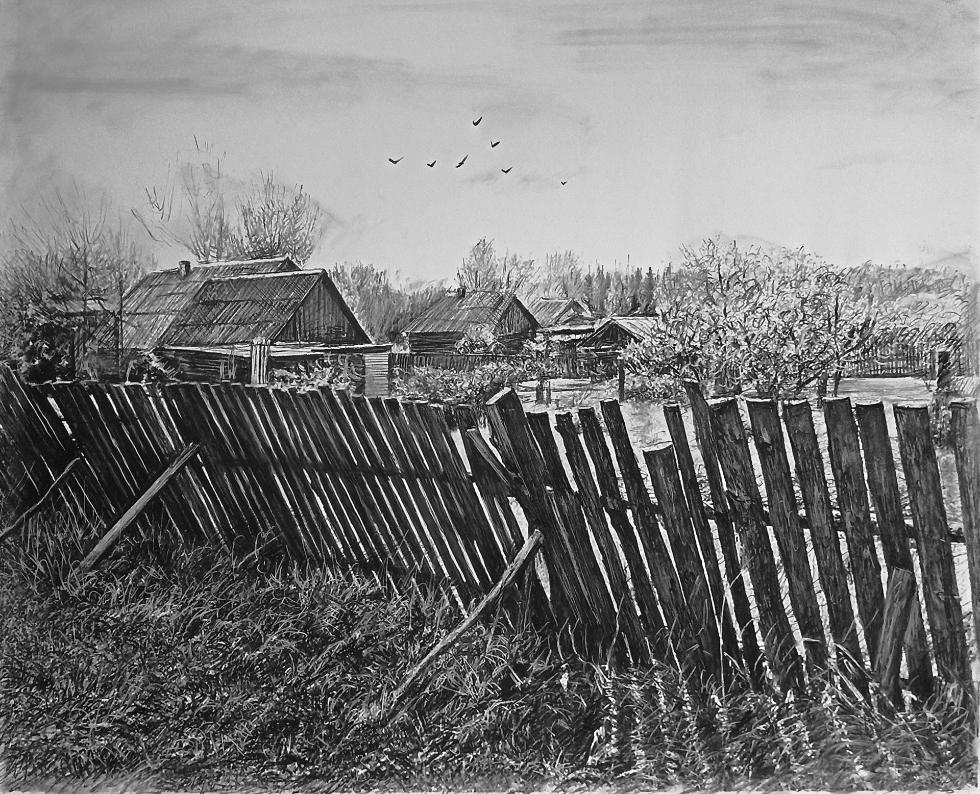 деревня, дворы, реализм, лето, пейзаж, графика