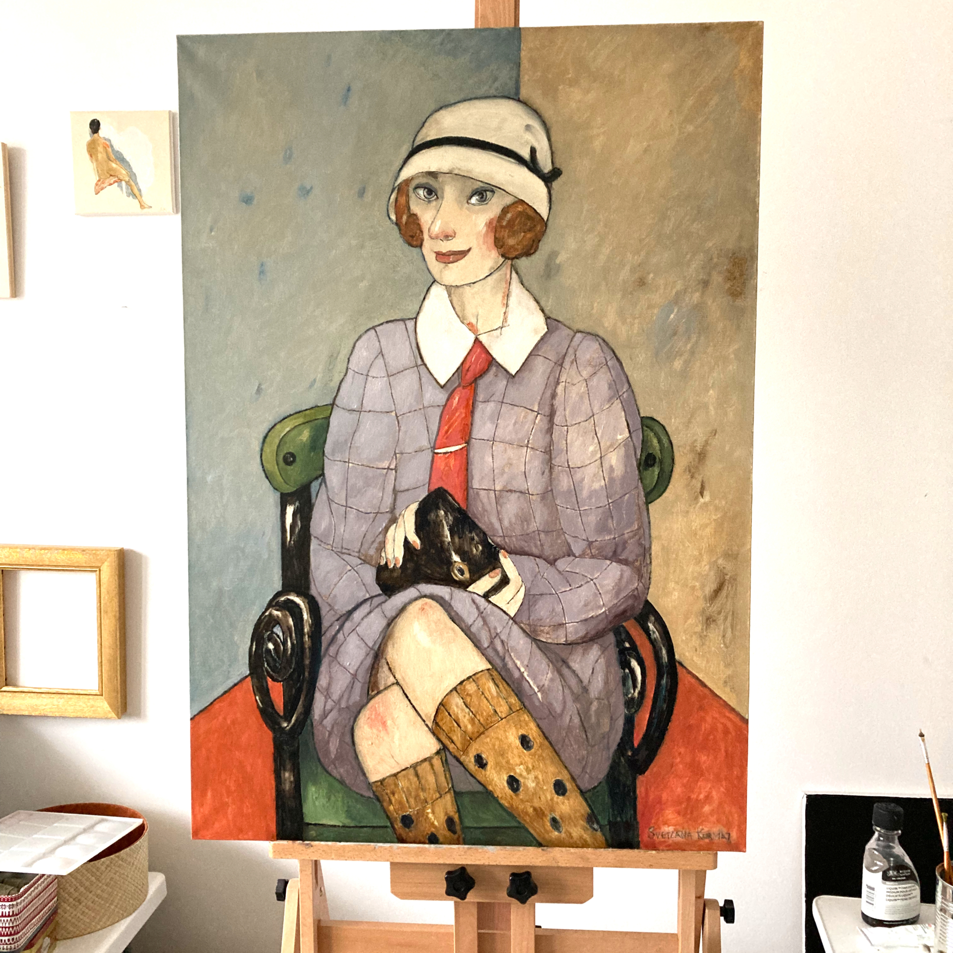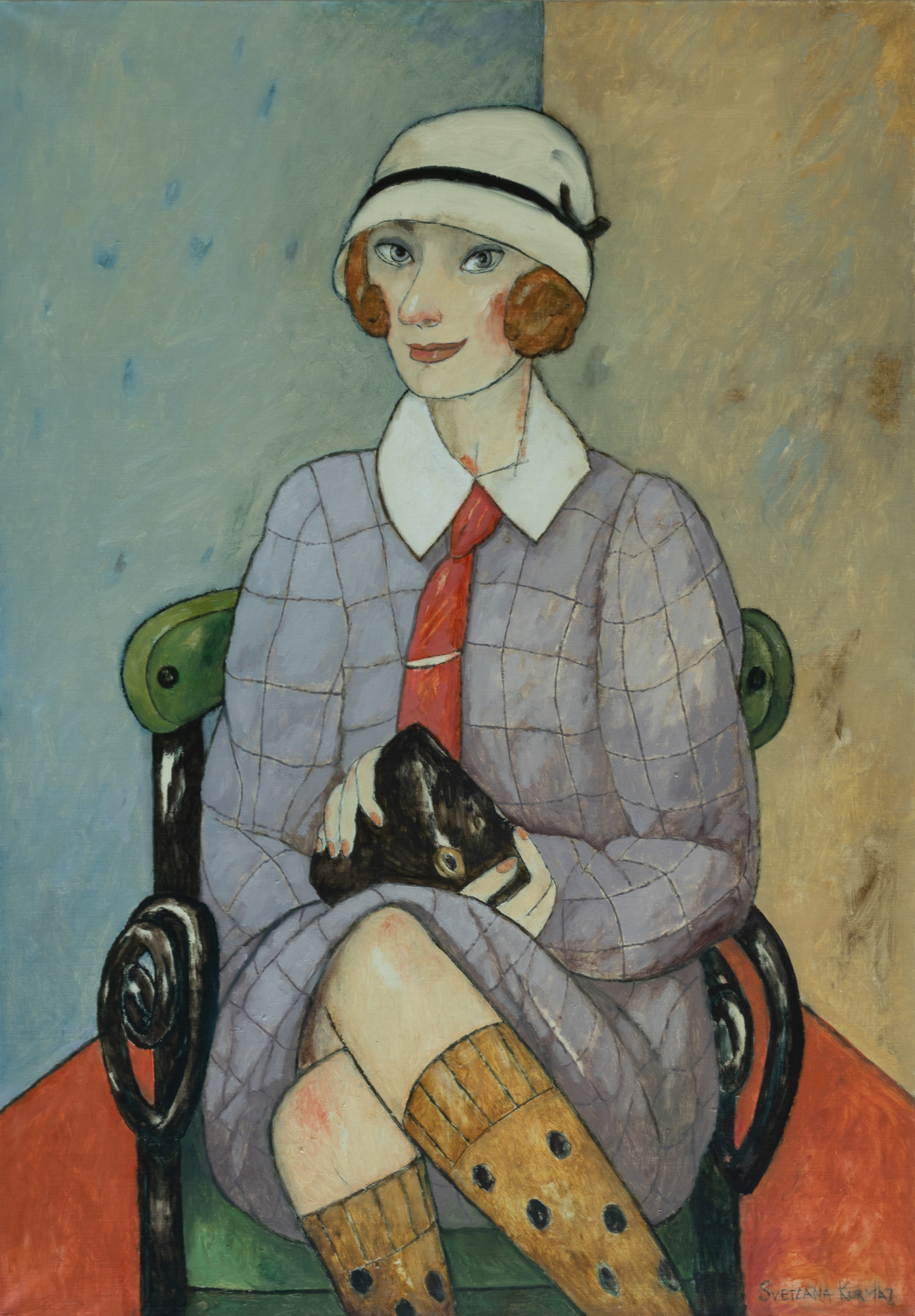 Стильная молодая леди комфортно расположилась в кресле, возможно в кафе или на лекции. В ее характере и одежде присутствует определенный оммаж к стилю 30х годов прошлого века. * Эта картина временно недоступна . Ее можно будет увидеть в экспозиции музея Алексея Толстого и приобрести после выставки.. "Сдержанный гламур, плавные линии, изящные силуэты и непринужденная крутизна — основные элементы лаконичного стиля Светланы Курмаз. Перенесенный через женственность элегантности 30-х годов двадцатого века в искусство, он становится определением современной романтики." ( анонс , галерея Singulart, France).