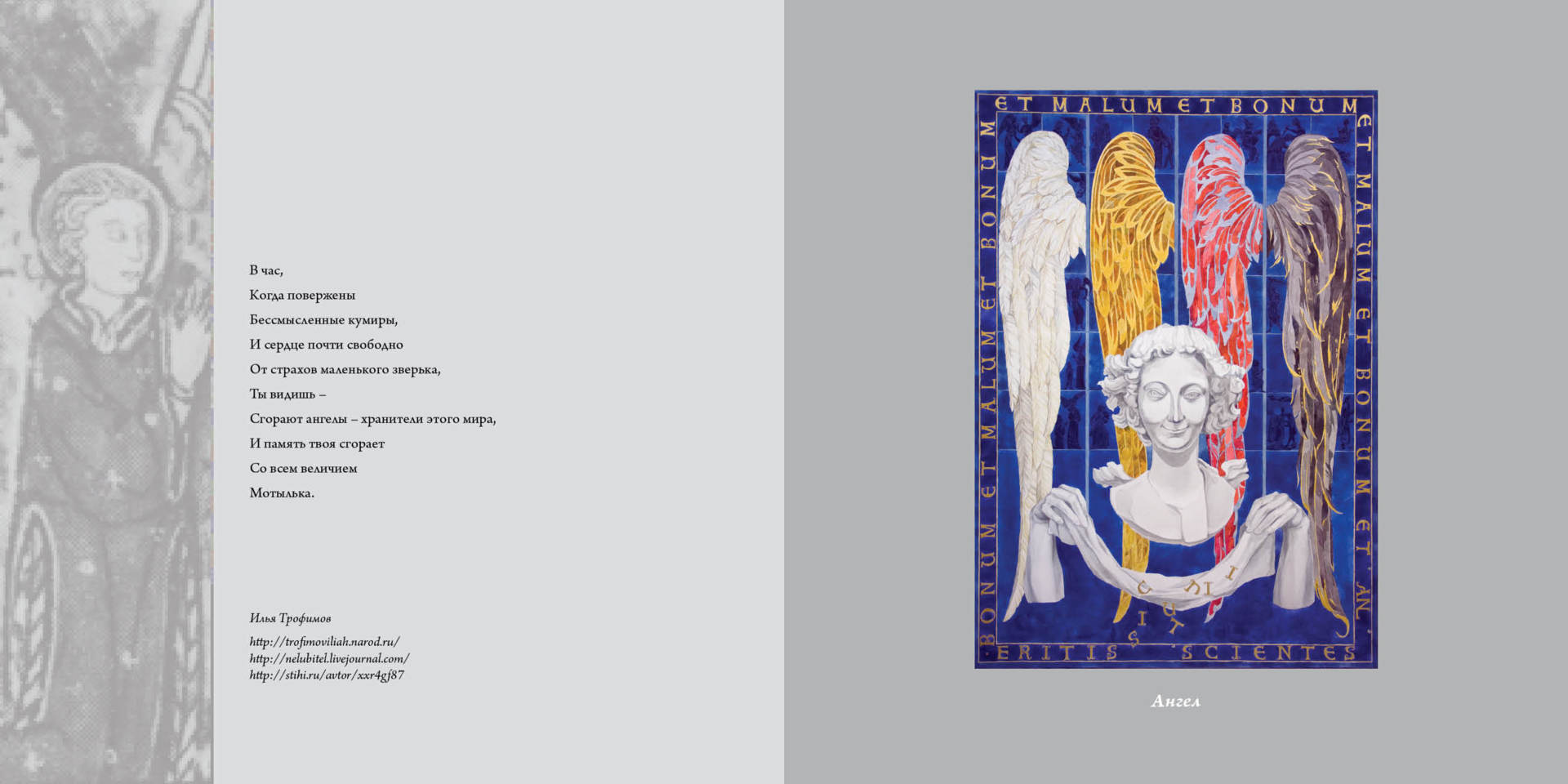 Работа из серии " 10 образов для вымышленной библиотеки". Для этого проекта автор попросил своих друзей, писателей и поэтов, специально сделать литературное сопровождение-впечатление. Обычно художник иллюстрирует литературу, здесь же произошёл обратный процесс. Этому образу посвятил своё стихотворение Илья Трофимов: В час, Когда повержены Бессмысленные кумиры, И сердце почти свободно От страхов маленького зверька, Ты видишь – Сгорают ангелы – хранители этого мира, И память твоя сгорает Со всем величием Мотылька.