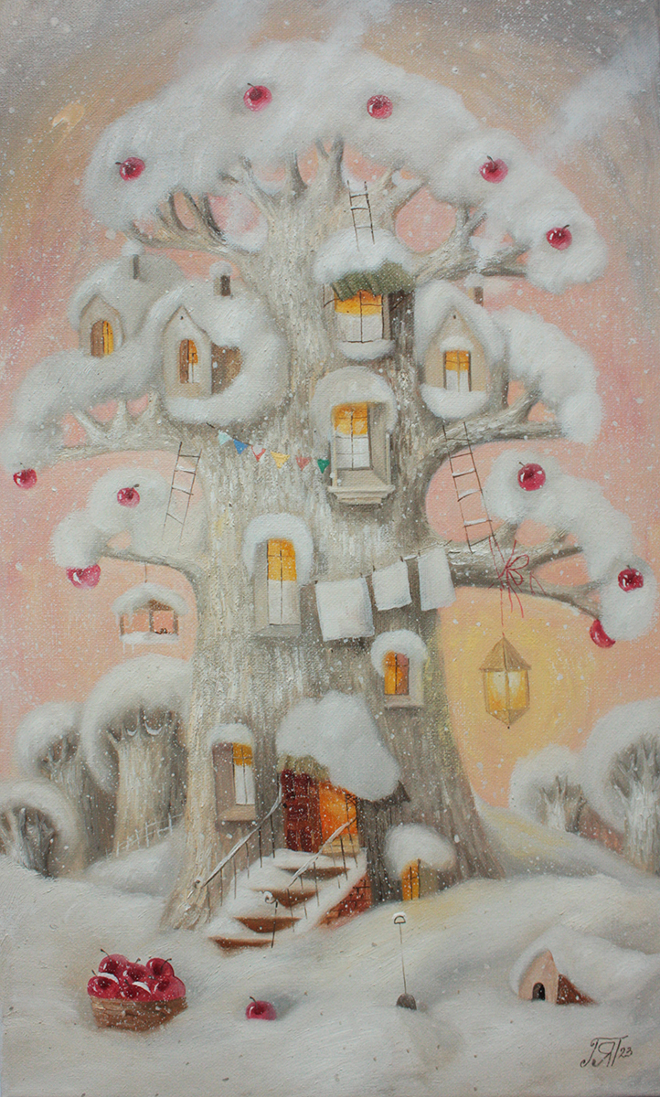Такая умиротворяющая тишина и благодать. Тепло и уют, гармония и любовь! Все есть в этих домиках. Пахнет дымком из печи, кто-то печёт пирог. Из соседнего окошка слышны детские голоса, смех и сказки. На улице безмолвно падает снег, укрывая лес мягким одеялом, а дома хорошо. Семья, разговоры и забота. Домики на дереве - это отсылка к чему-то детскому и беззаботно оставленному далеко в прошлом, но иногда всплывающему в наших воспоминаниях для того, чтобы наш мир окрашивался в добро и счастье. ~~~~~ «Сказочный дом» холст масло 50/25 см. Чек выдаю