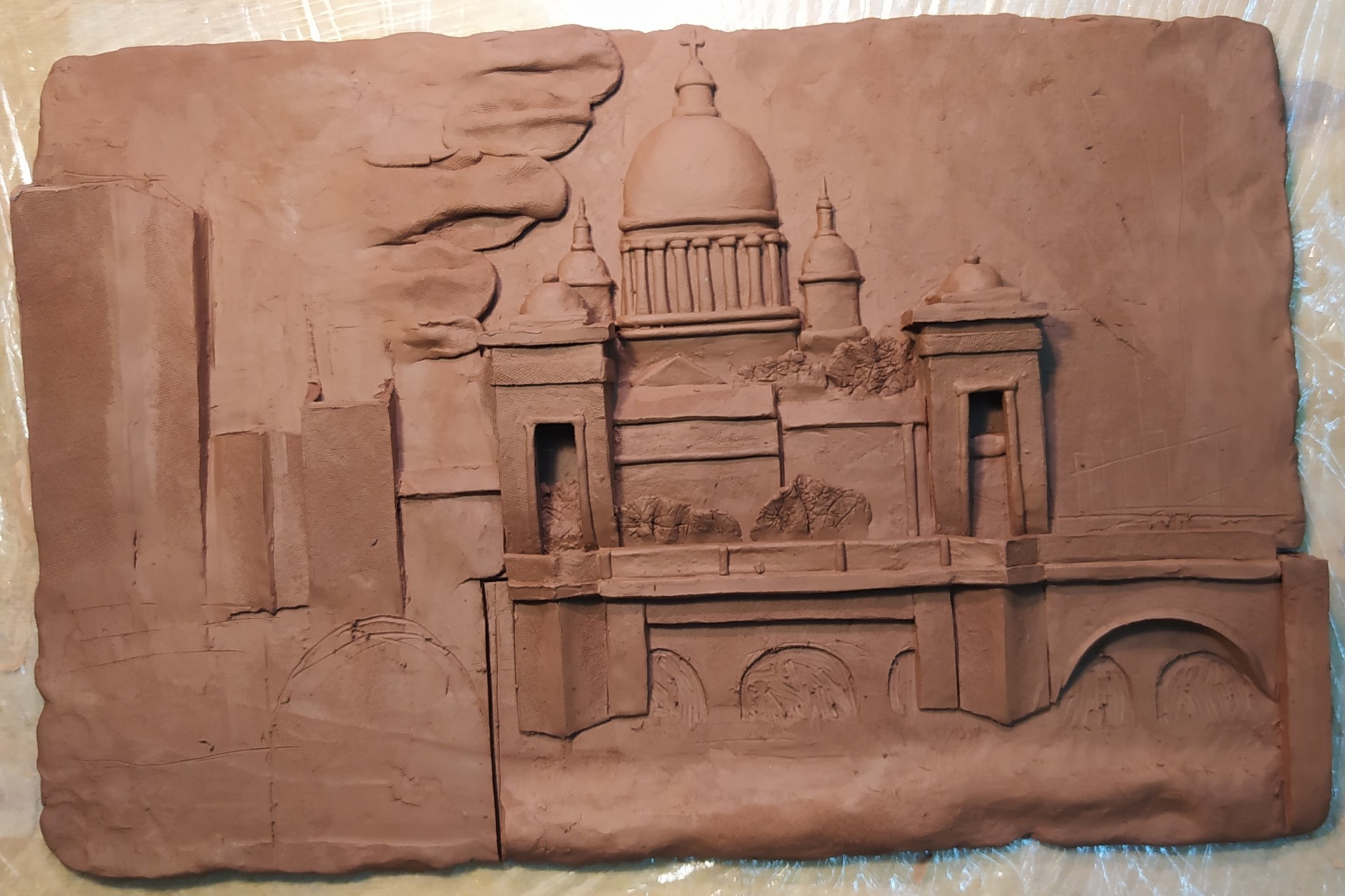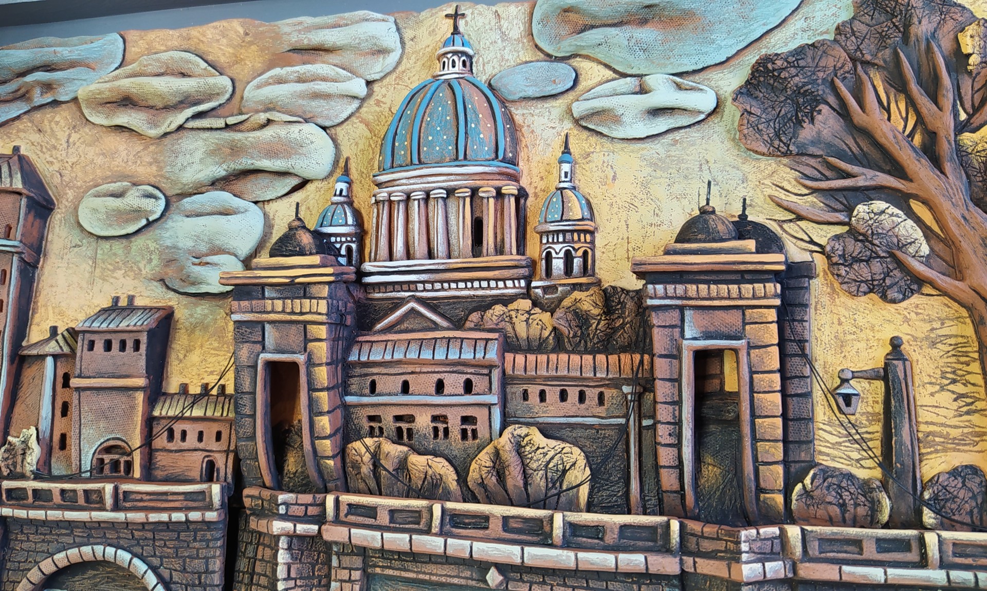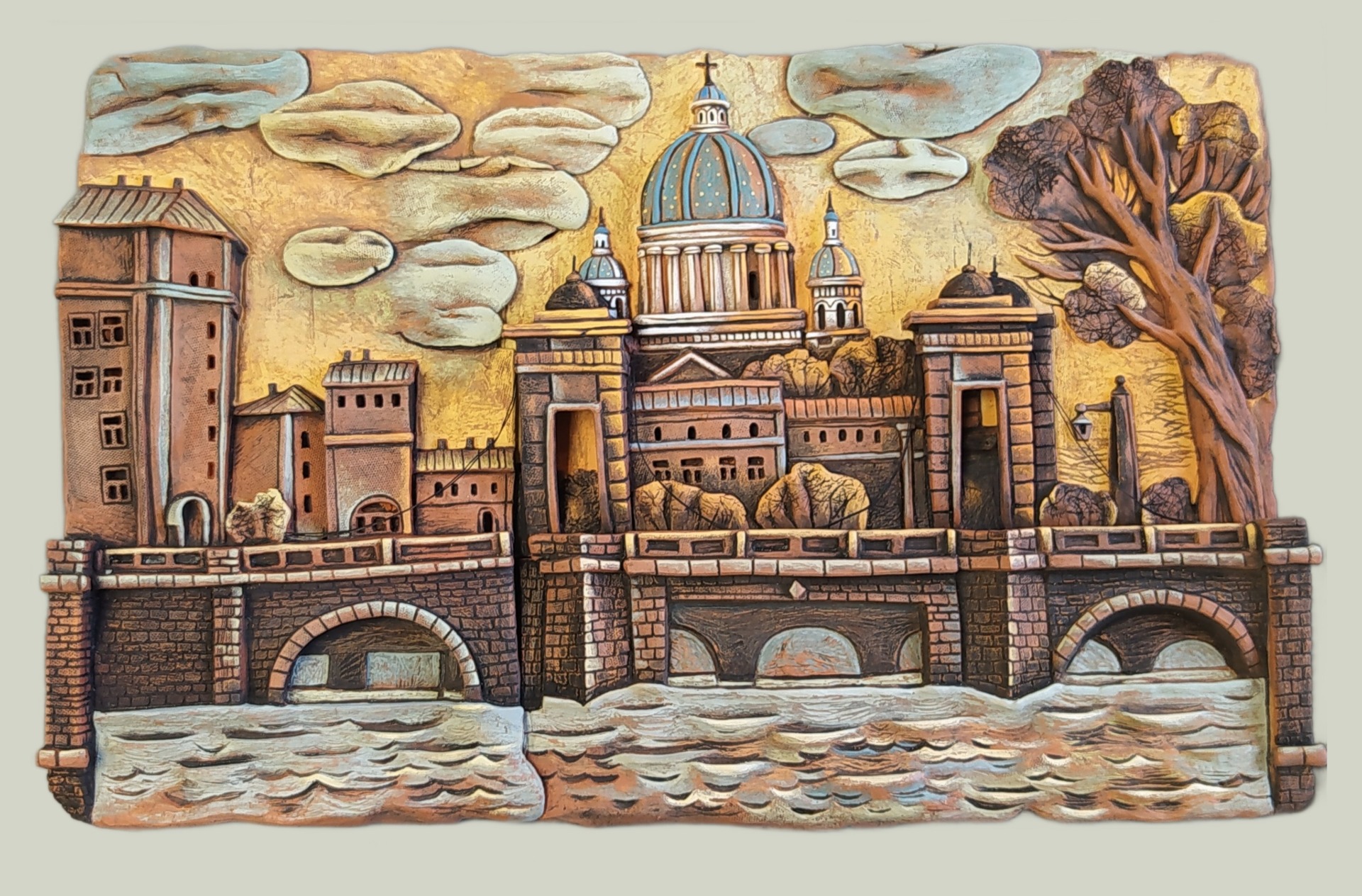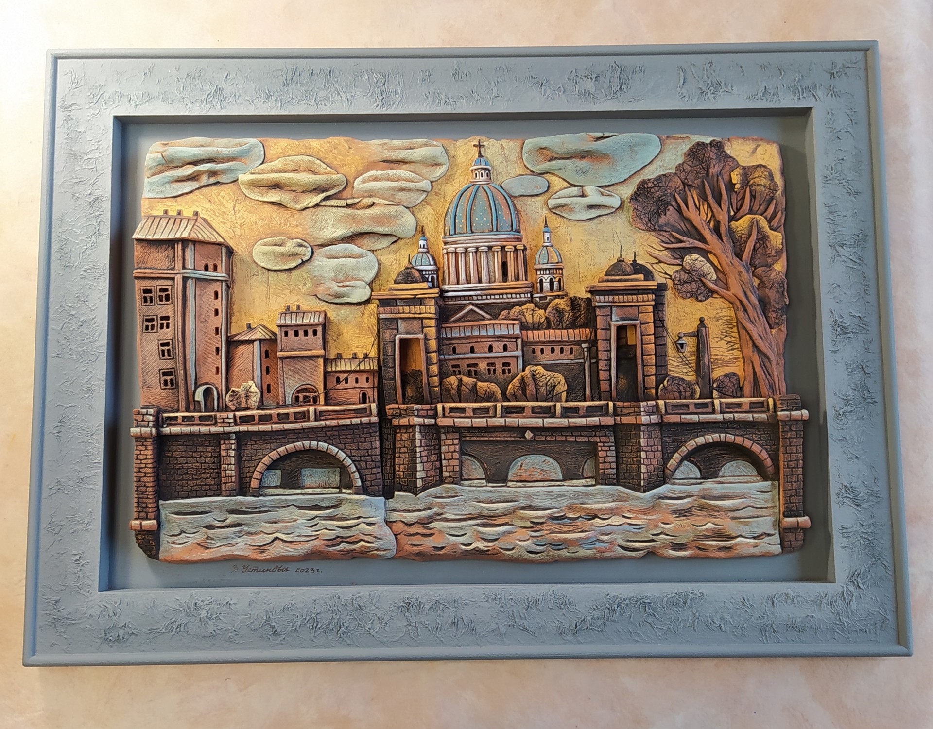 Керамическое панно , выполненное в авторской технике, работа объемная, рельеф, наклеена на основу, являющуюся частью композиции и неотделимая от них также как и обрамление. Изготовлено из гжельской глины методом ручной лепки тонких пластов, что уменьшает их массу, с последующими обжигами в муфельных печах разной мощности и ручной росписью. Техника исполнения не имеет аналогов и имеет большую художественную ценность. Работы автора размещались в музеях и галереях, являются практически вечными, так как не выцветают на солнце, могут подвергаться влажной уборке.