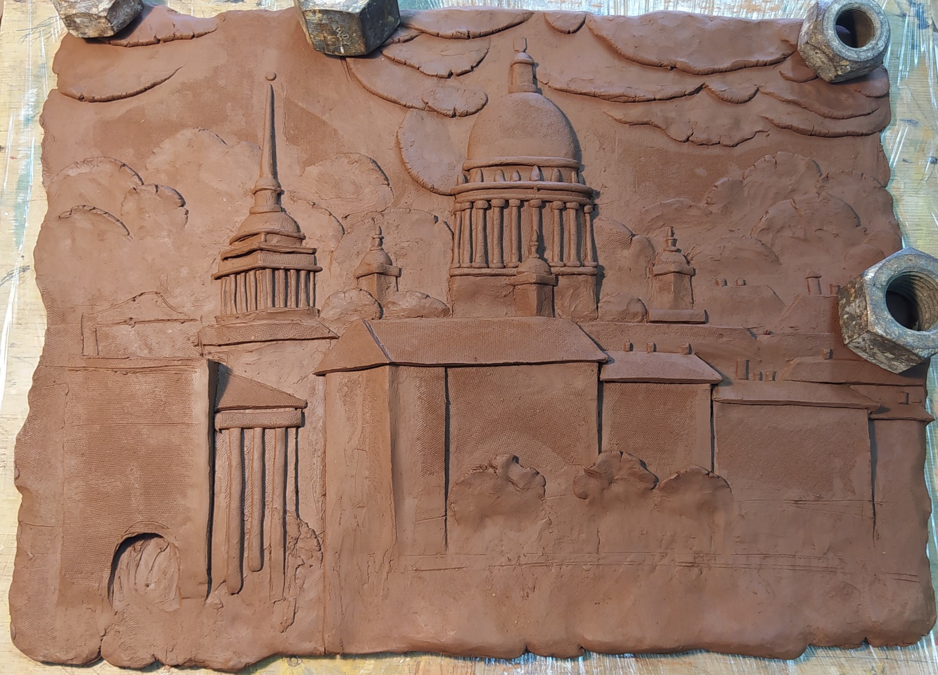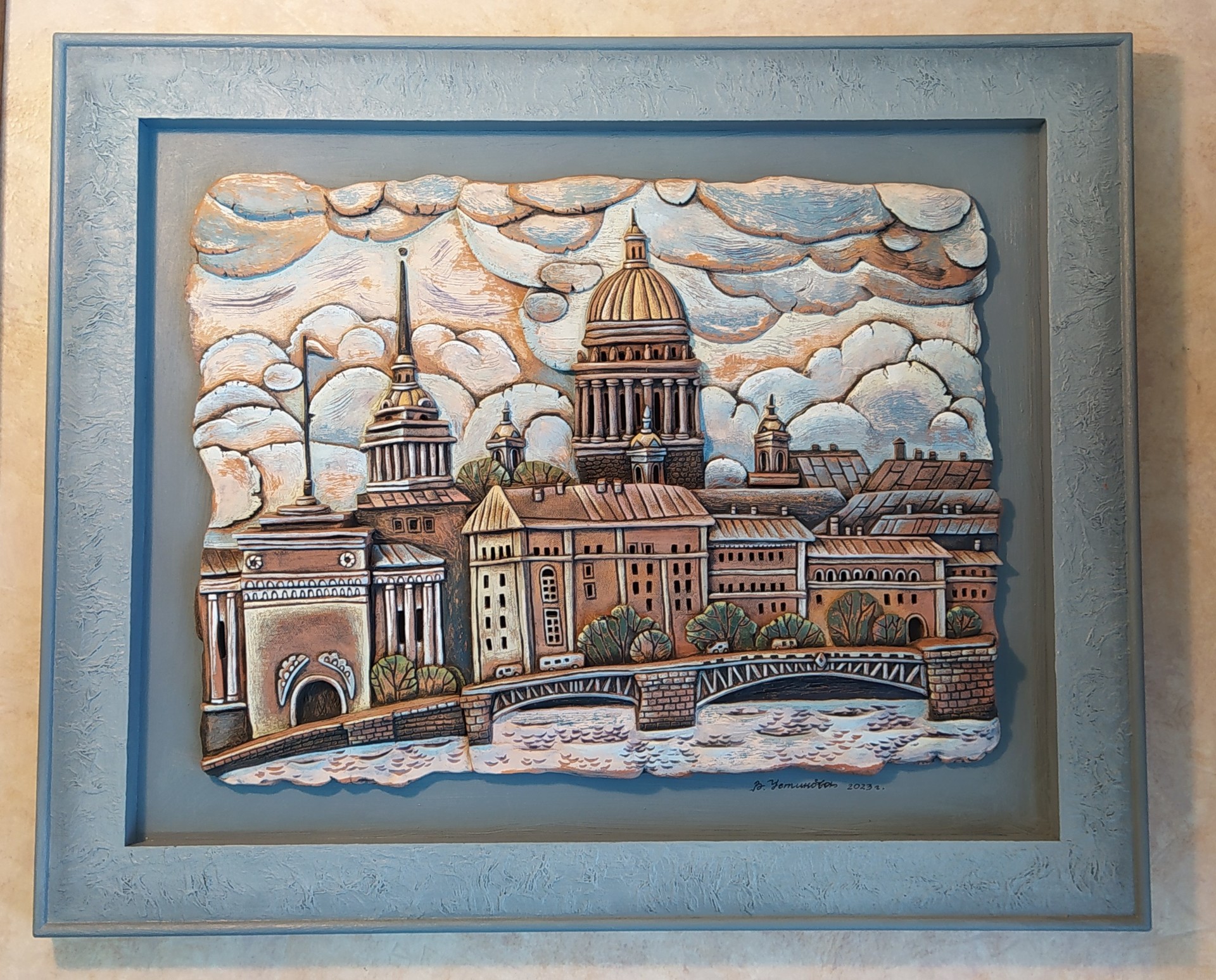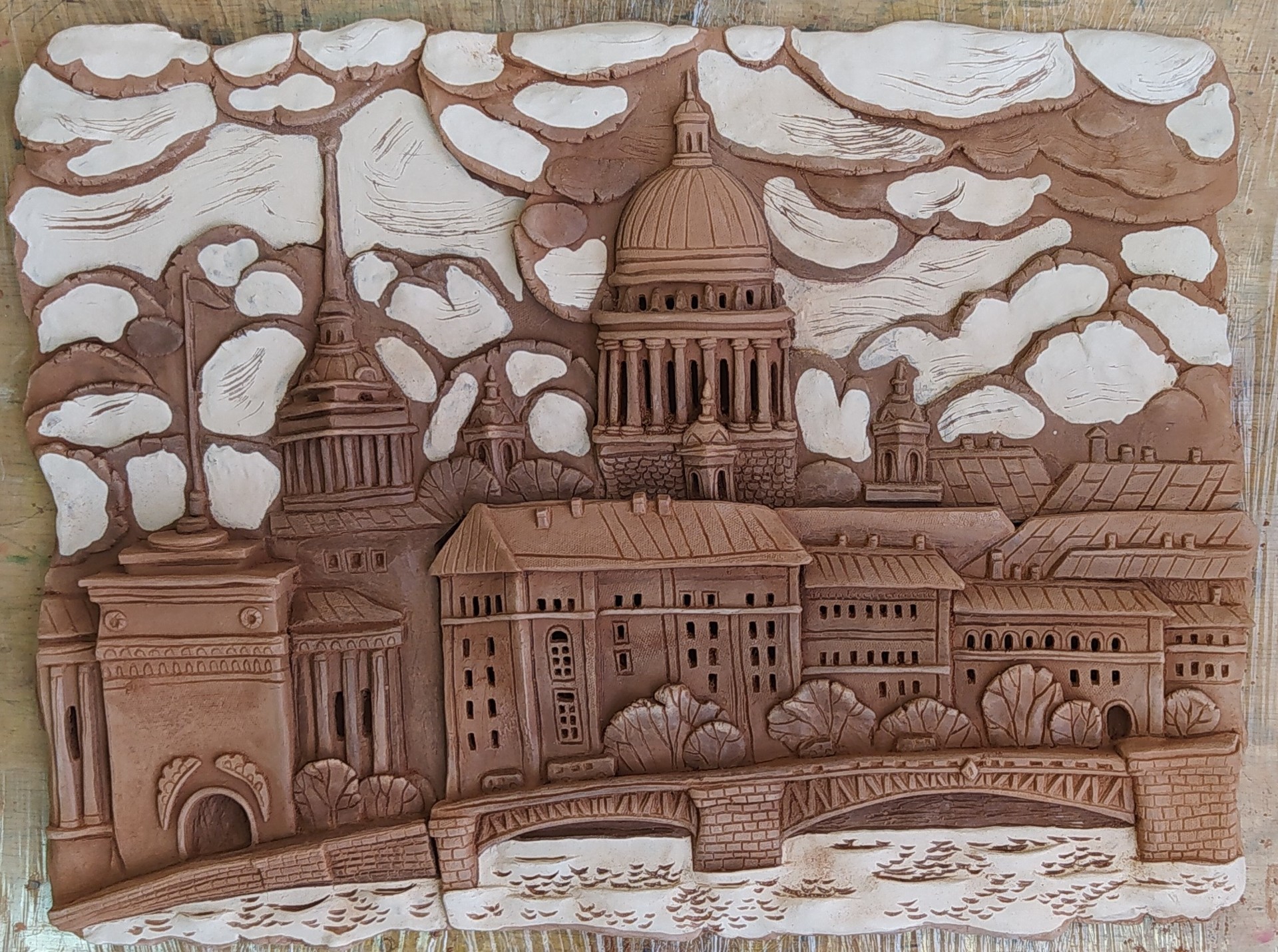 Керамическое панно , выполненное в авторской технике, работа объемная, рельеф, наклеена на основу, являющуюся частью композиции и неотделимая от них также как и обрамление. Изготовлена из гжельской глины методом ручной лепки тонких пластов, что уменьшает их массу, с последующими обжигами в муфельных печах разной мощности и ручной росписью. Техника исполнения не имеет аналогов и имеет большую художественную ценность. Работы автора размещались в музеях и галереях, являются практически вечными, так как не выцветают на солнце, могут подвергаться влажной уборке.
