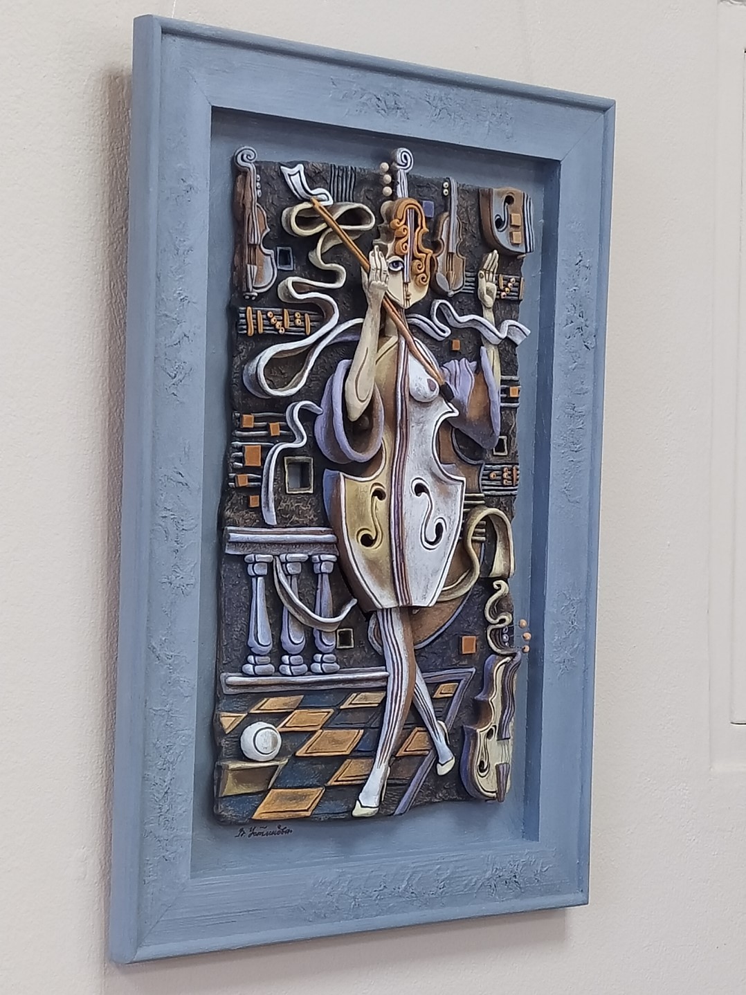 Модернизм. Керамическое панно , выполненное в авторской технике, работа объемная, рельеф, наклеена на основу, являющуюся частью композиции и неотделимая от них также как и обрамление. Изготовлено из кембрийской глины методом ручной лепки тонких пластов, что уменьшает их массу, с последующими обжигами в муфельных печах разной мощности и ручной росписью. Техника исполнения не имеет аналогов и имеет большую художественную ценность. Работы автора размещались в музеях и галереях, являются практически вечными, так как не выцветают на солнце, могут подвергаться влажной уборке. Лепка выполнена в 2015 году, роспись в 2023 г.