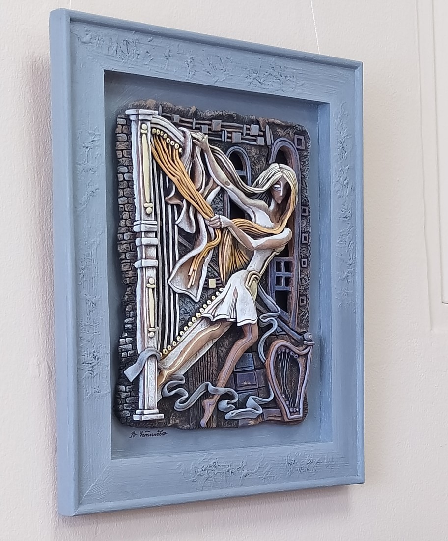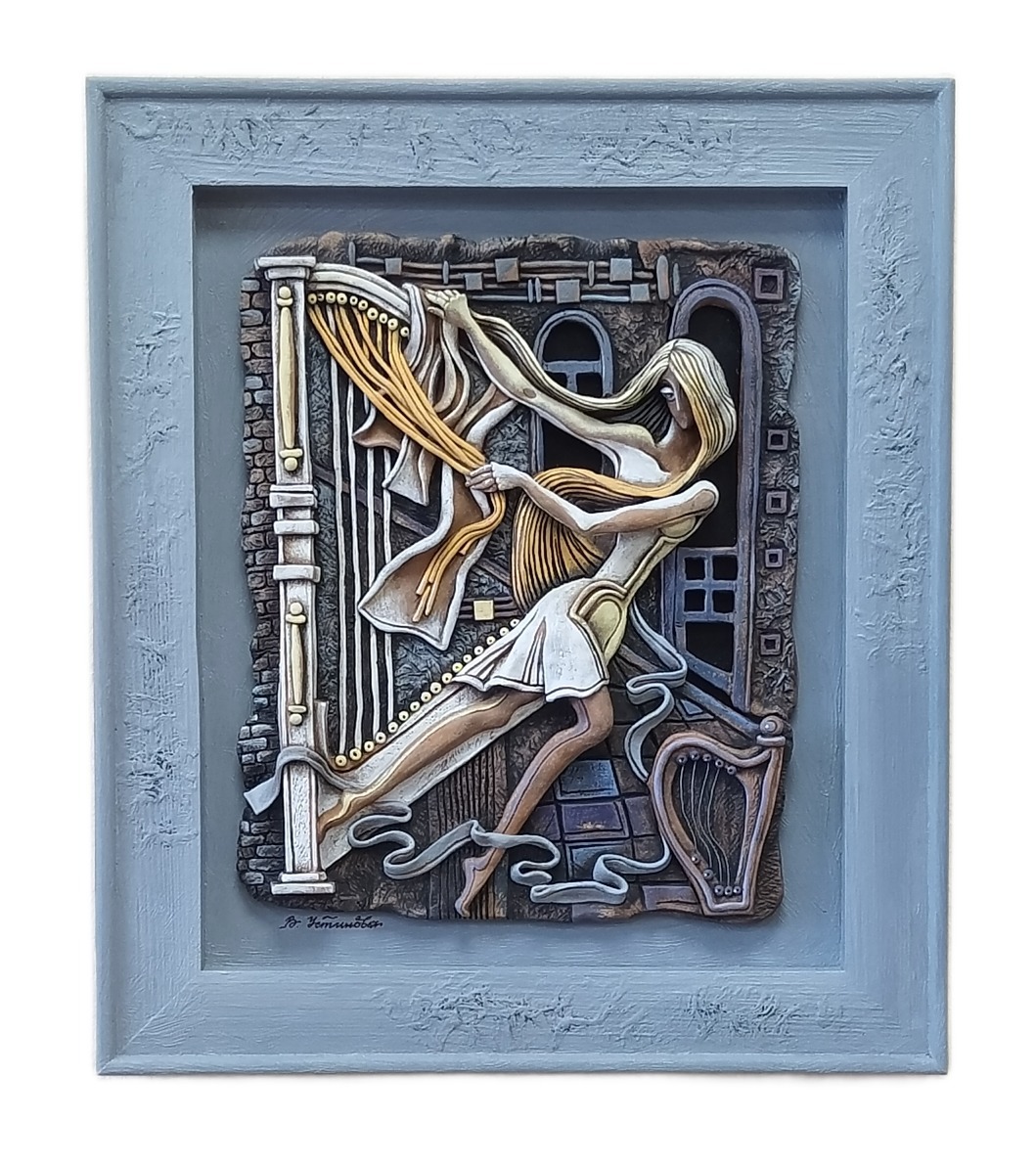 Керамическое панно , выполненное в авторской технике, работа объемная, рельеф, наклеена на основу, являющуюся частью композиции и неотделимая от них также как и обрамление. Изготовлено из кембрийской глины методом ручной лепки тонких пластов, что уменьшает их массу, с последующими обжигами в муфельных печах разной мощности и ручной росписью. Техника исполнения не имеет аналогов и имеет большую художественную ценность. Работы автора размещались в музеях и галереях, являются практически вечными, так как не выцветают на солнце, могут подвергаться влажной уборке. Лепка выполнена в 2015 году, роспись в 2023 г.