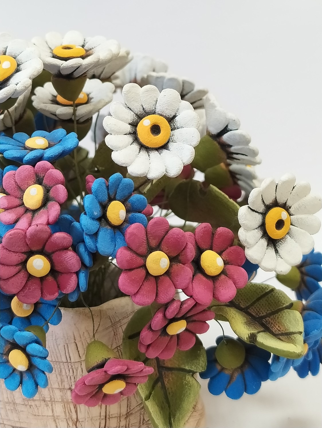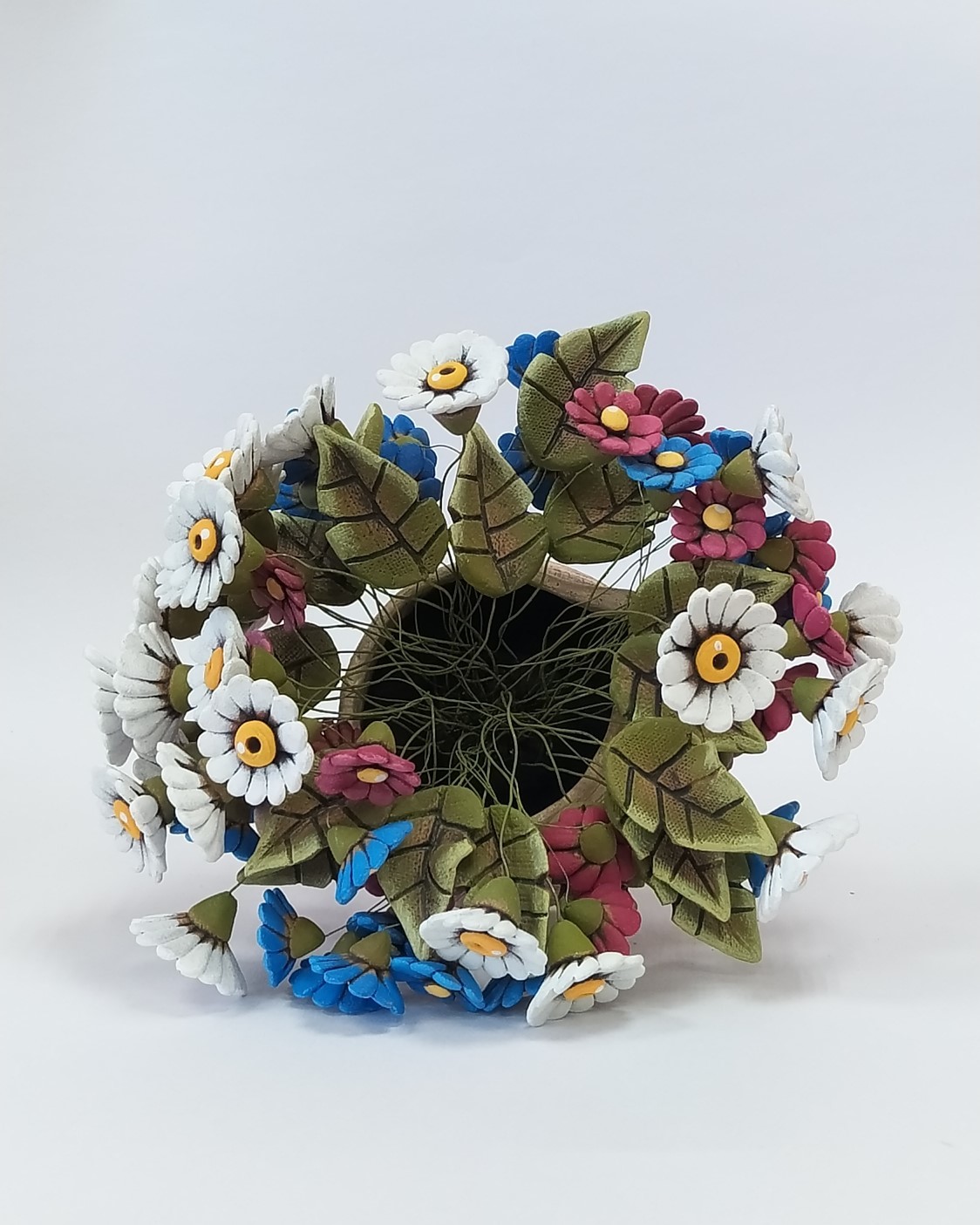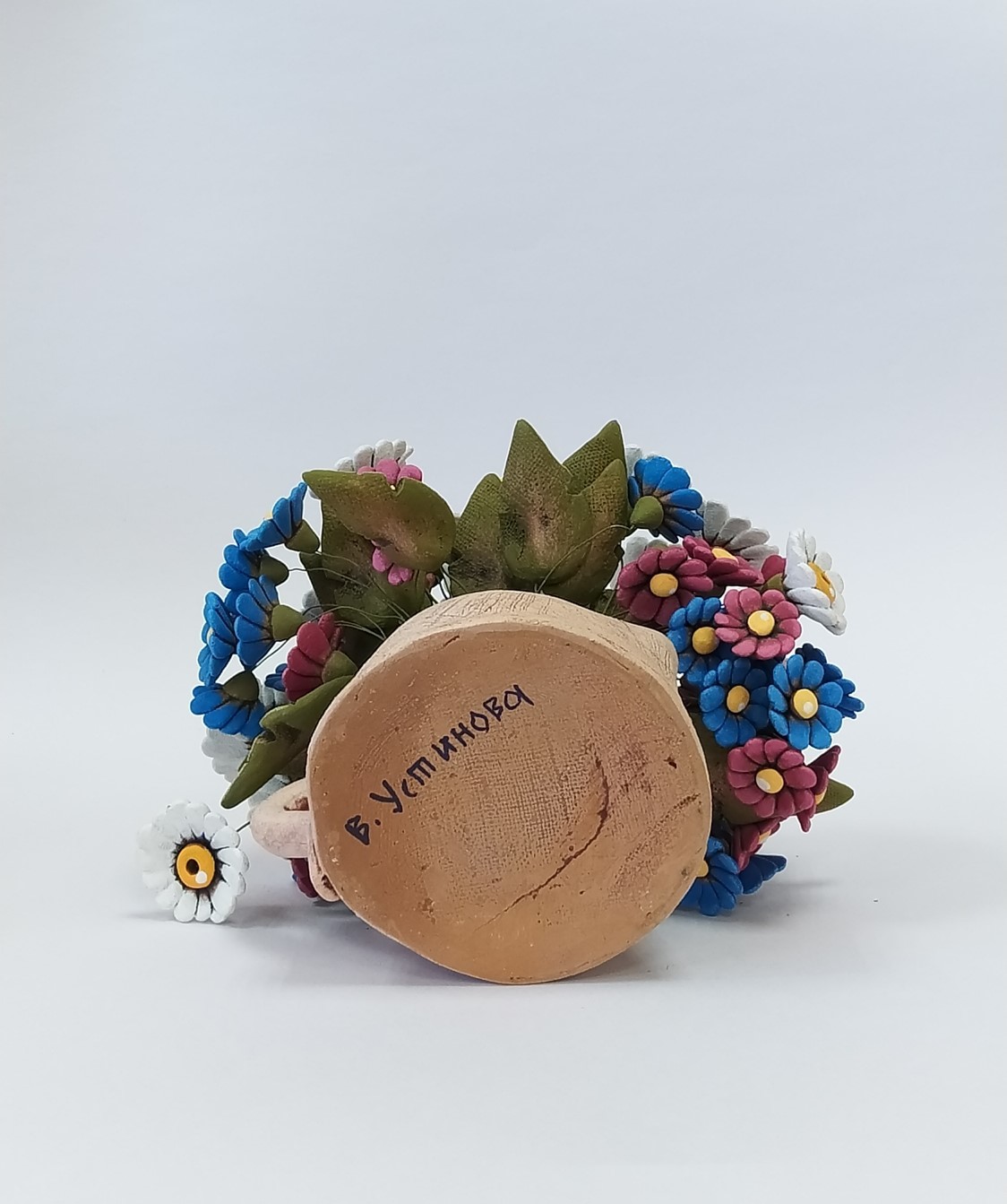Керамическая подвижная цветочная композиция, выполненная в авторской технике Изготовлен из кембрийской глины методом ручной лепки каждого элемента(лепестки, цветы, листья, сосуд) , с последующими обжигами в муфельных печах разной мощности и ручной росписи. Техника исполнения не имеет аналогов и имеет большую художественную ценность. Работы автора размещались в музеях и галереях, являются практически вечными, так как не выцветают на солнце, могут подвергаться влажной уборке. Лепка выполнена в 2020 г.