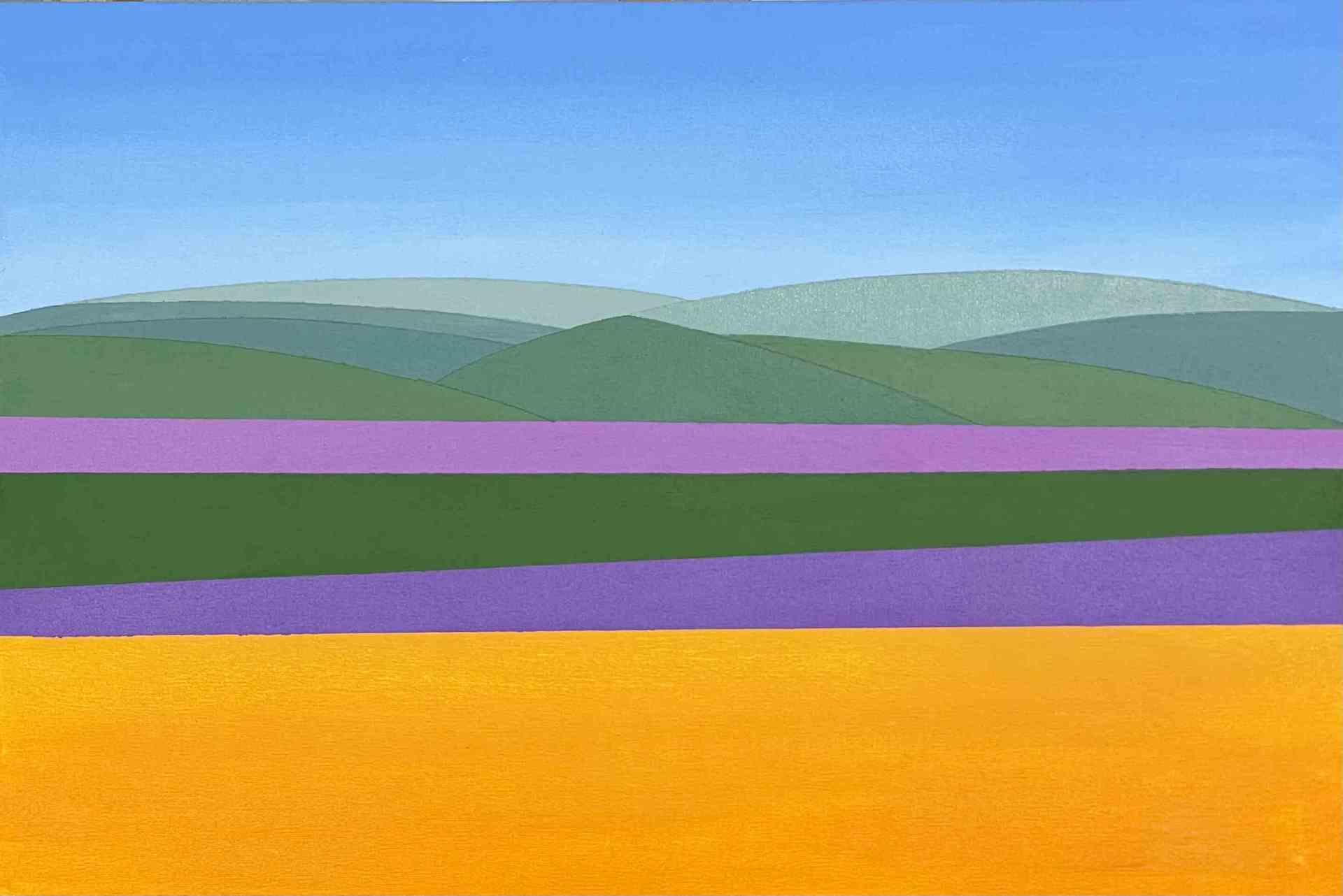 Можно считать это произведением геометрического абстракционизма, потому что картине есть только геометрические линии, и окружности холмов - идеальные дуги как части окружностей. Холст лён мелкозернистый Россия, галерейная натяжка холста, изображение продолжено на гранях картины. Смонтирована профессиональная повеска на тросе.
