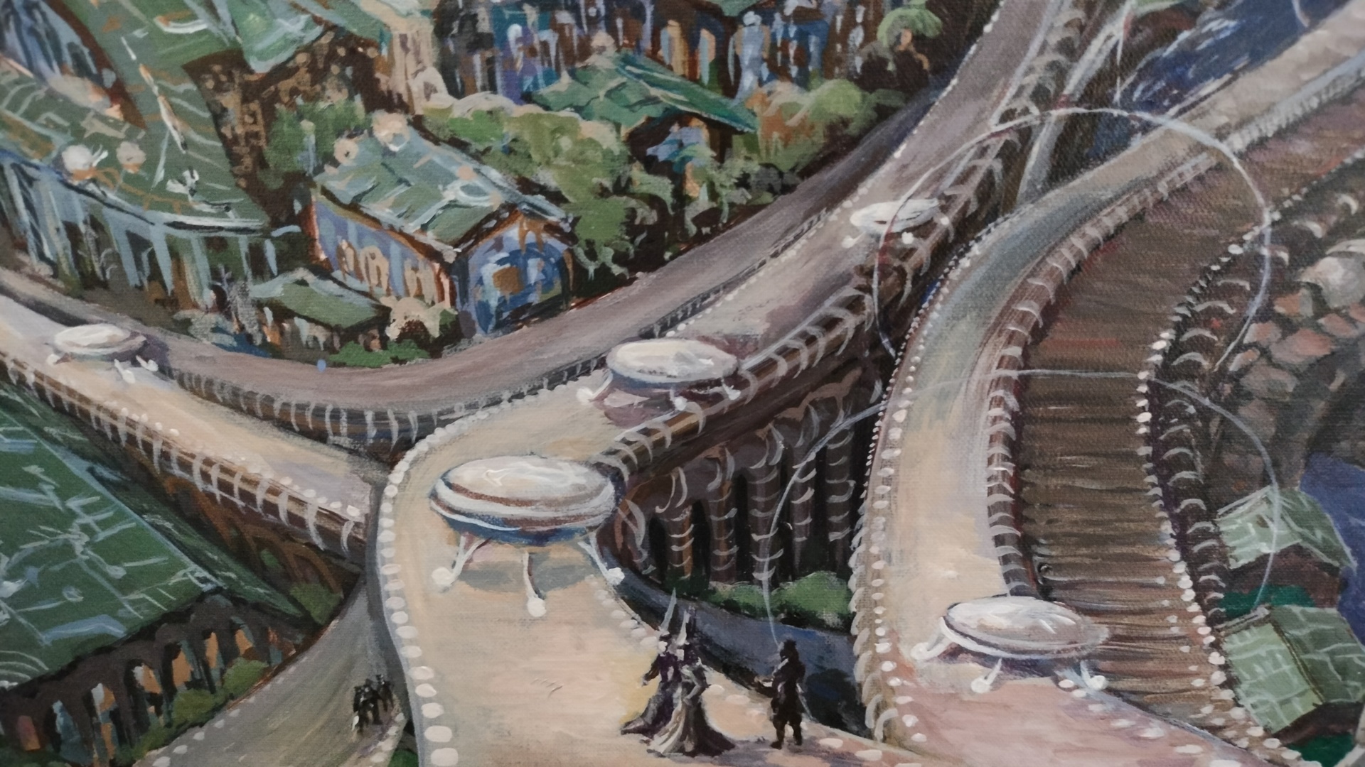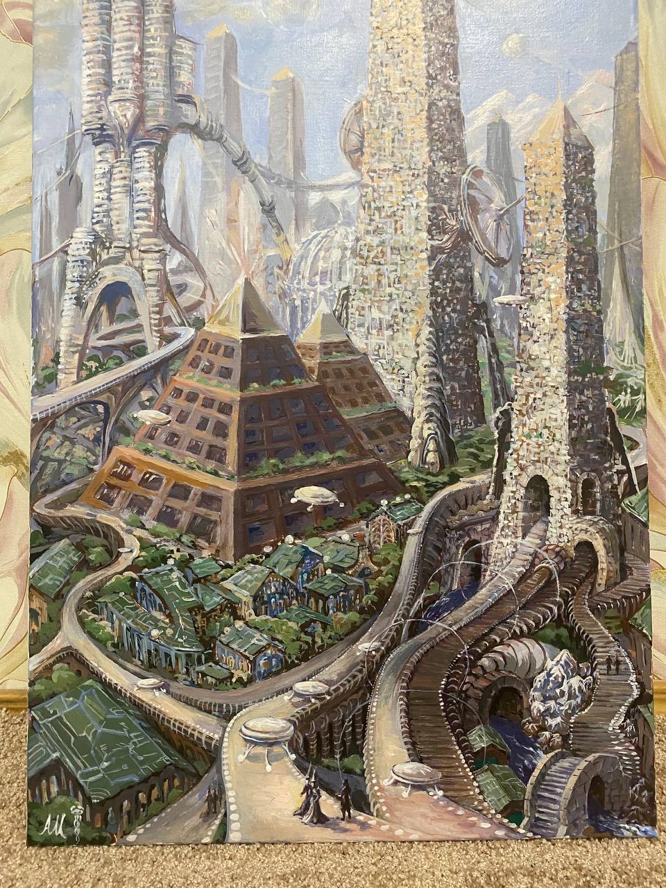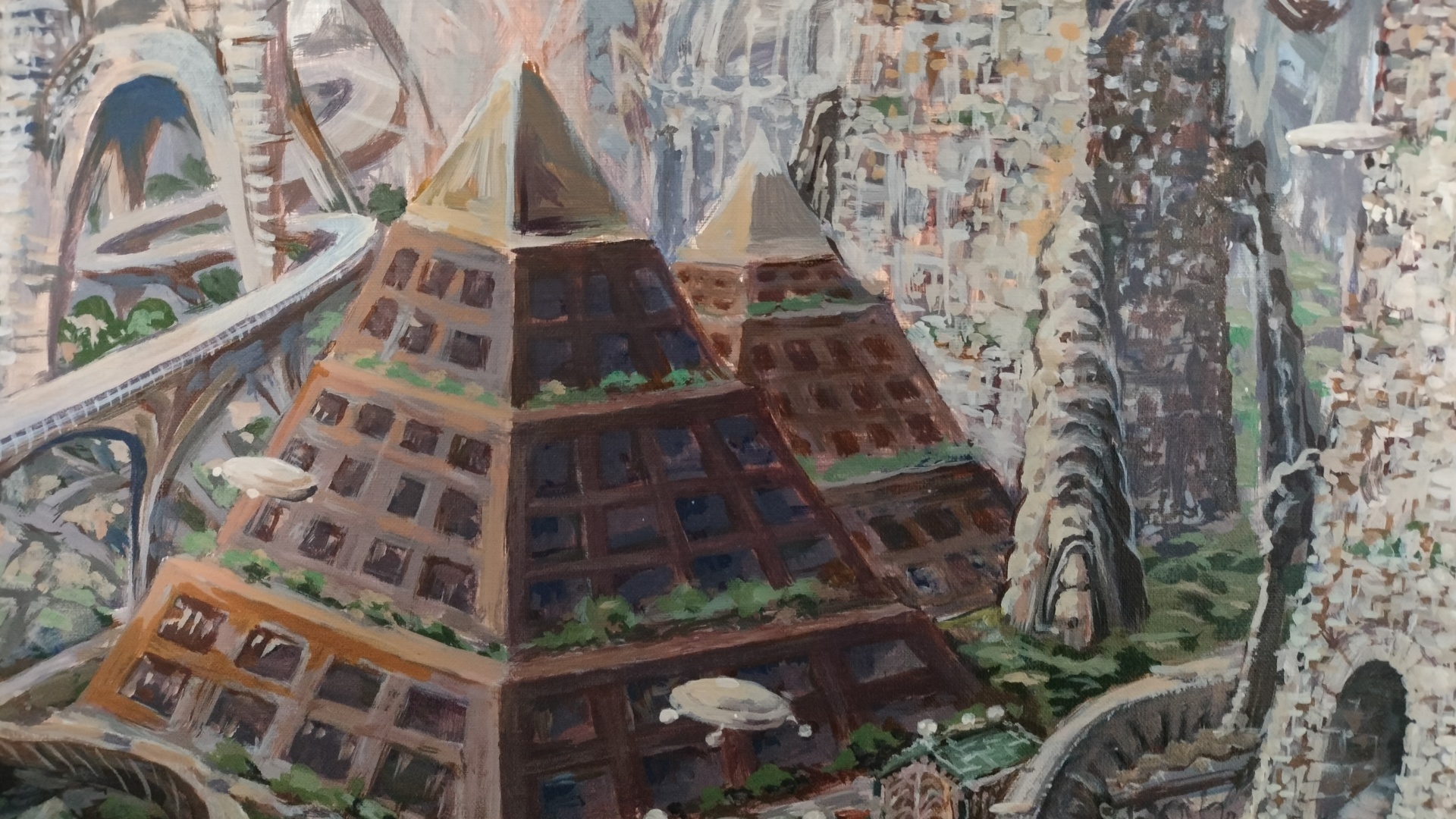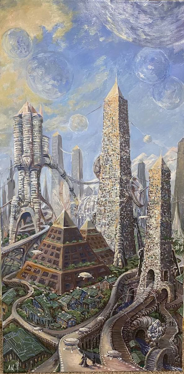 Картина «Город Атлантов» Картина изображает один из городов Атлантиды в период расцвета этой цивилизации. Базовой настройкой для её написания послужил семинар Магистра ТА "Атлантида"«Сефиротическая магия как прикладная наука», где он описывает цивилизацию Атлантов и внешний вид их городов. Ещё сюда добавилось участие в эзотерическом проекте «Зета», там взаимодействие с Атлантидой произошло в процессе работы с верхним подключением (Сахасрара чакра). Также я, как автор, использовал здесь фрагменты собственных снов, что не исключает контактов с параллельной веткой реальности, где Атлантида продолжает существовать. В центре города нарисованы пирамиды (место нахождения Мага управляющего территорией), живые дома (лепящиеся вокруг пирамид) , высотные башни инженерно-технического назначения, башни защитного назначения, всевозможные коммуникации, транспортные магистрали, летательные аппараты и сами ассуры. Картина помогает нарабатывать высокочастотную позицию точки сборки. Это настройка на развитие монады, эволюцию, прогрессорство, сборку личности, посредством активации древних союзников. Таким образом это содействует развитию магических способностей, возможности воздействовать на мир и двигаться к исполнению своих намерений.