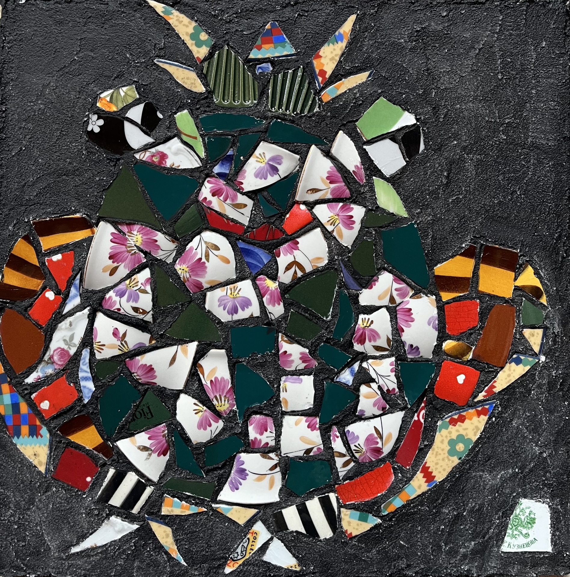 Серия "Небылицы". Декоративное настенное панно, оформлено в раму. Работа сделана в технике "ломаной" мозаики ("тренкадис") из кусочков разбитой посуды.